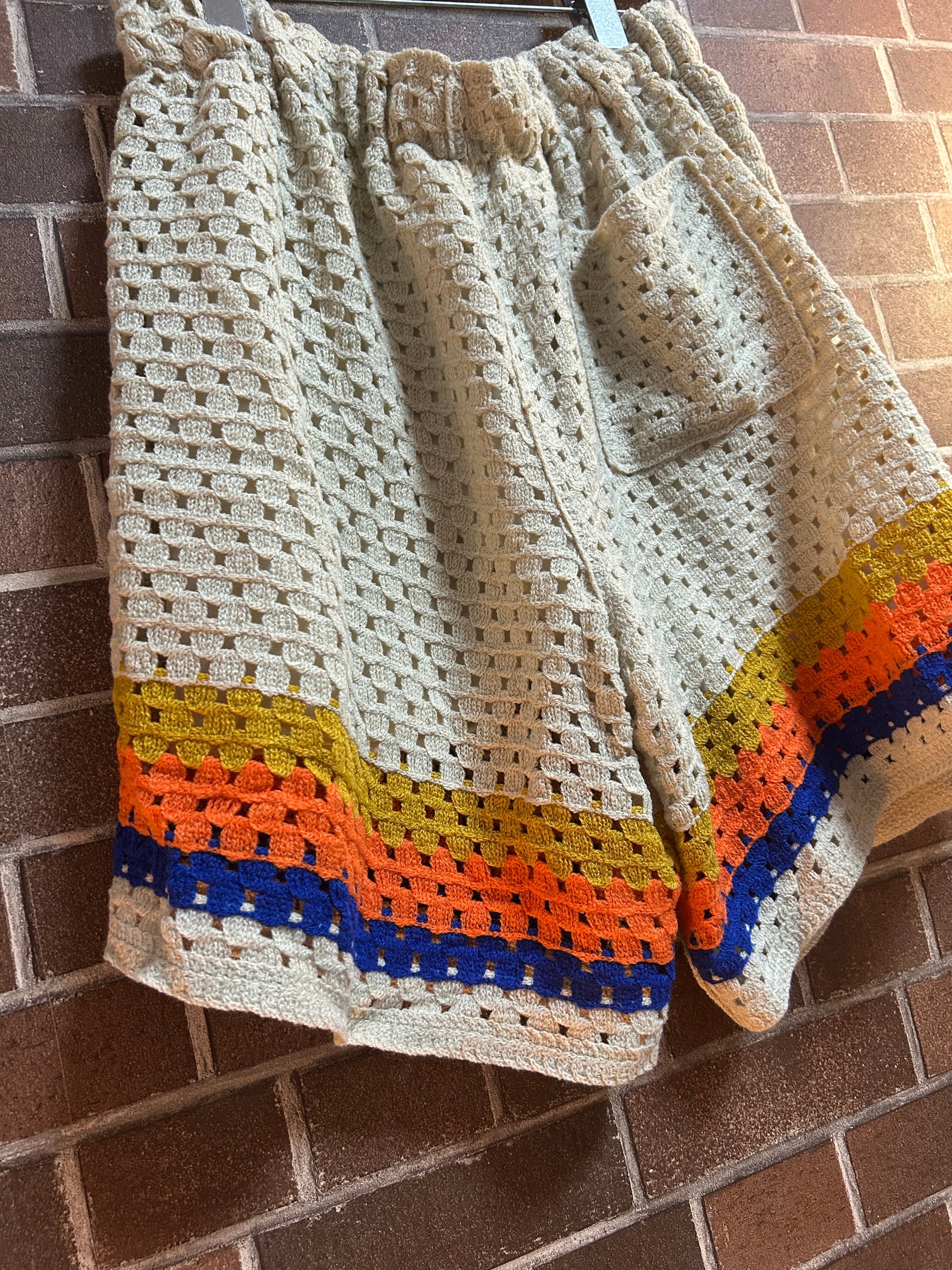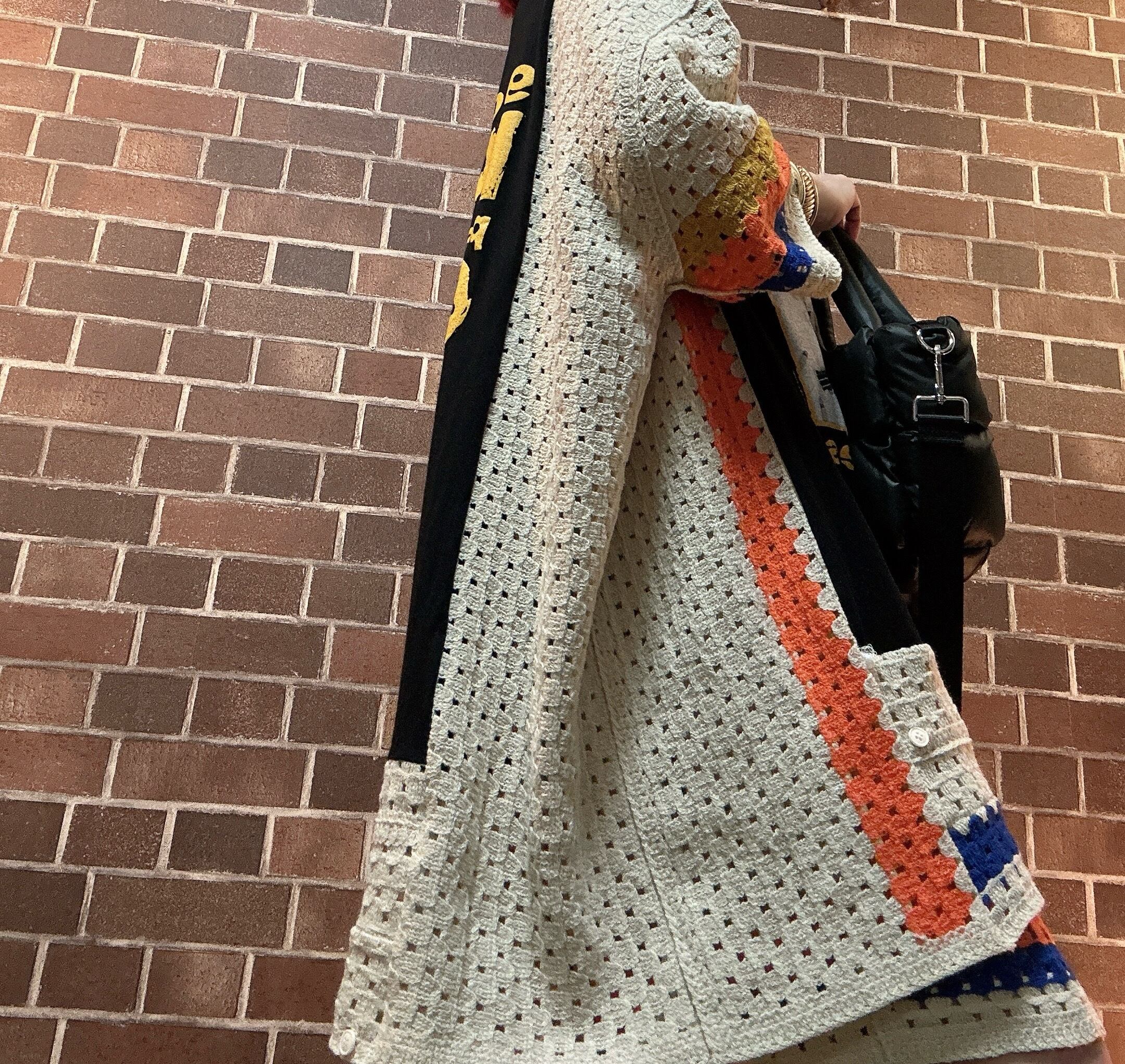 発泡プリントのバンドTシャツと鍵編みニットをドッキングしたリメイクのセットアップです。
