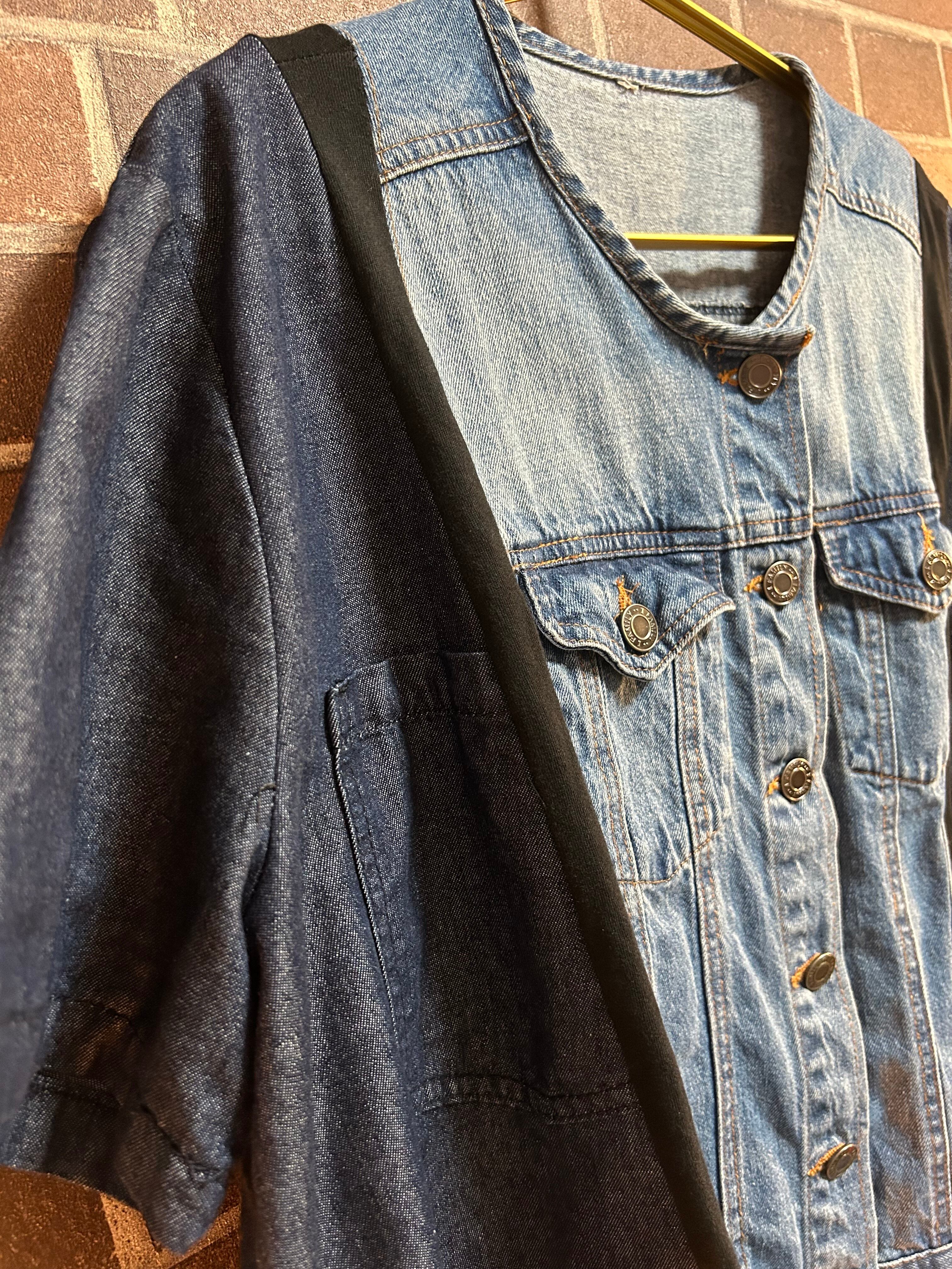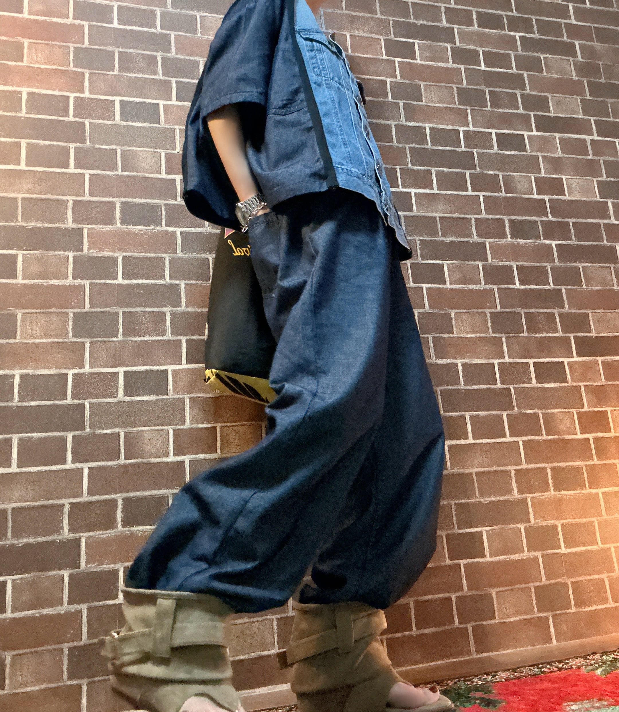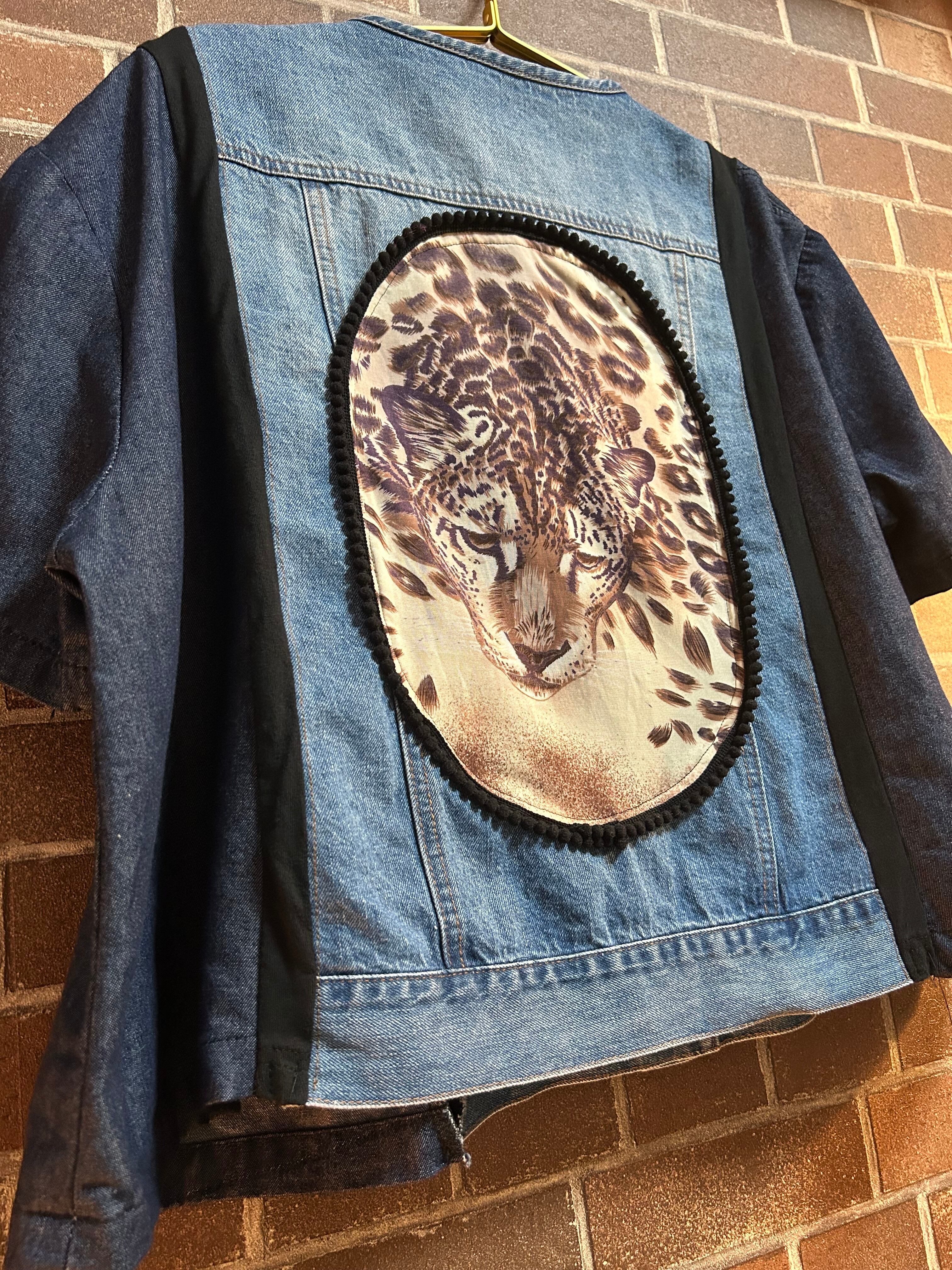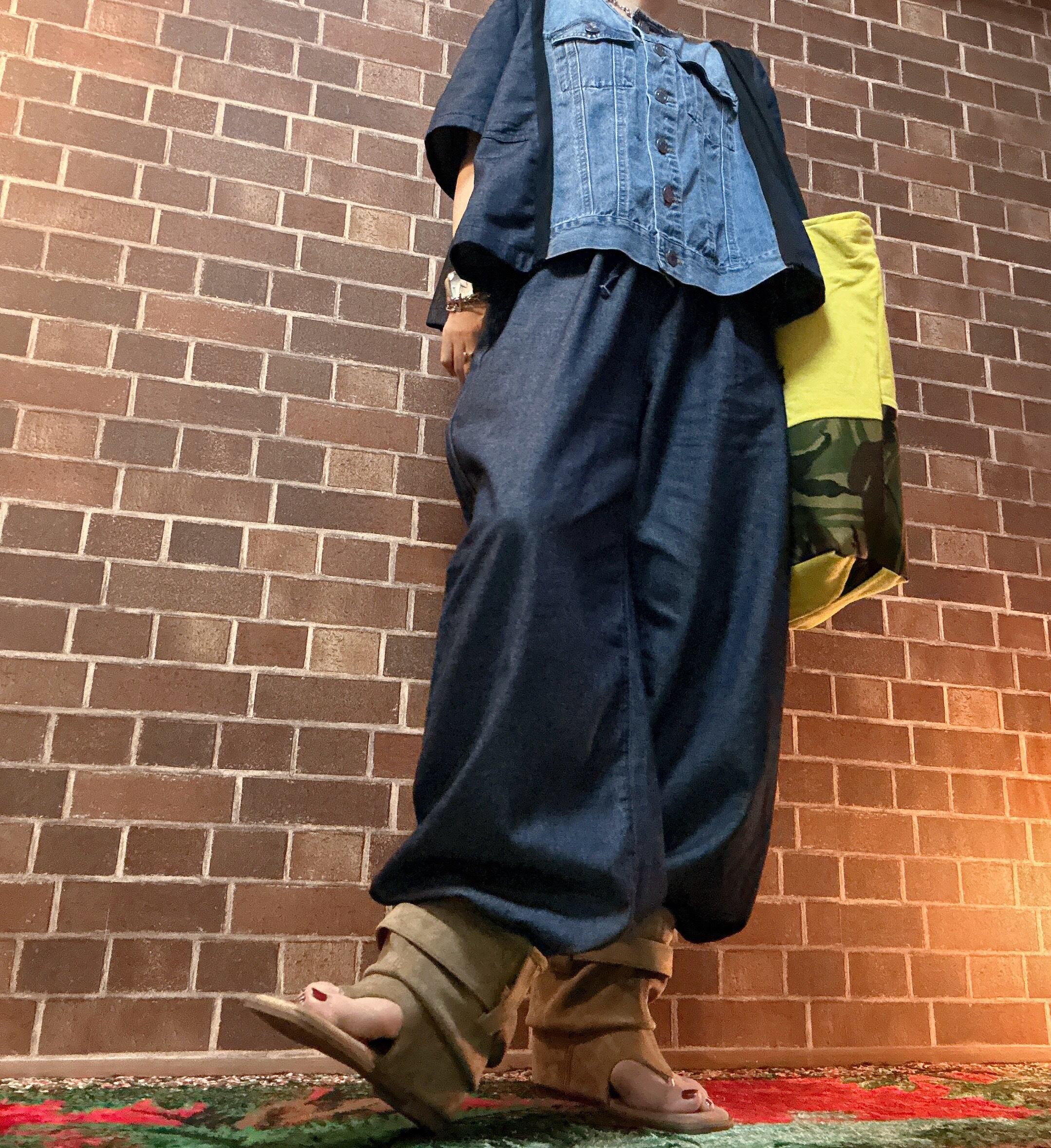 背中にタイガーをパッチワークしたリメイクの薄いデニムのセットアップです。