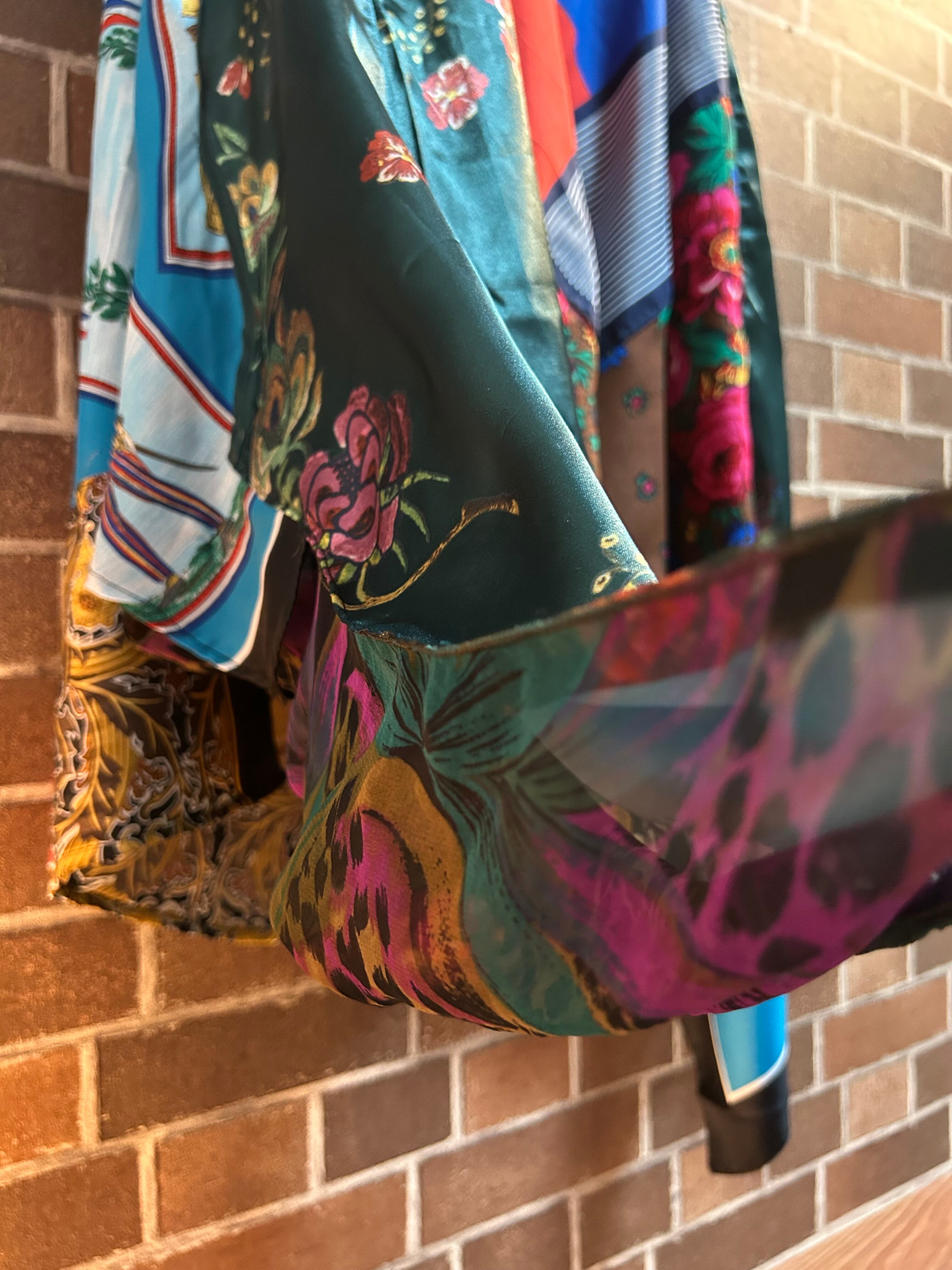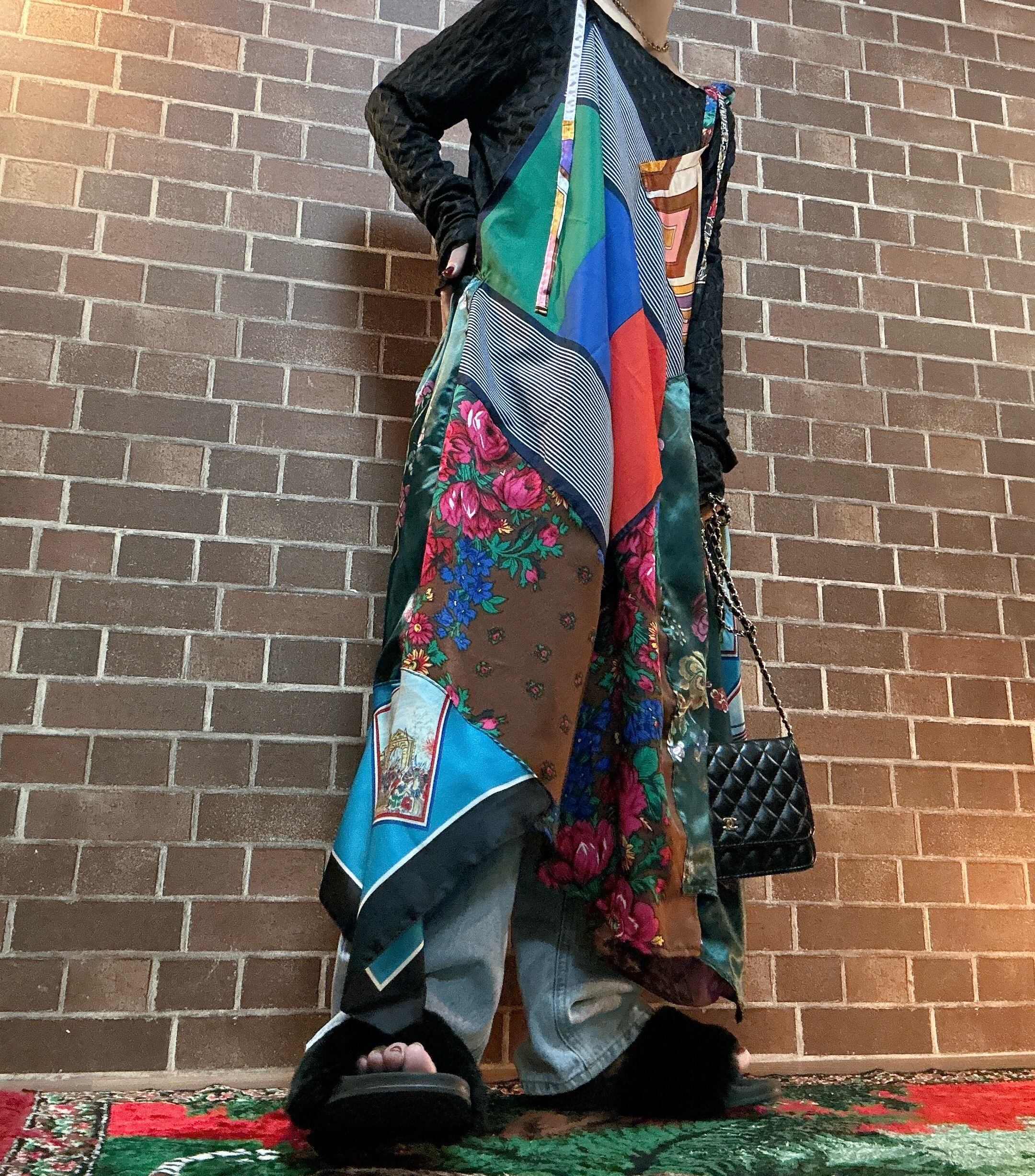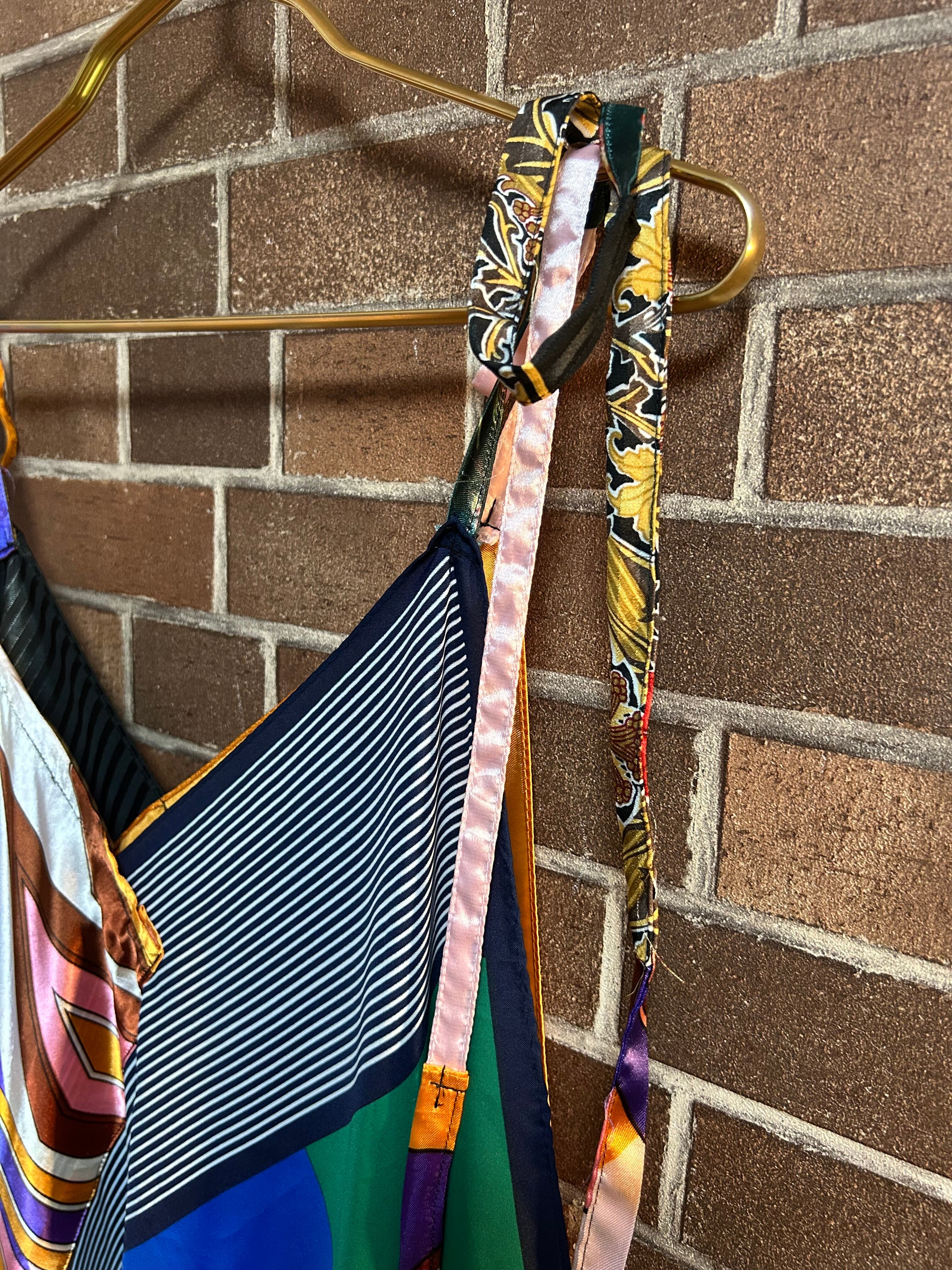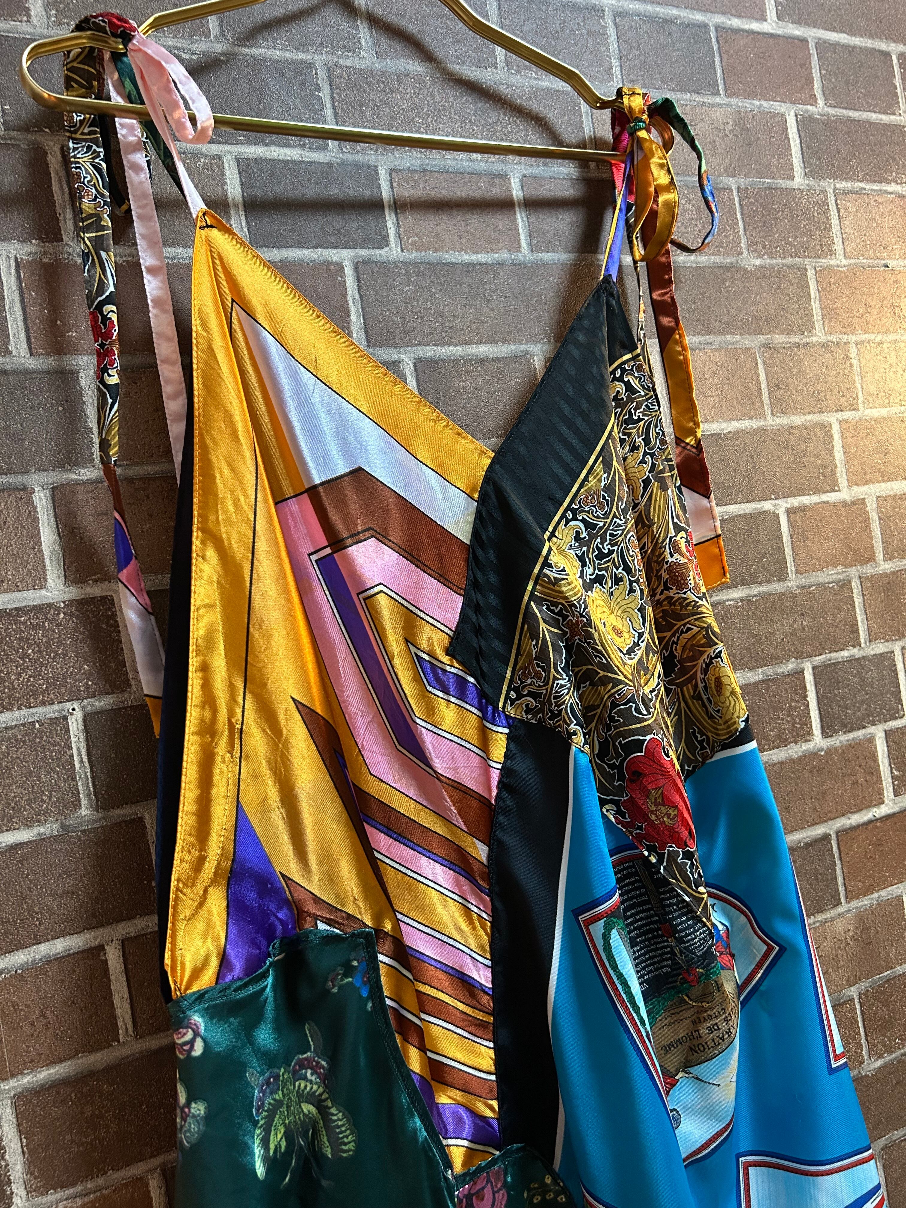 古着スカーフを使用して制作したリメイクのパッチワークアシメキャミソールです。
