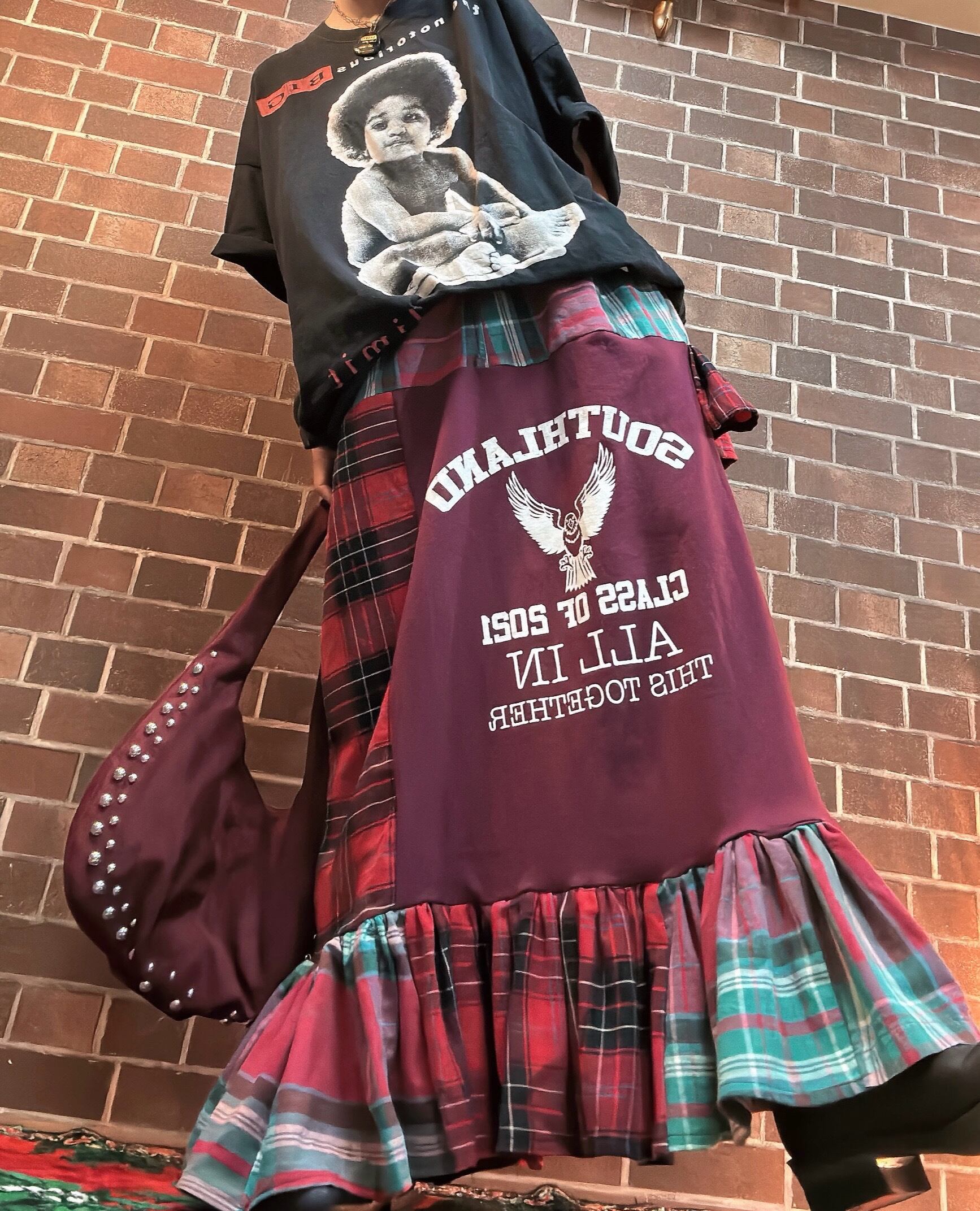古着を使用して制作したパッチワークのフリルスカートです⭐︎
