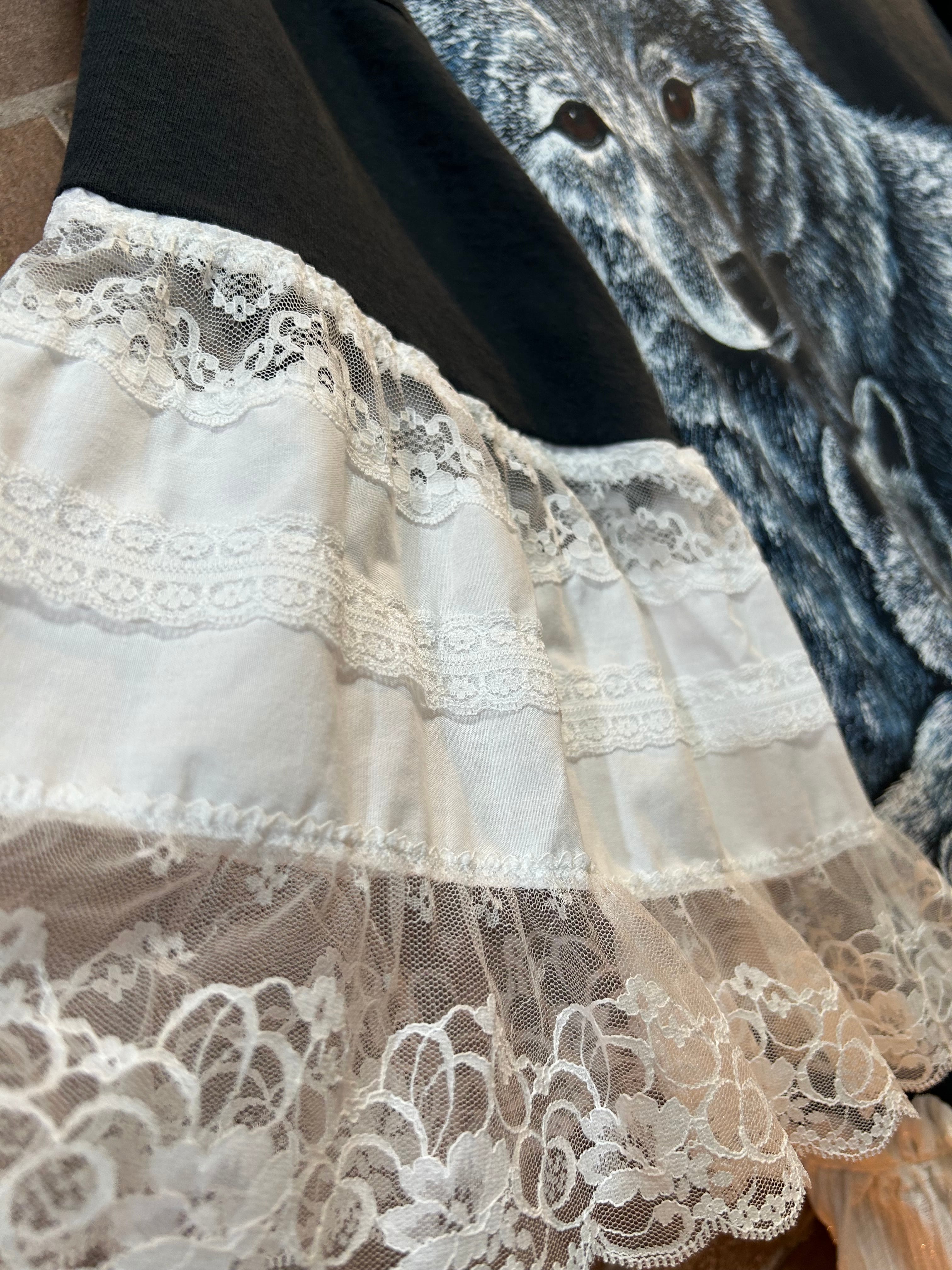 US古着のアニマルTシャツとフリルを使用して制作したリメイクのトップスです⭐︎
