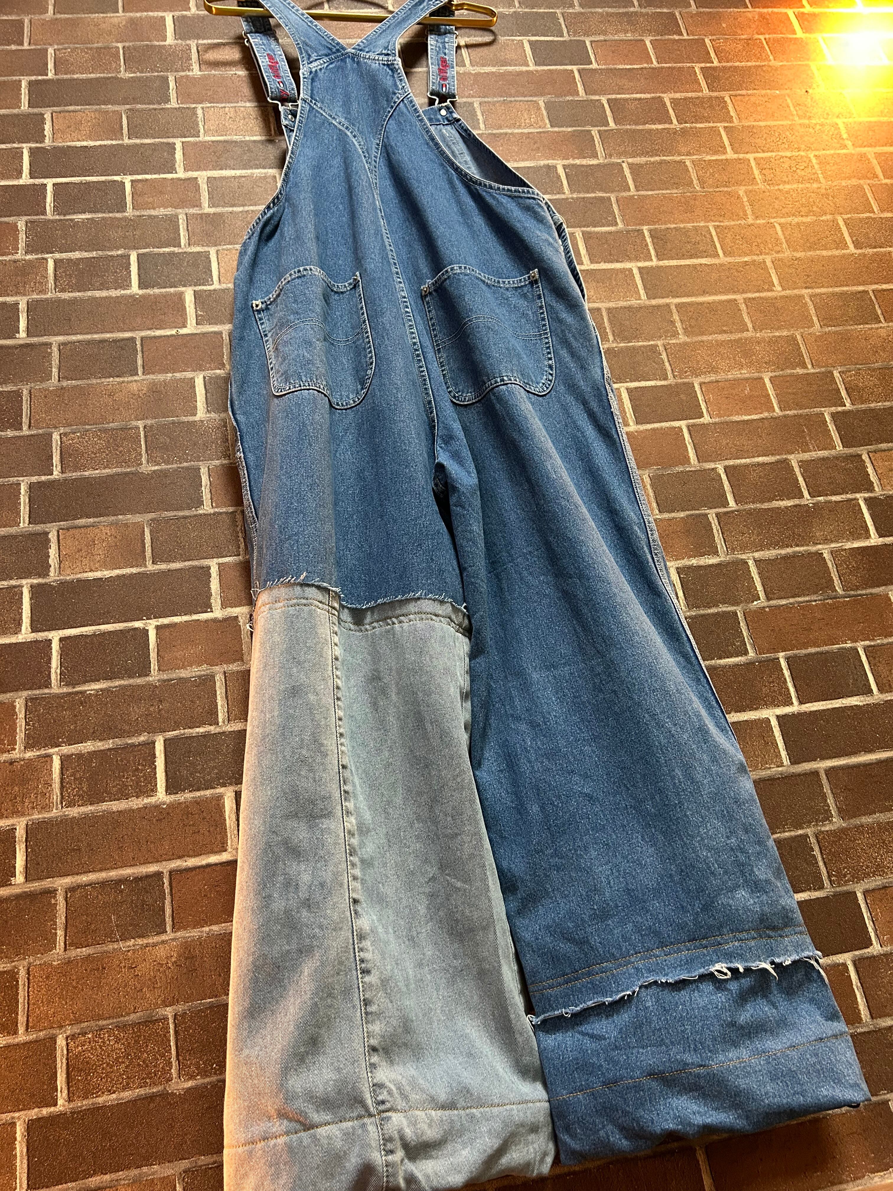 海外古着のデニムオーバーオールを使用して制作したリメイクのパッチワークオーバーオールです⭐︎