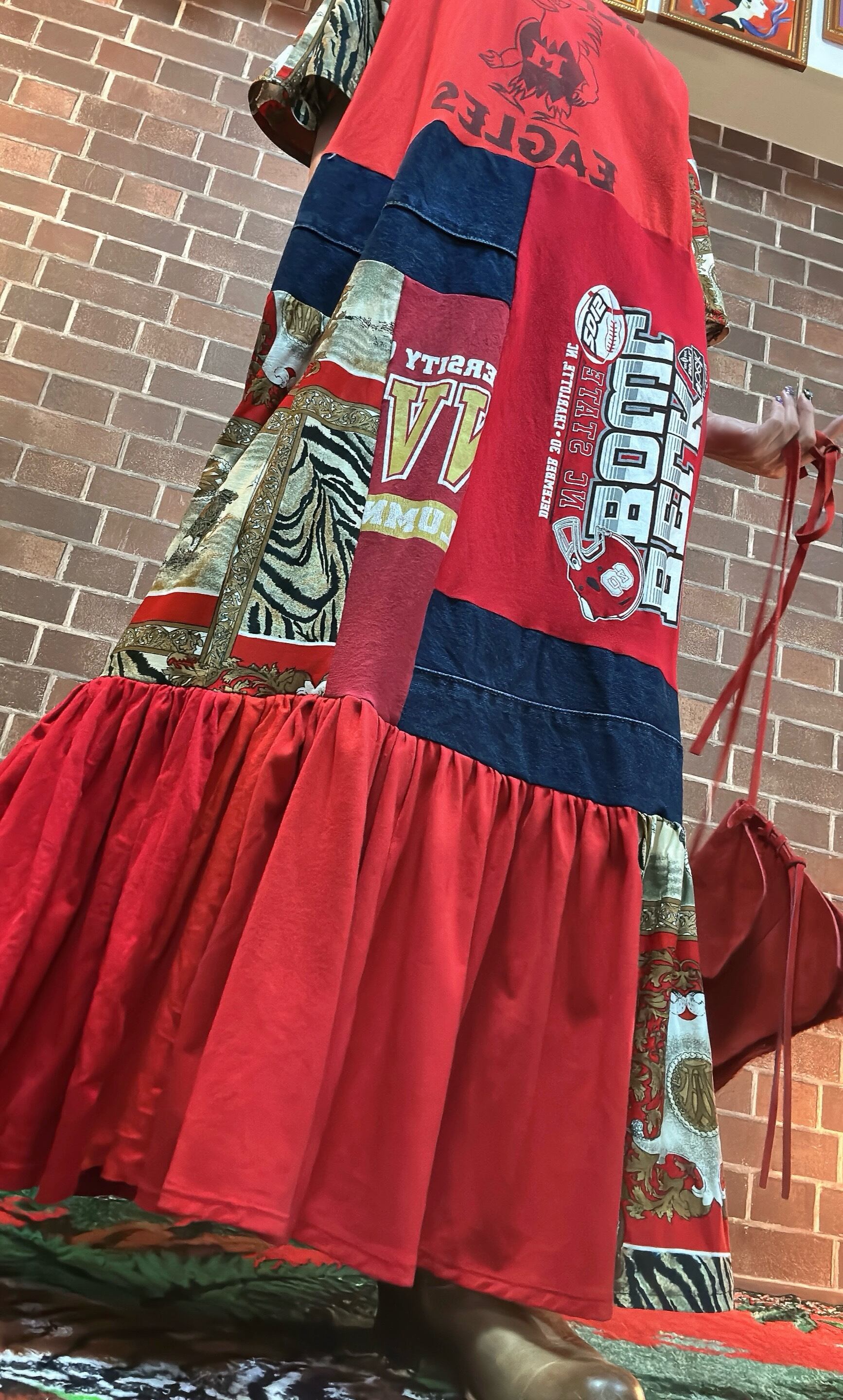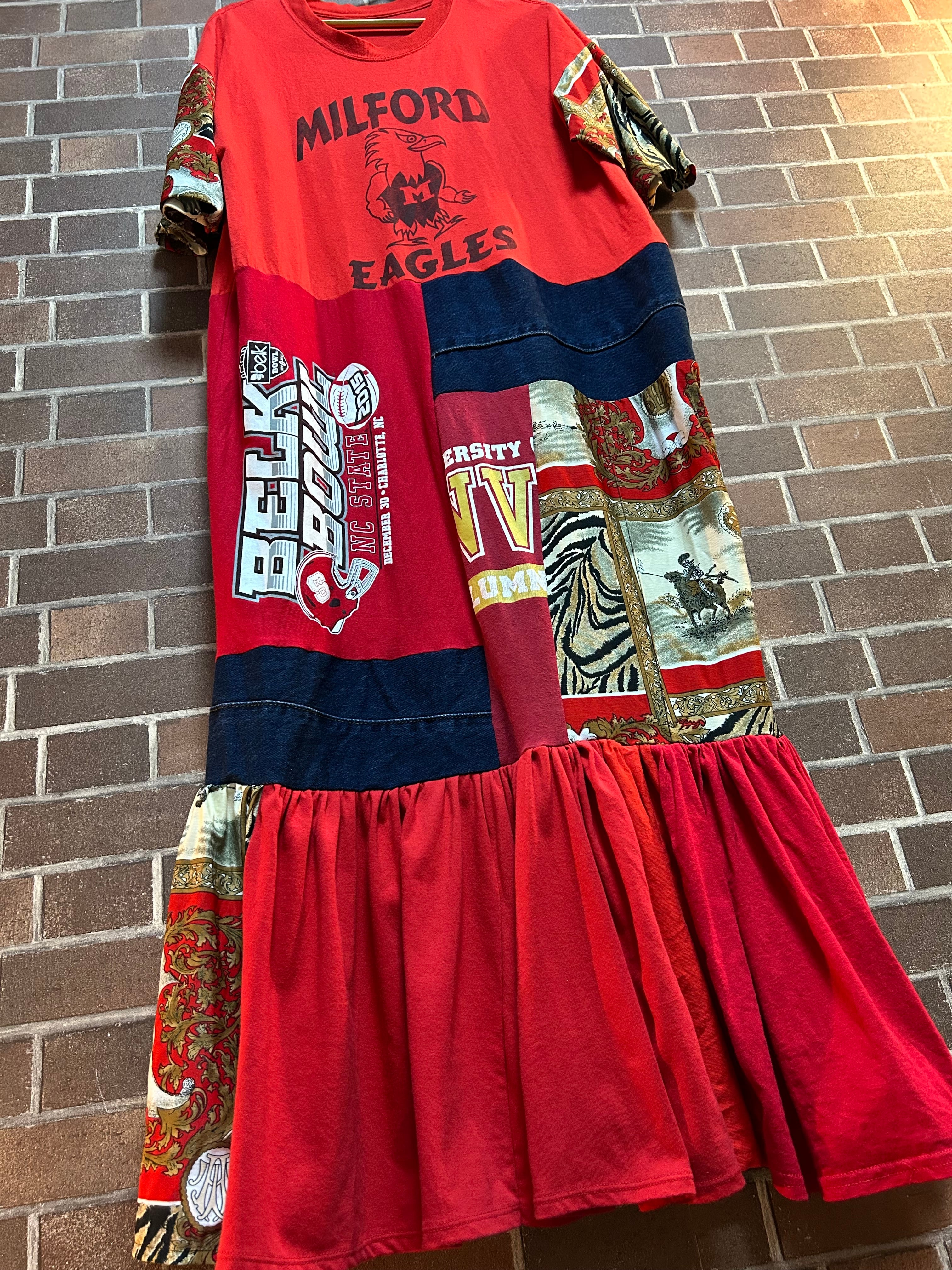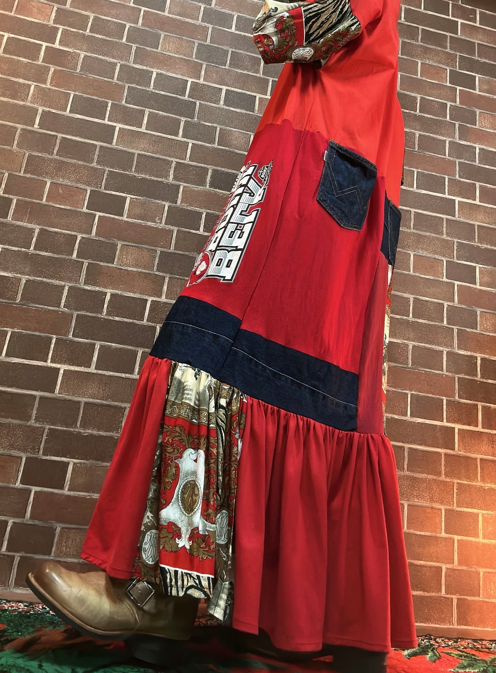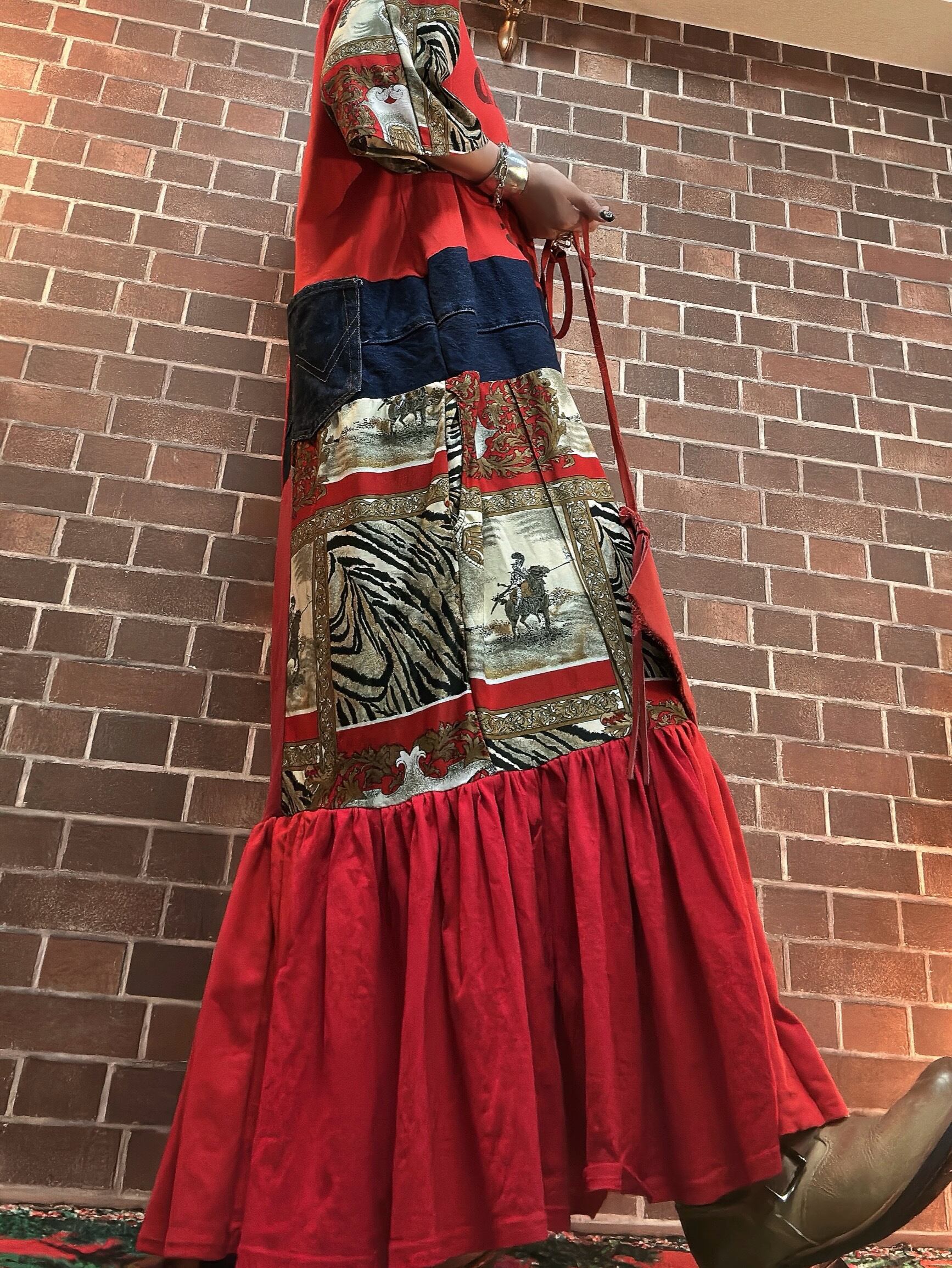 海外古着Tシャツやビンテージ生地、デニムを使用して制作したリメイクのパッチワークワンピースです⭐︎