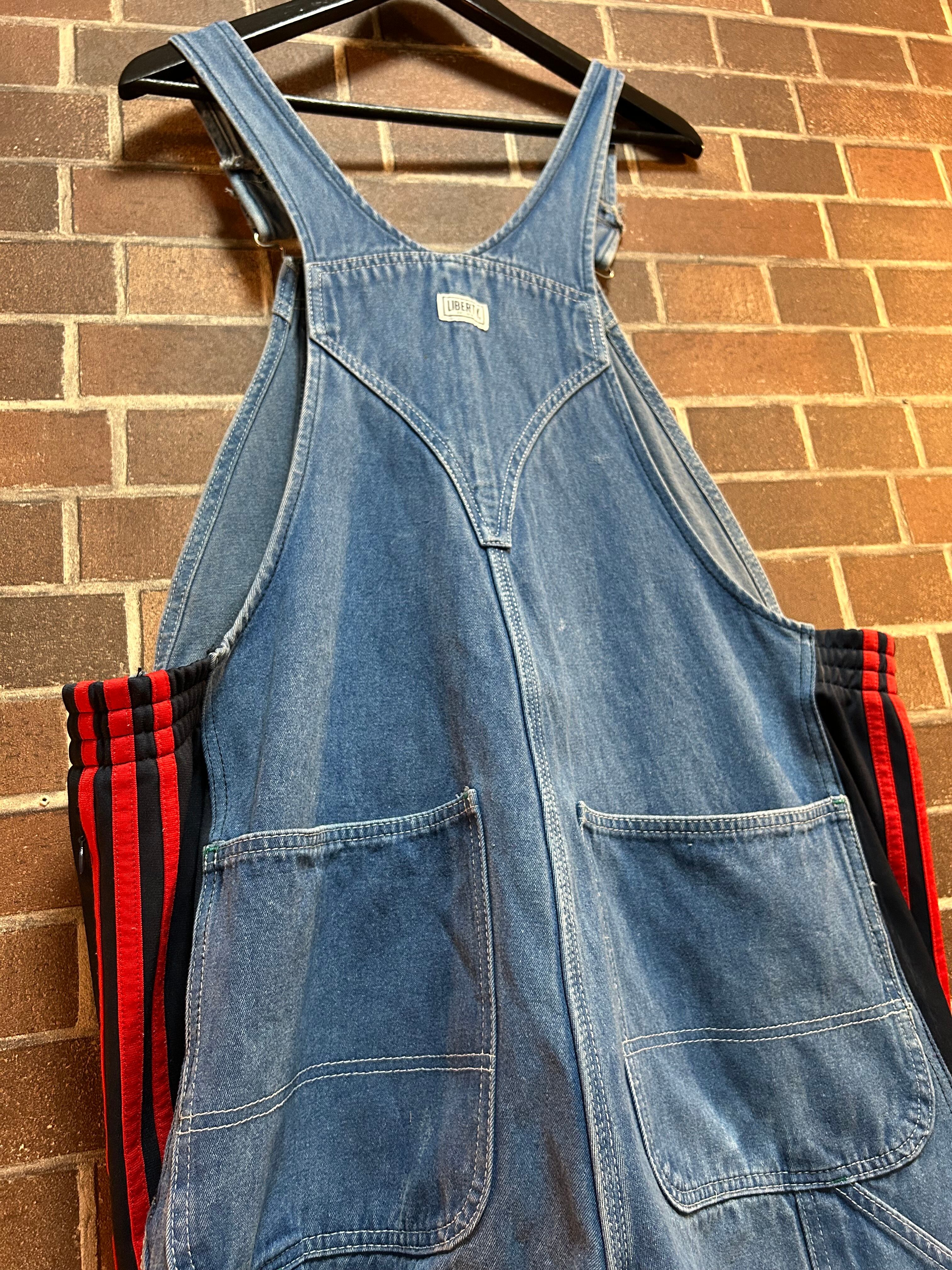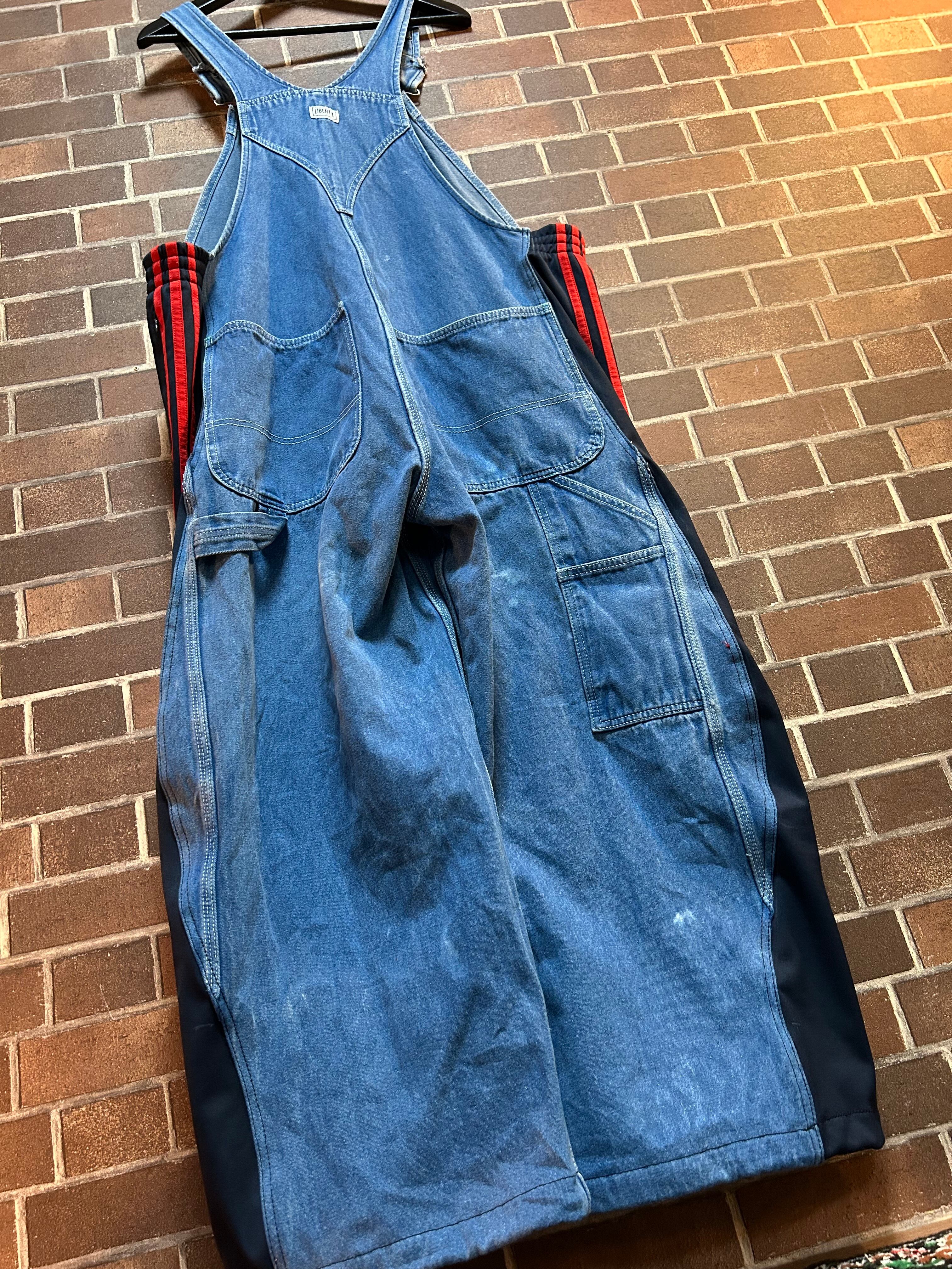 古着のジャージとデニムのオーバーオールを使用して制作したリメイクのオーバーオールです⭐︎