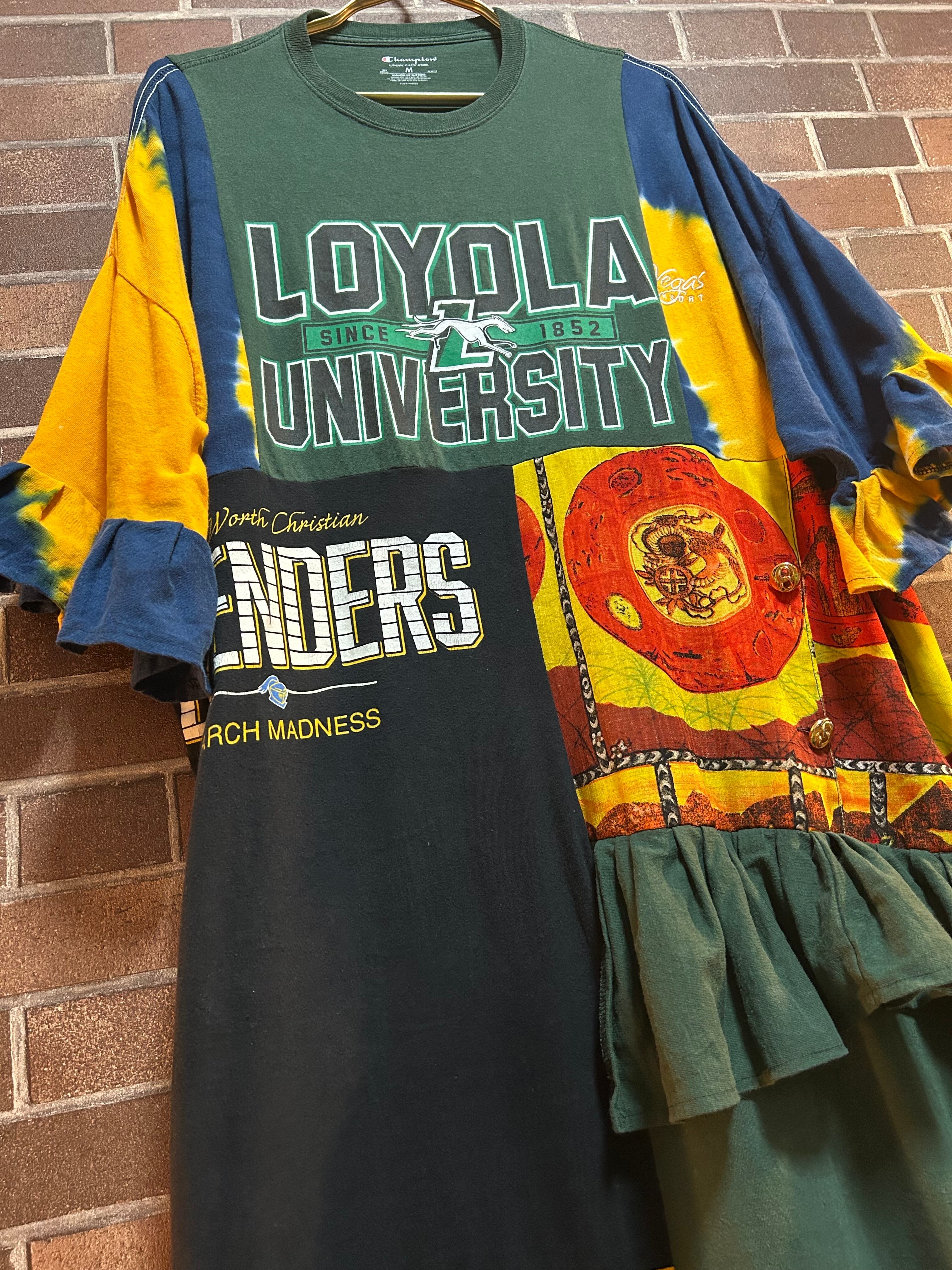 海外古着Tシャツやビンテージジャケットを使用して制作したリメイクのパッチワークワンピースです。