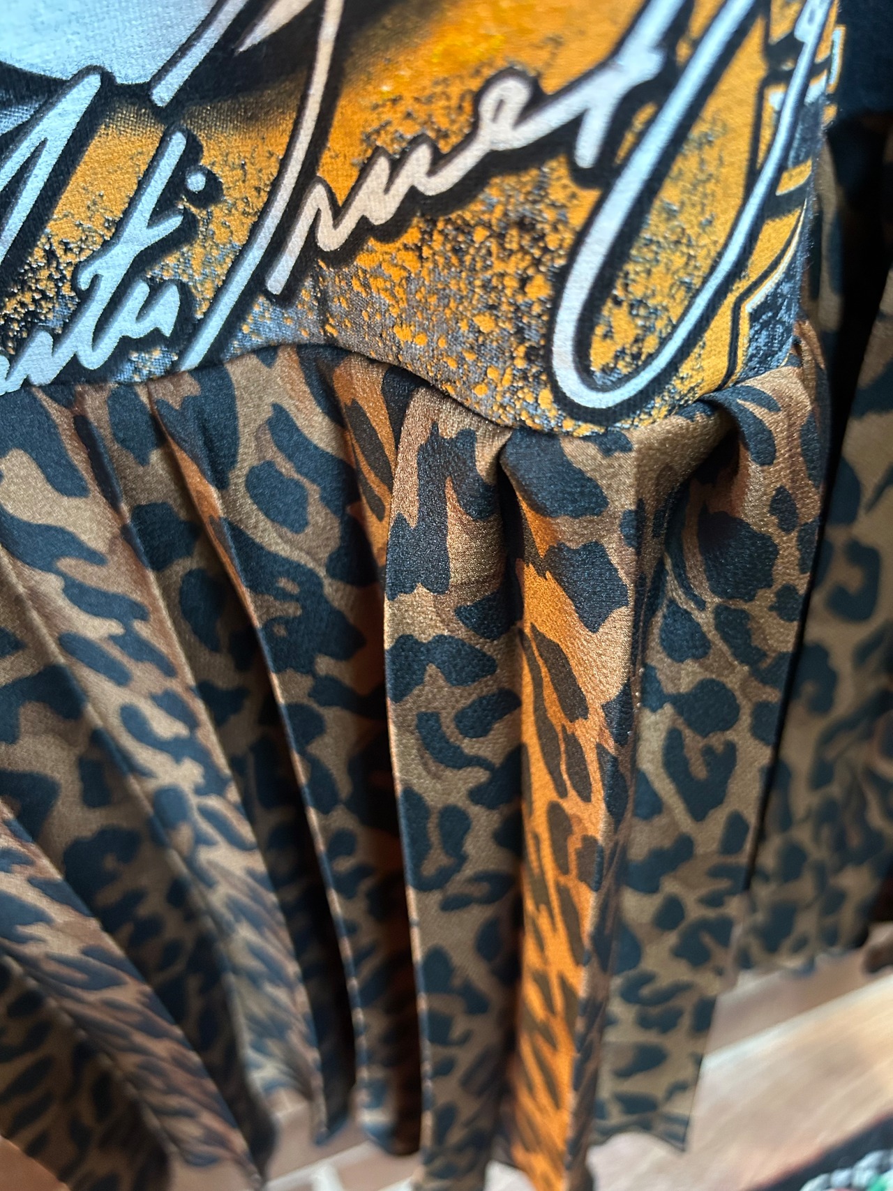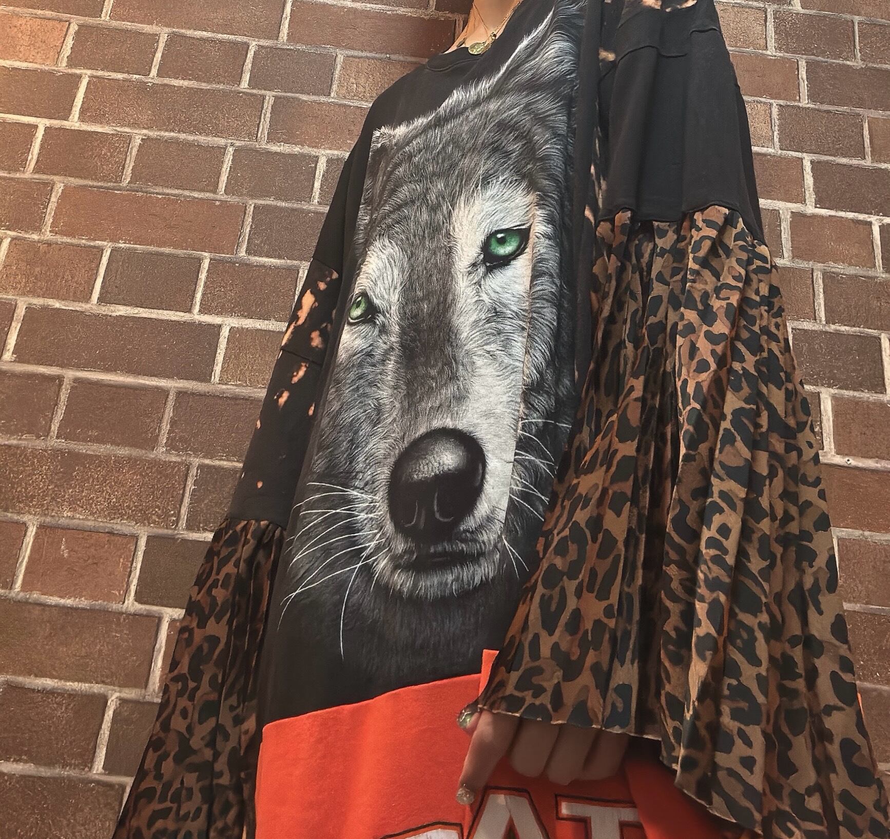 アニマルTシャツ古着を使用して制作したリメイクのドッキングワンピースです。