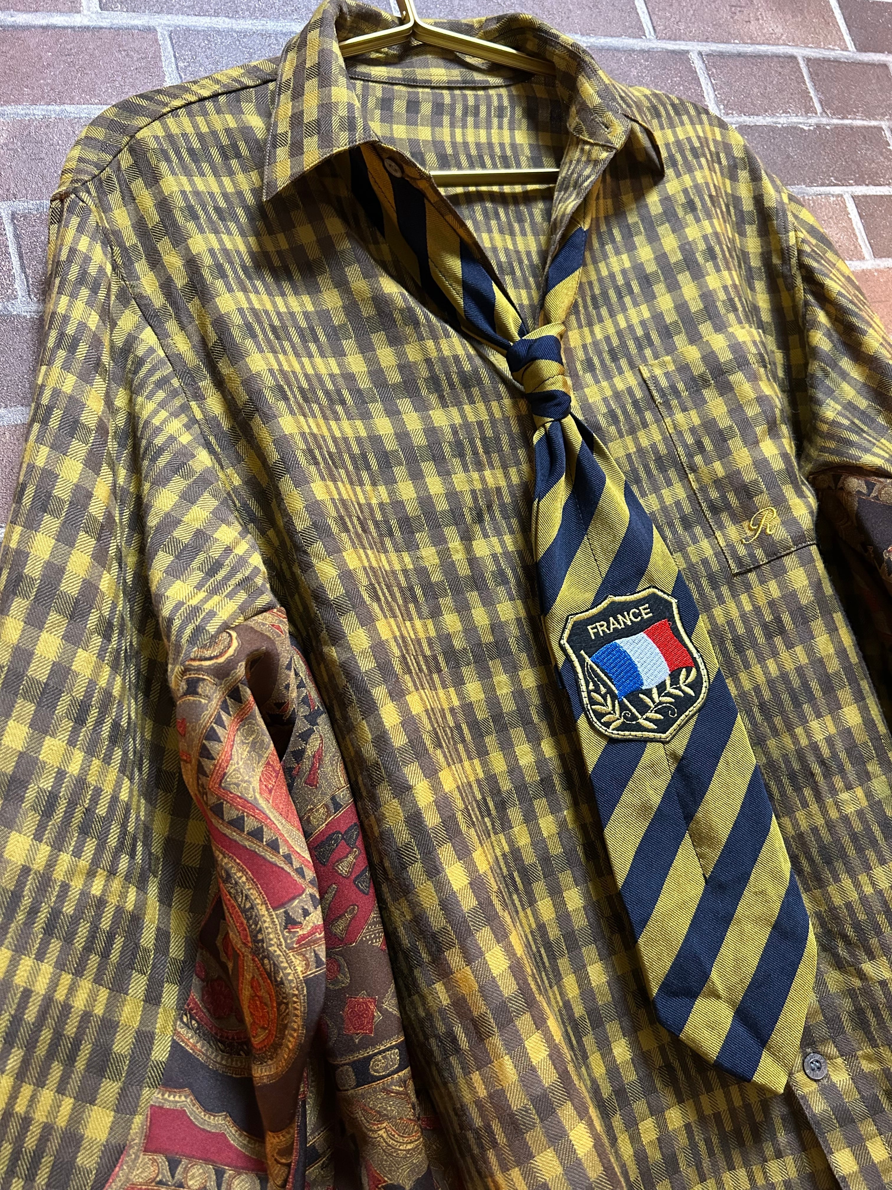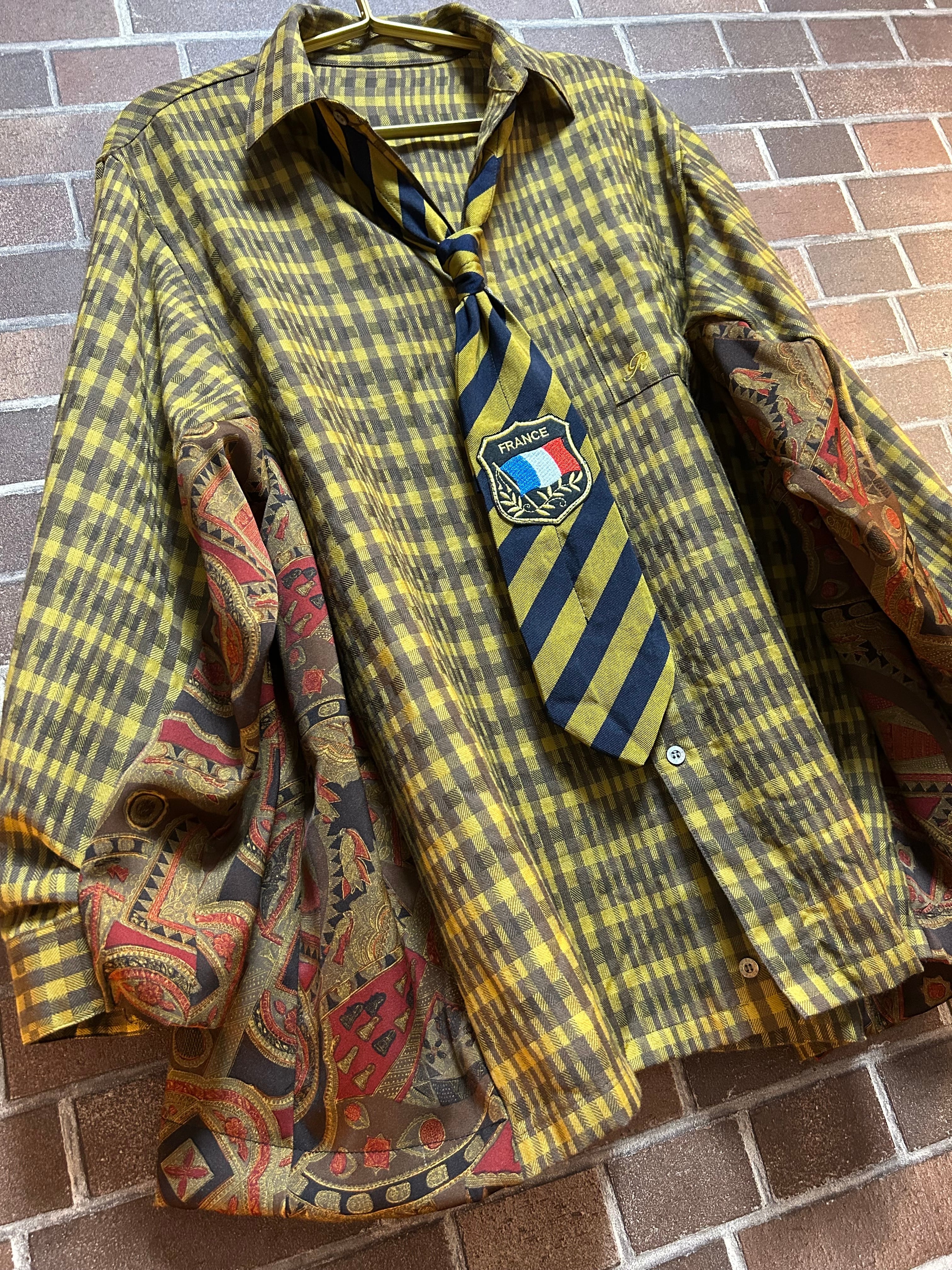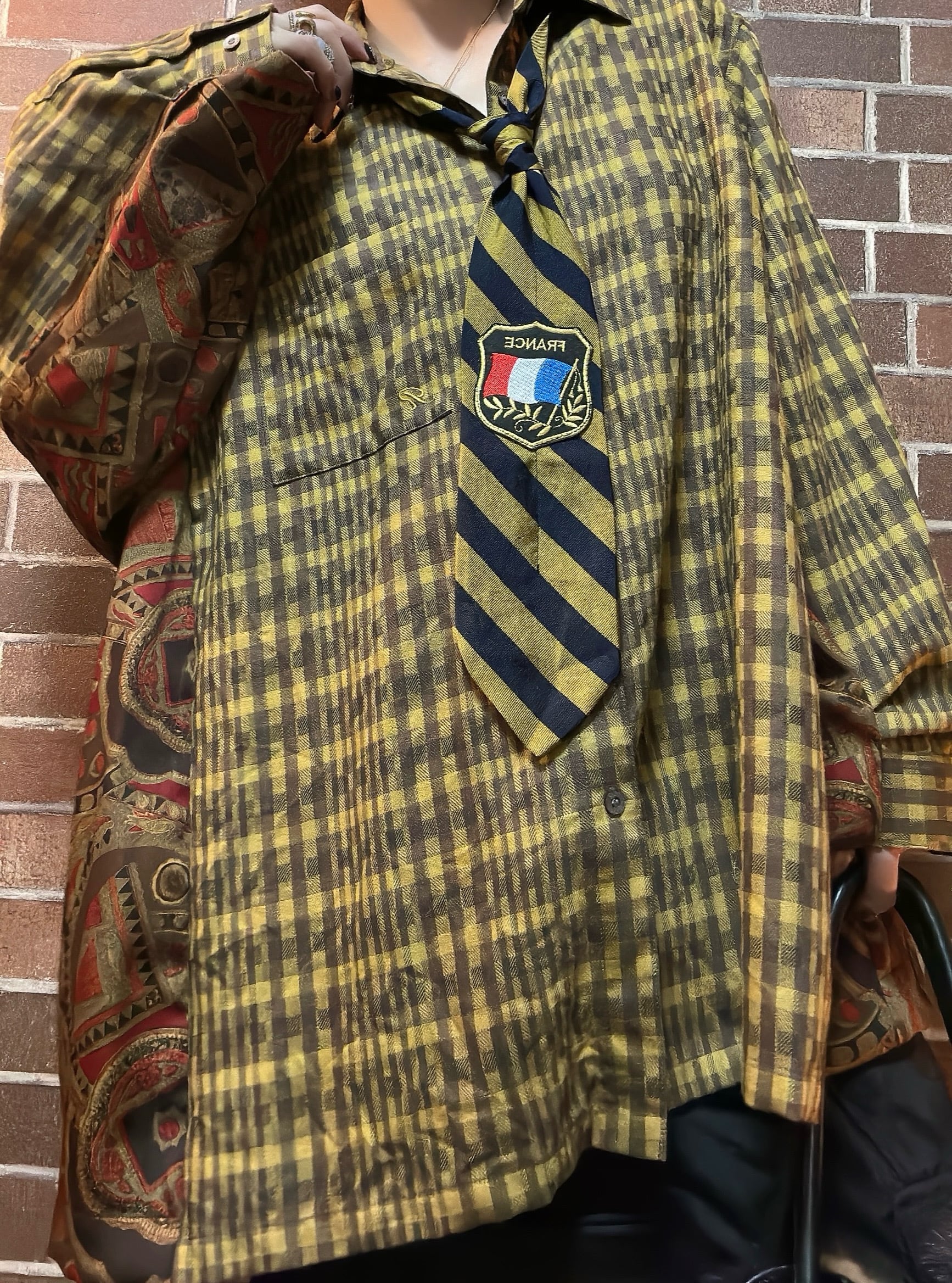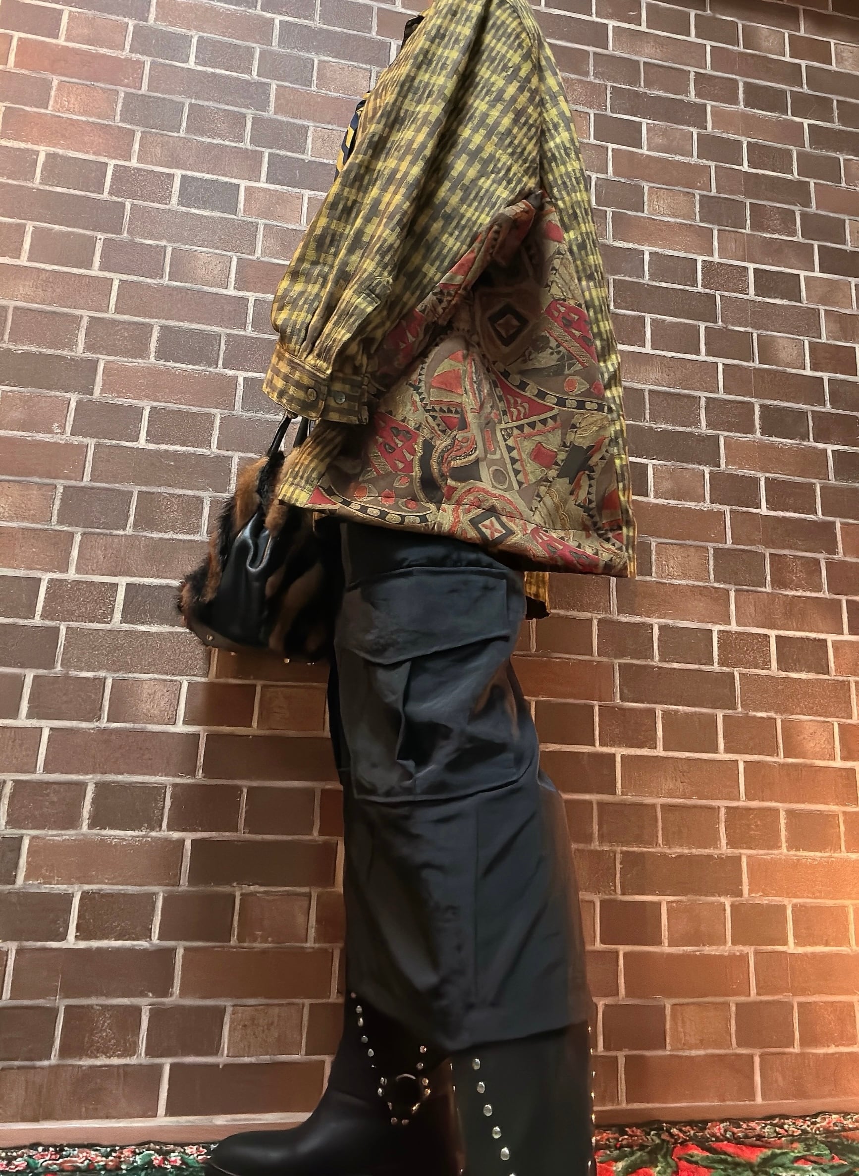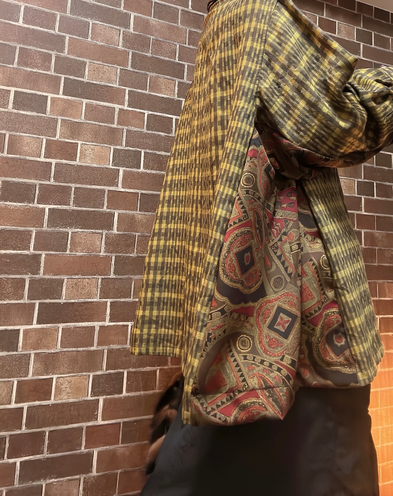 古着のチェックシャツとビンテージジャケットを使用して制作したリメイクのトップスです。