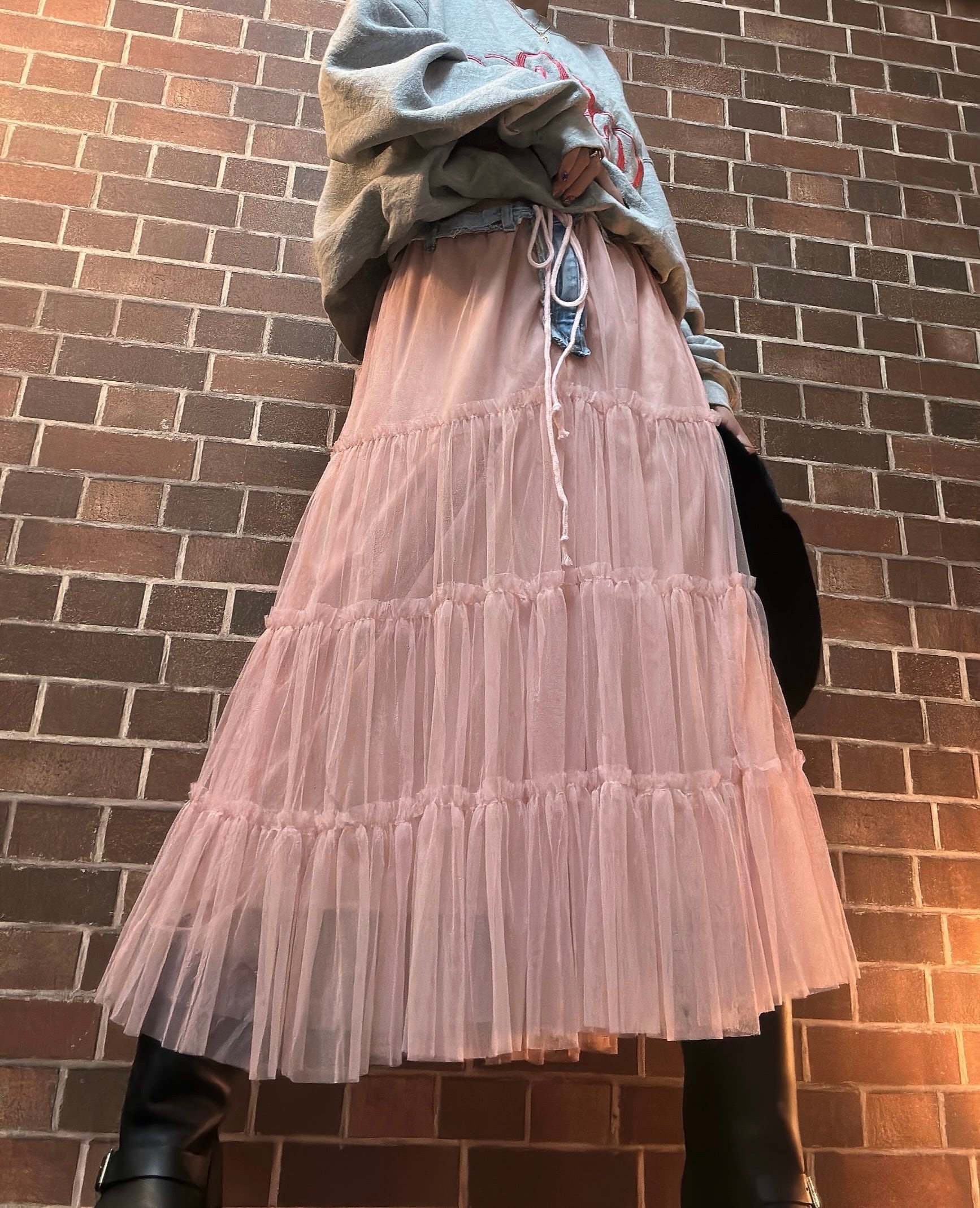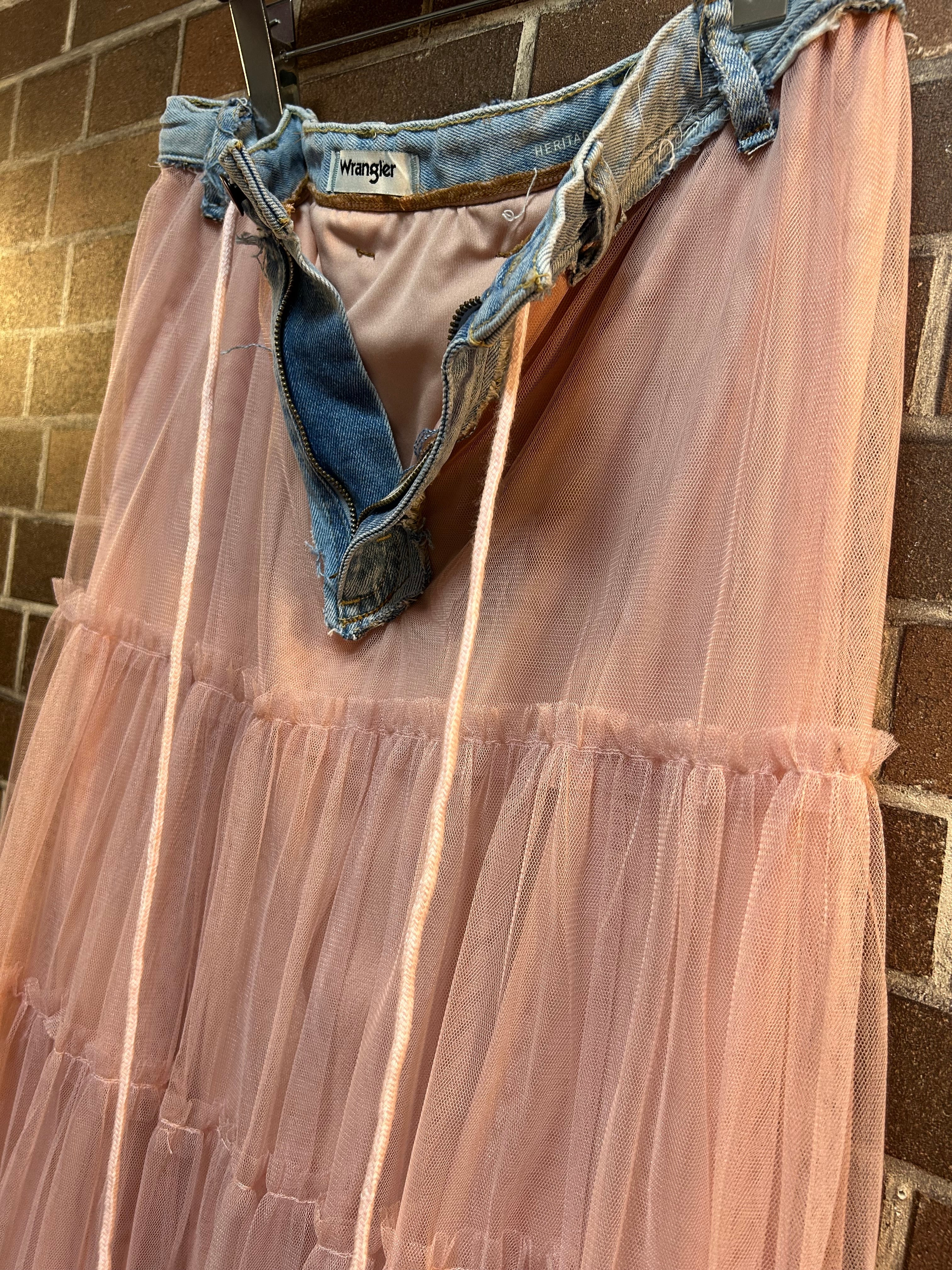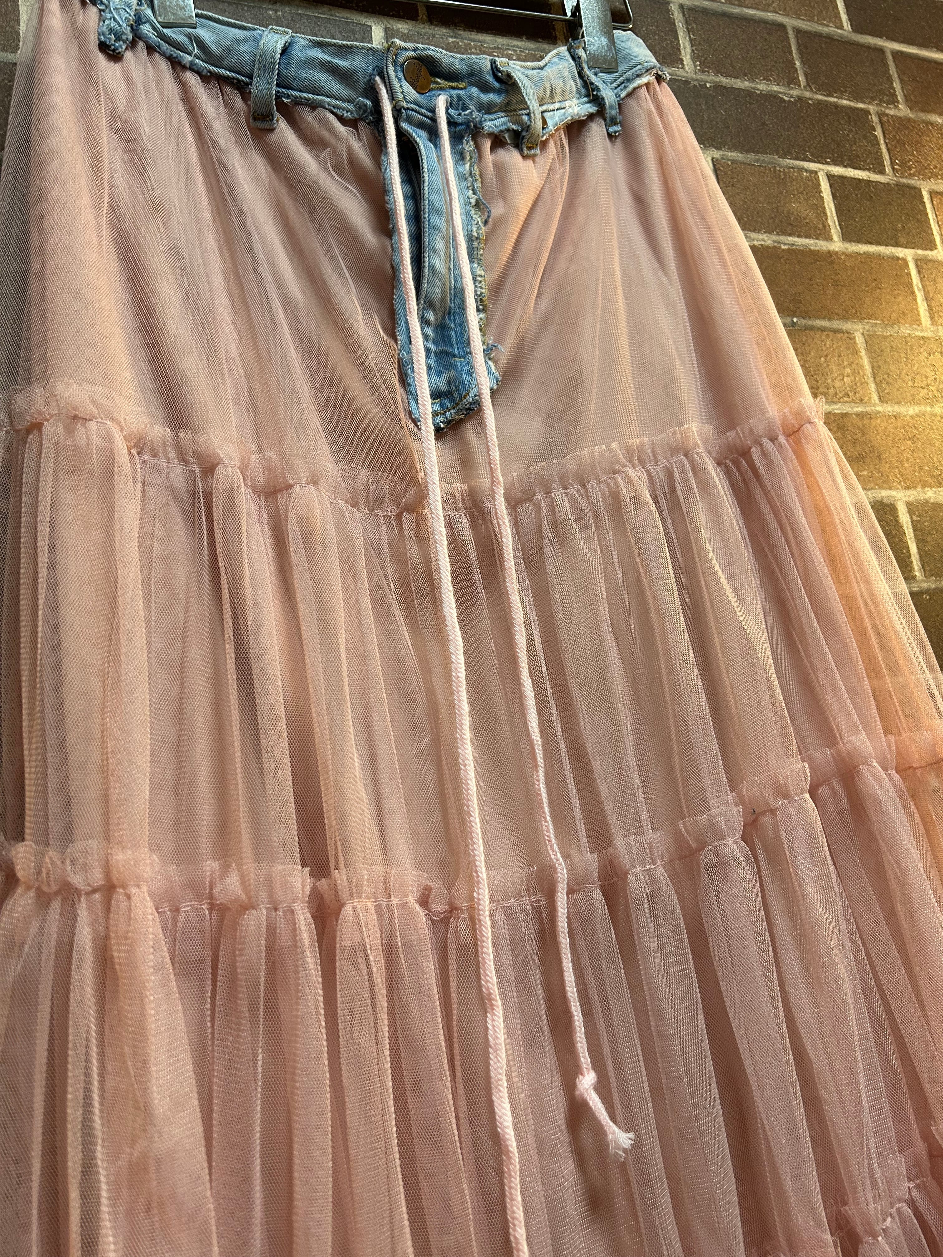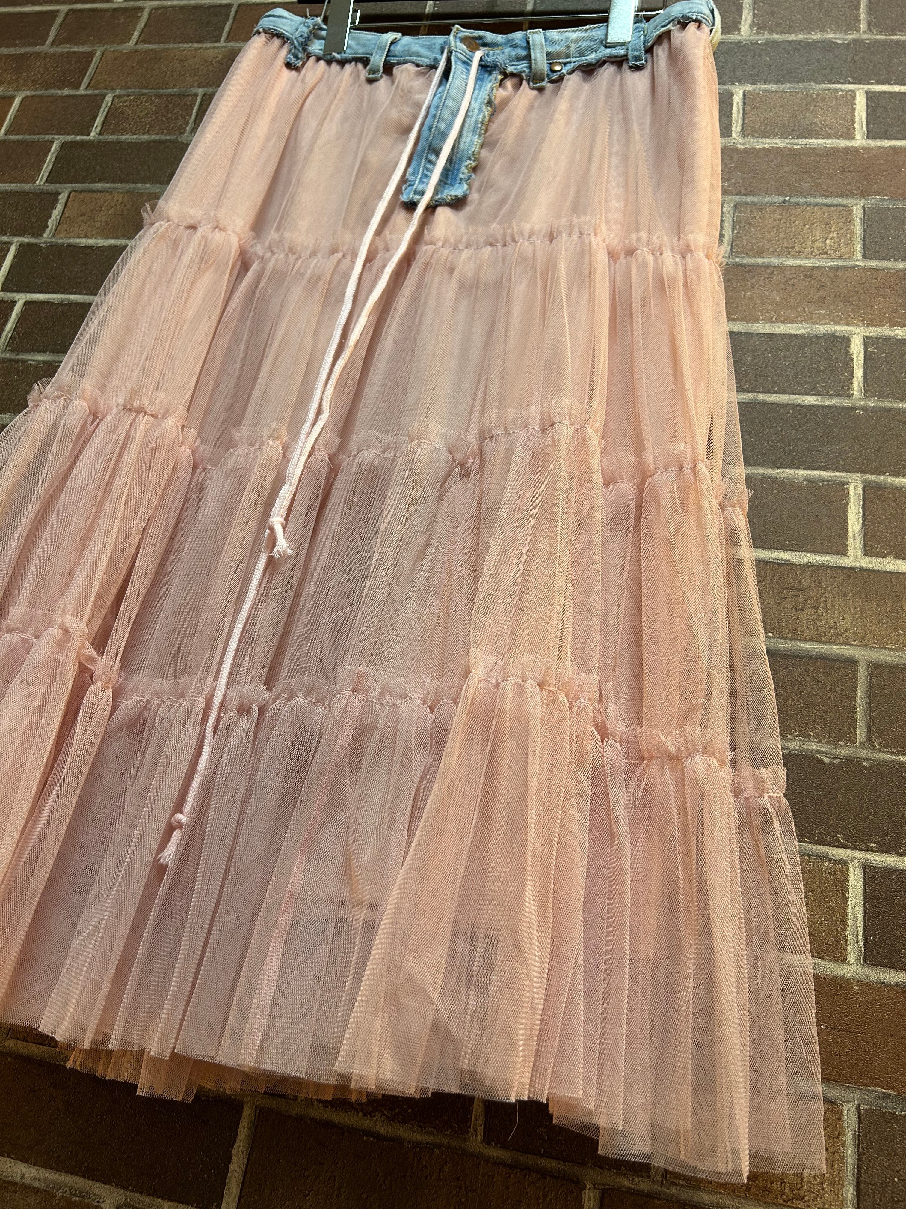 古着デニムとチュールスカートを使用して制作したリメイクスカートです⭐︎