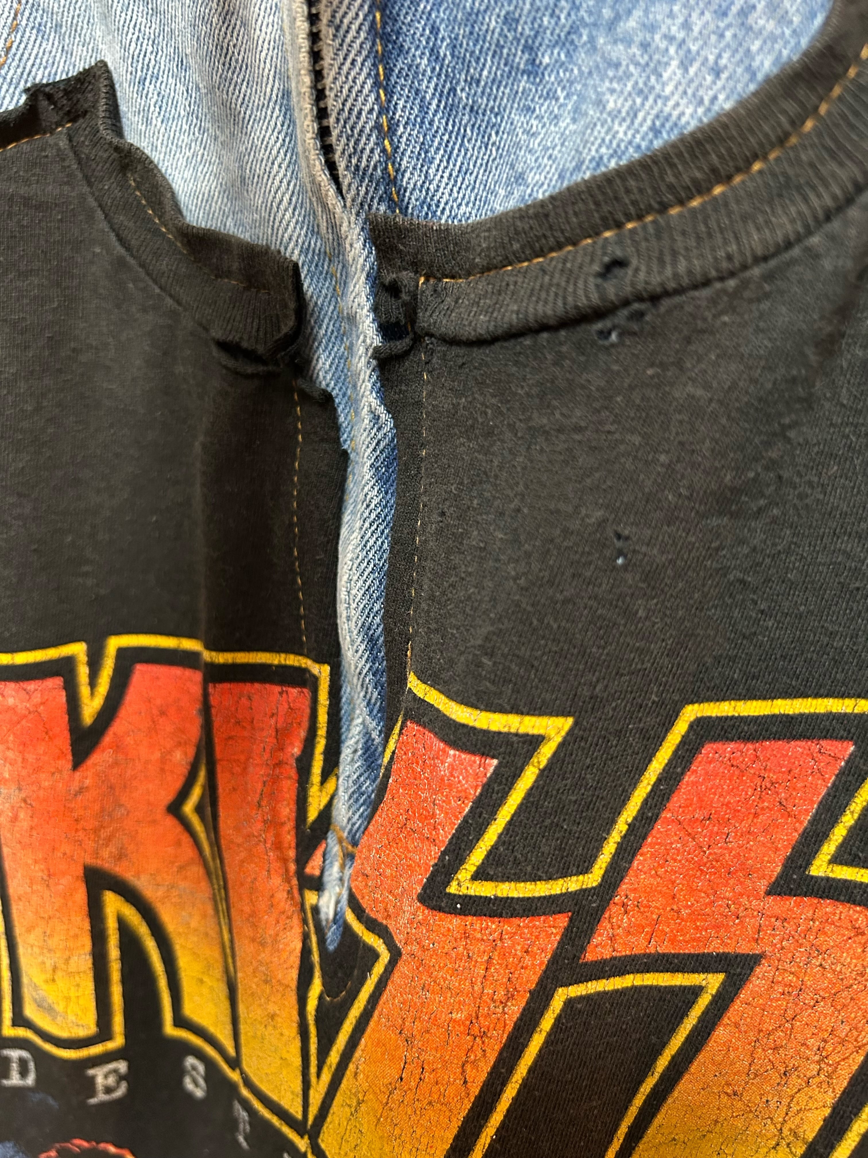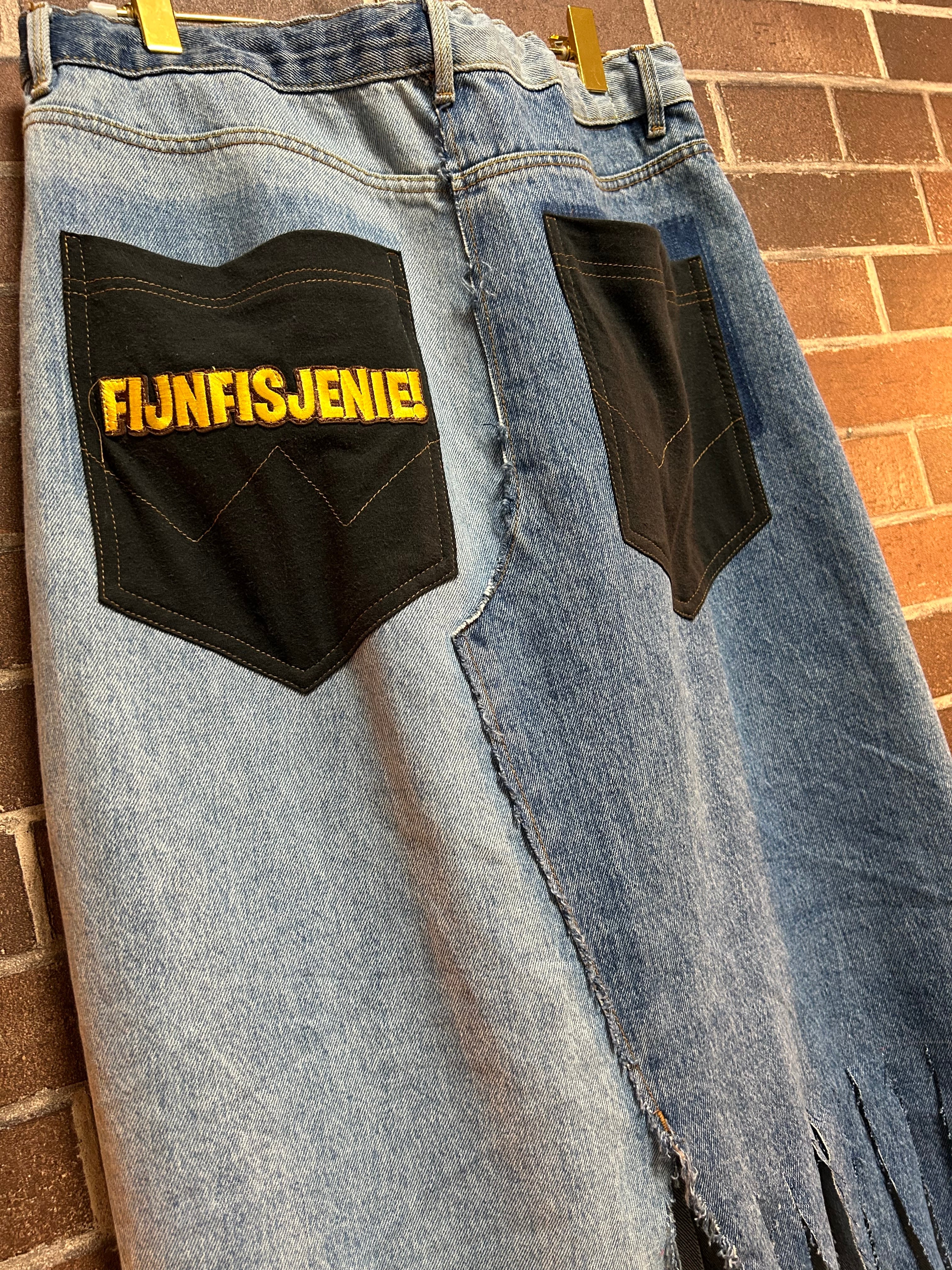ビンテージTシャツを使用して制作したリメイクのフリンジデニムスカートです⭐︎