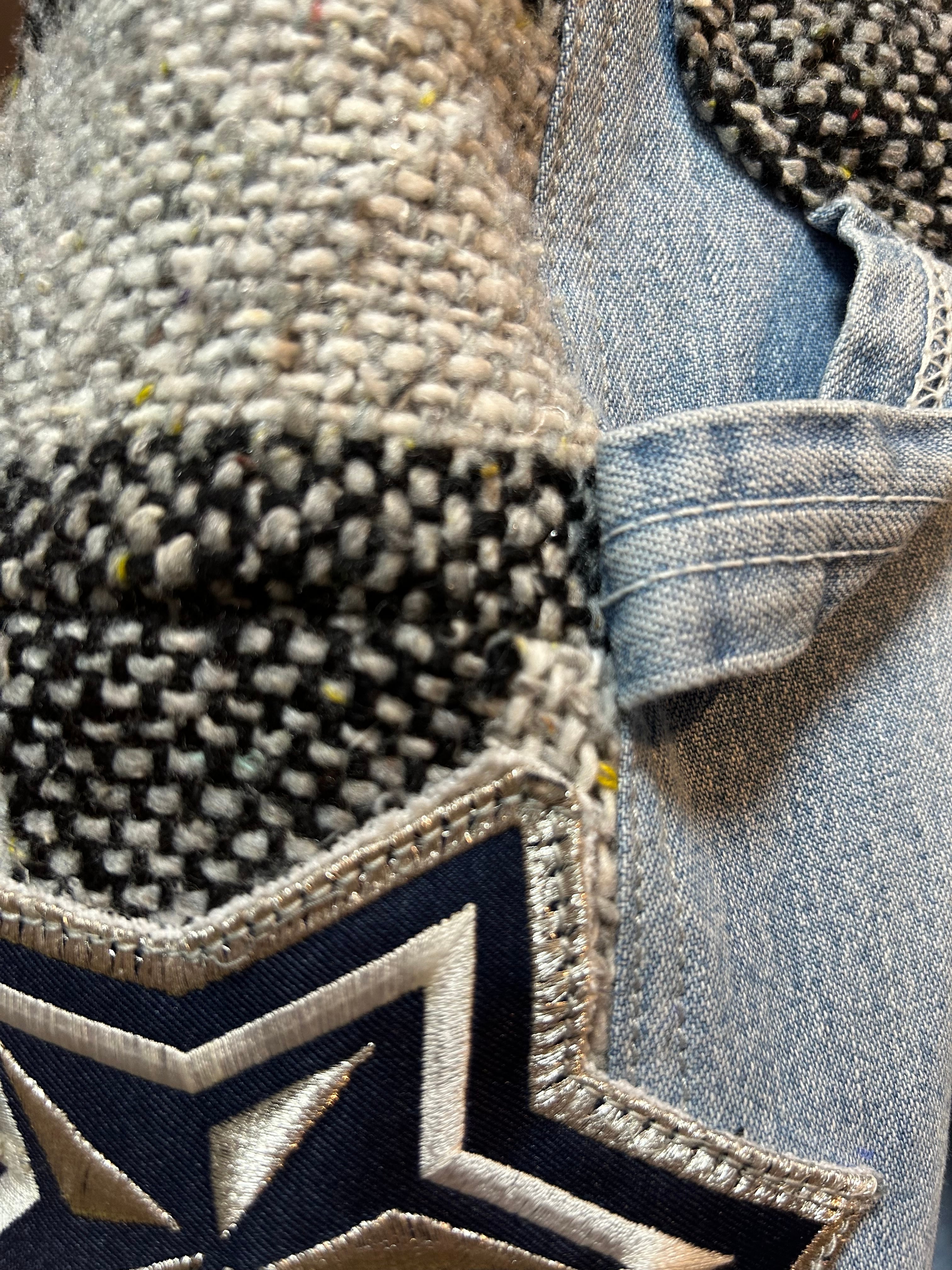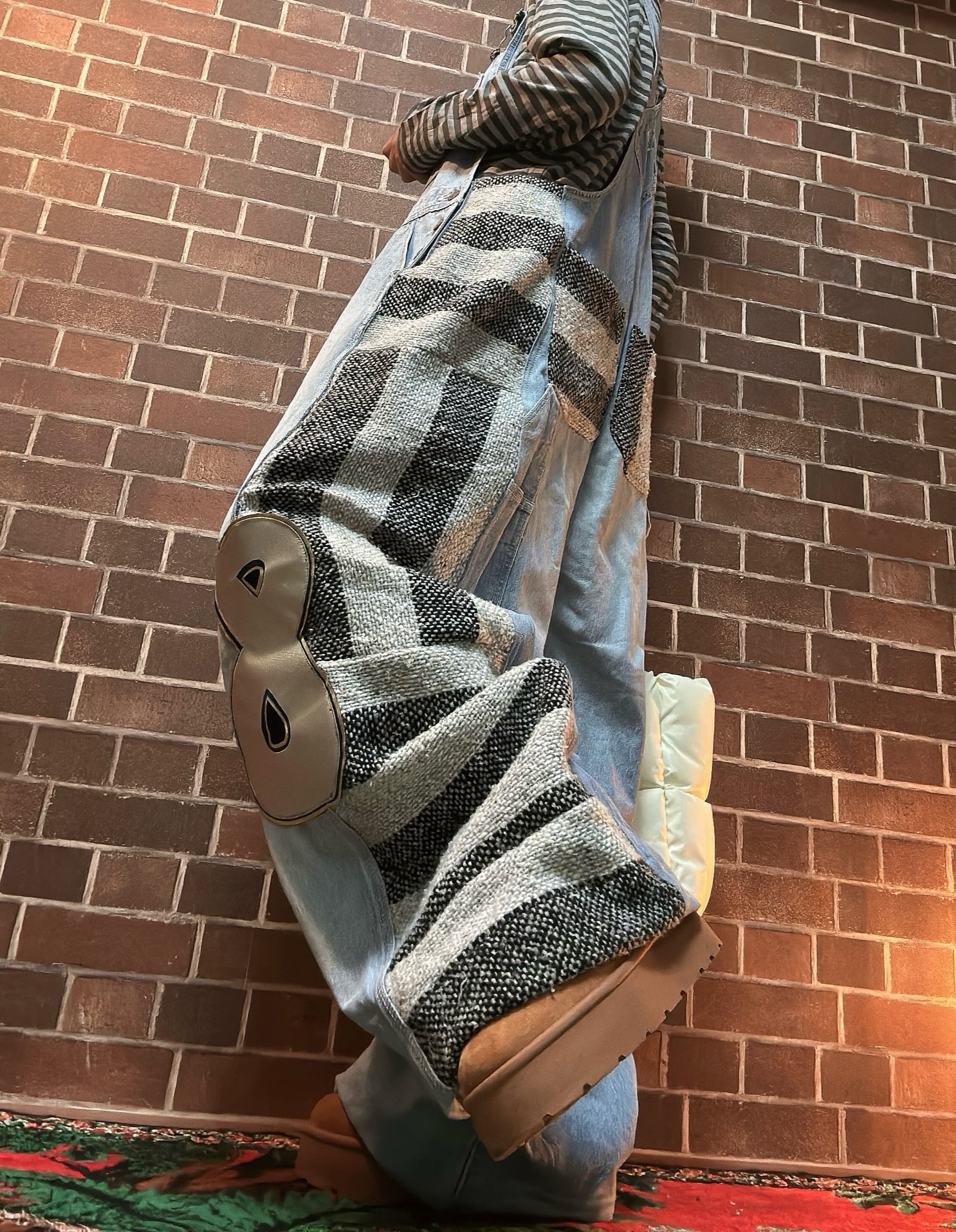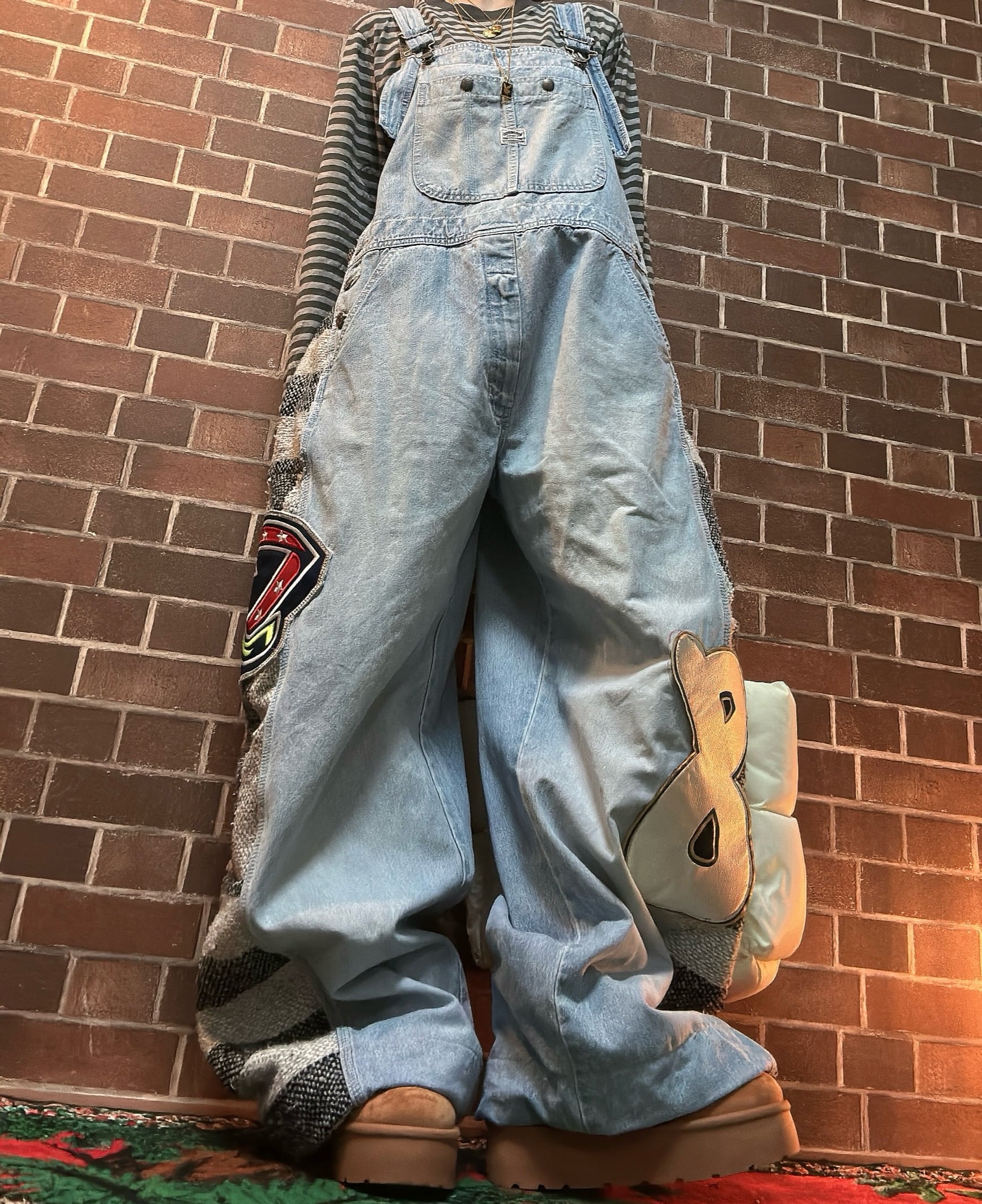 海外ビンテージ生地を使用して制作したリメイクのデニムオーバーオールです⭐︎