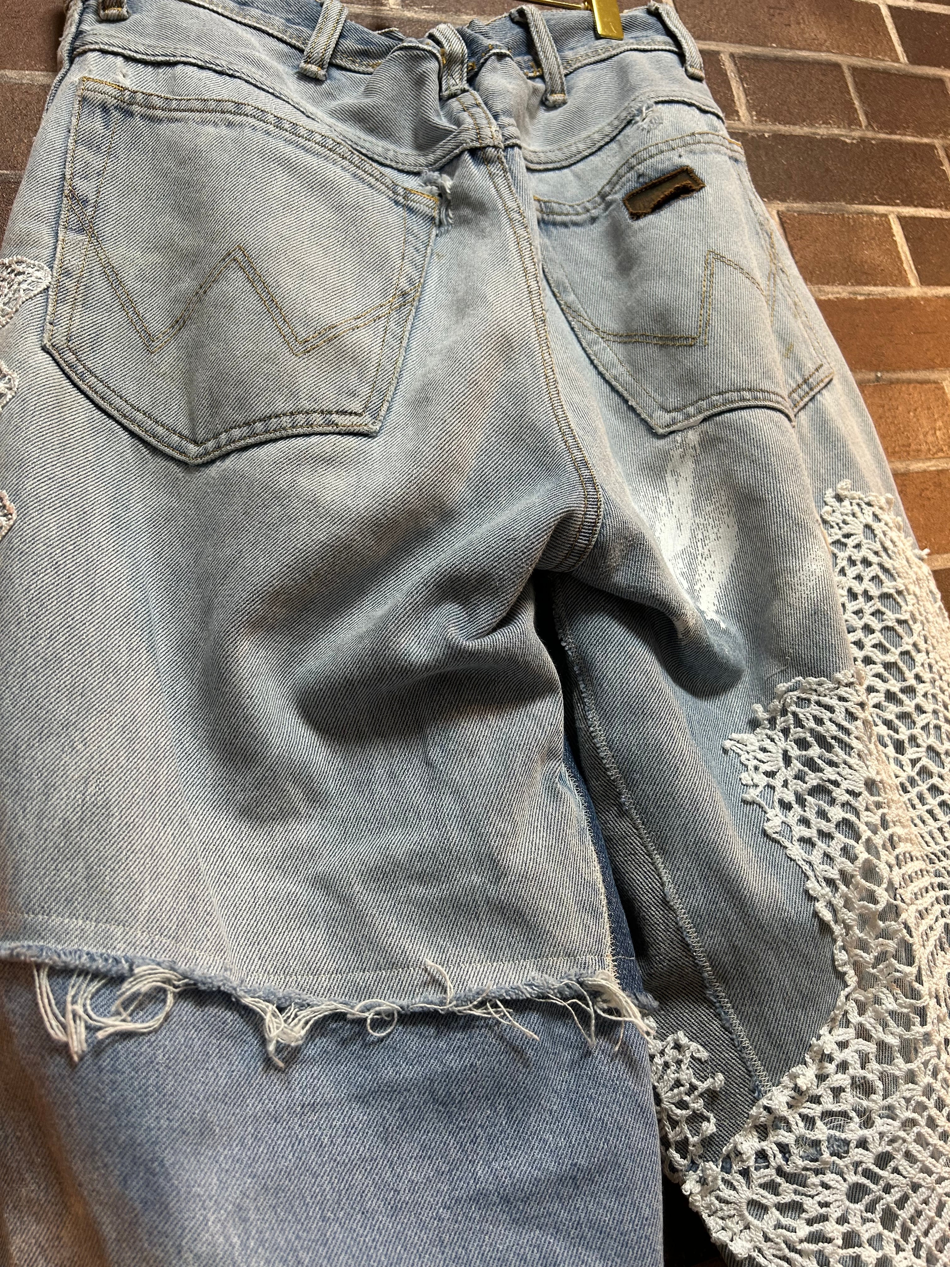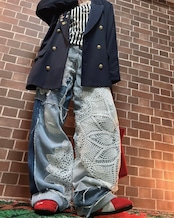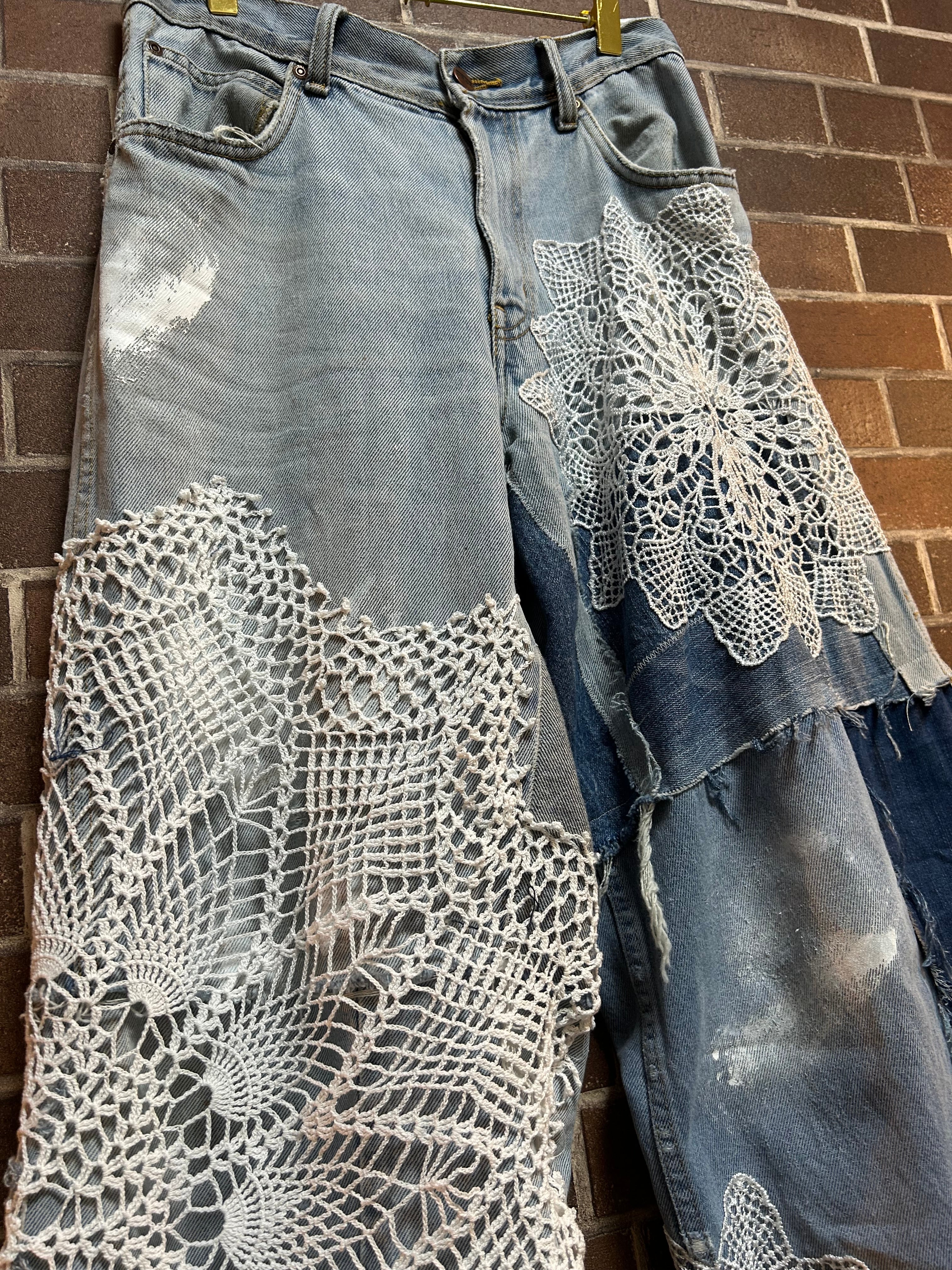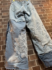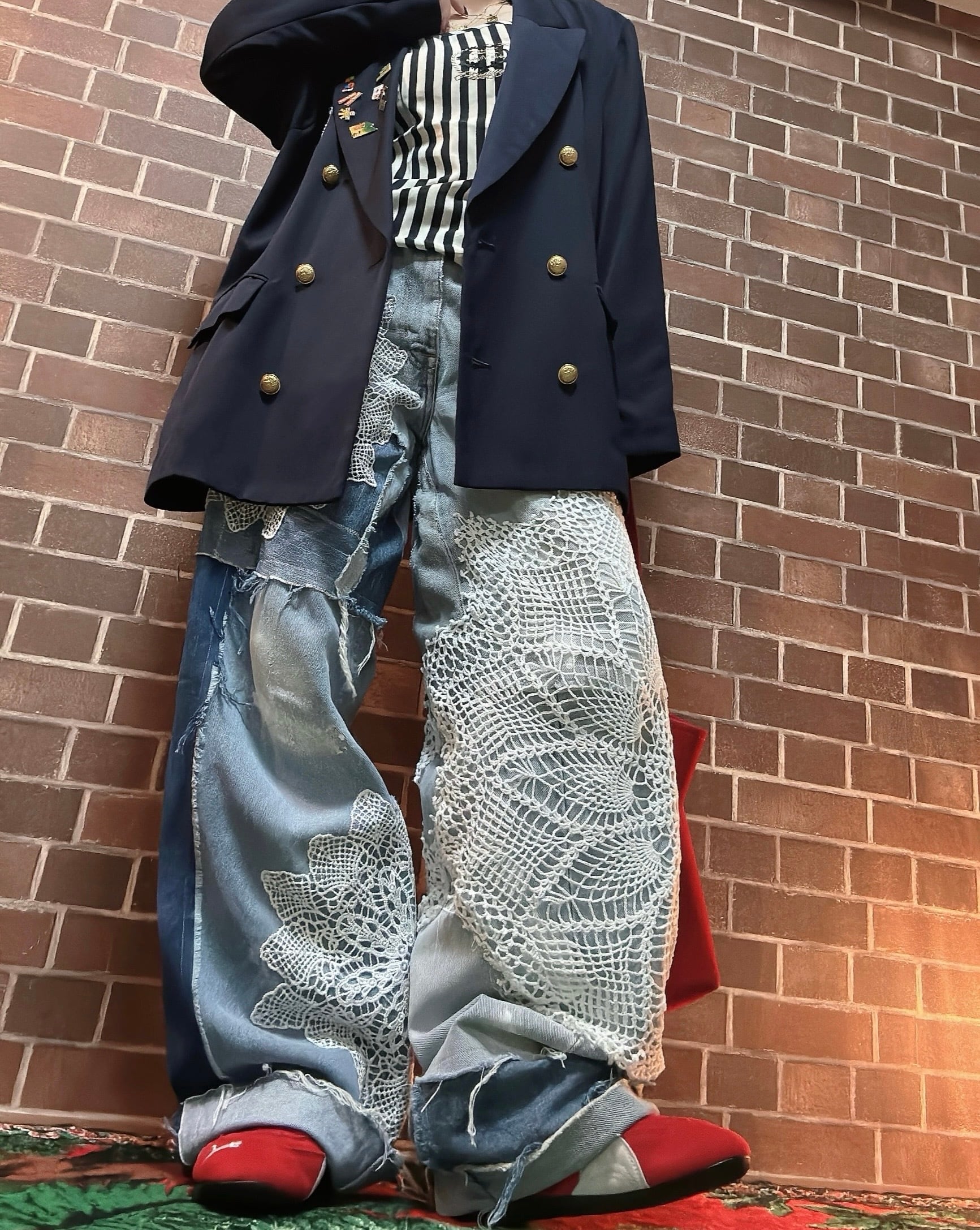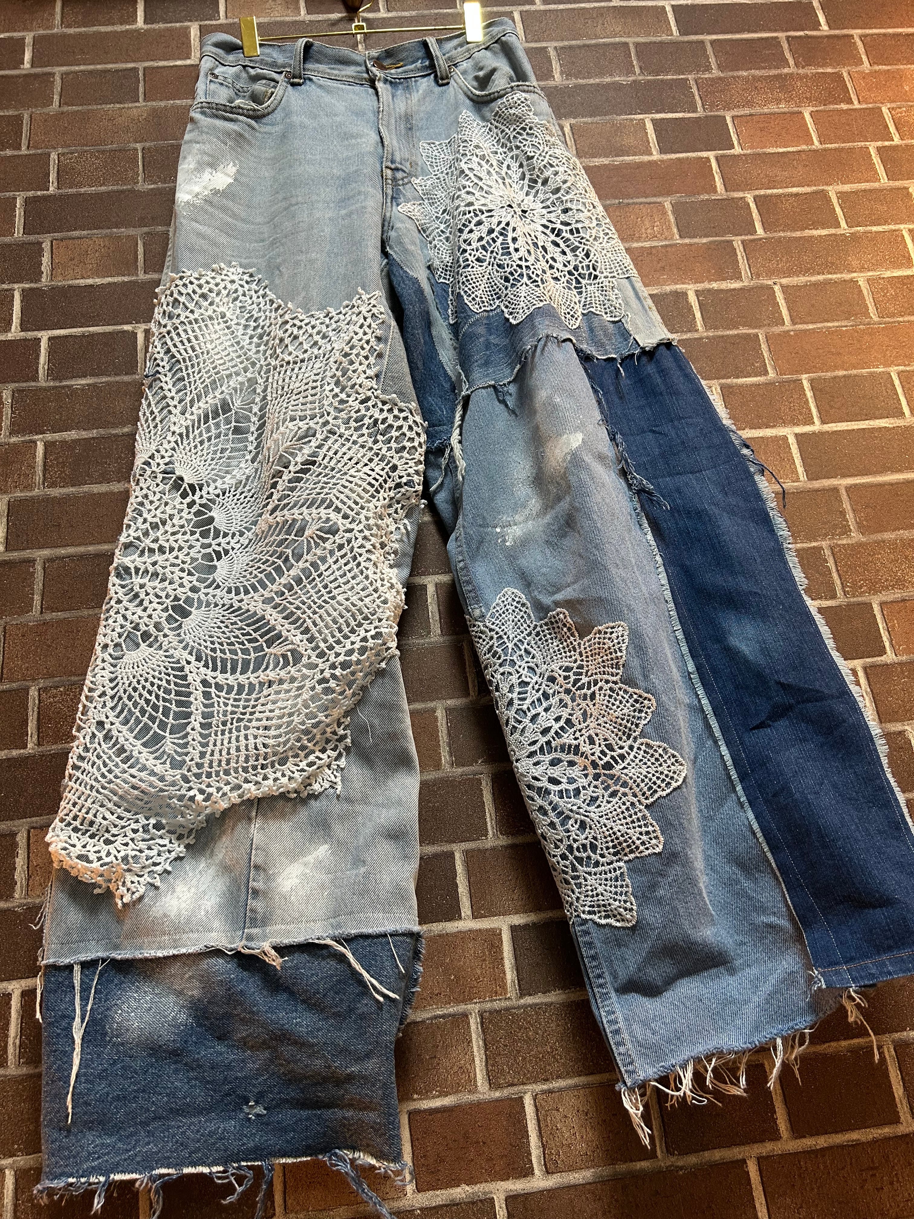 古着デニムをパッチワークリメイクして、鍵編みクロシェとペイントでデコレーションしたリメイクパンツです⭐︎
