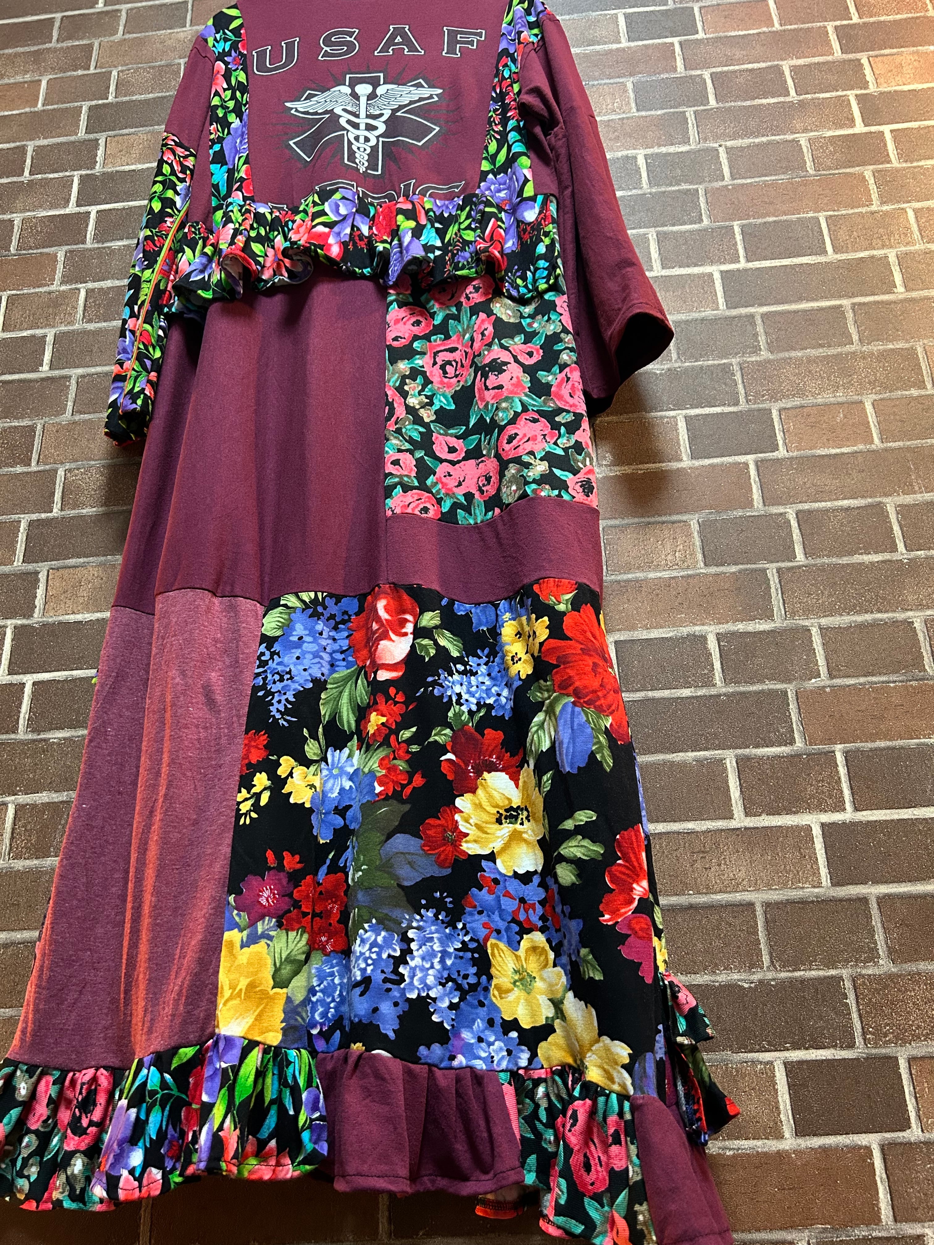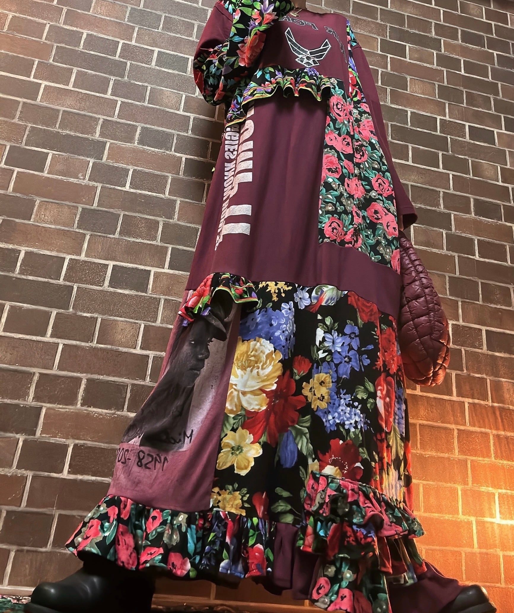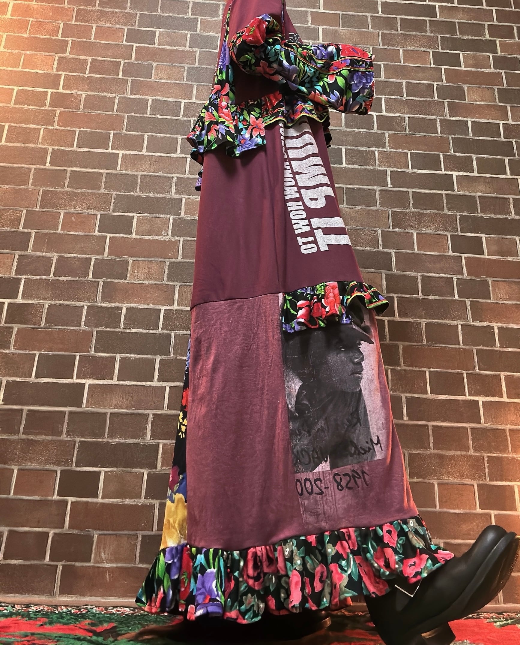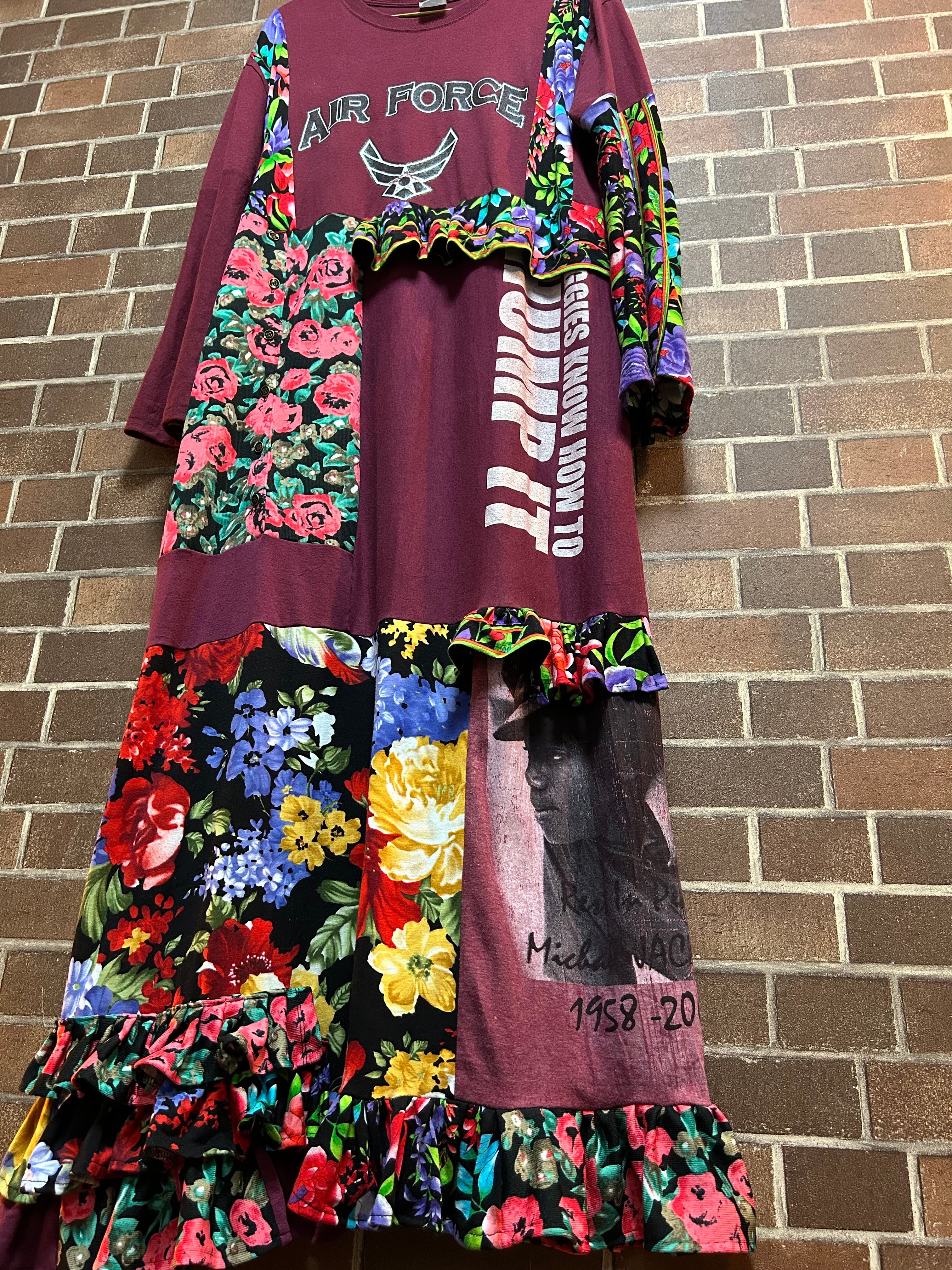 古着Tシャツを使用して制作したリメイクのパッチワークフリルワンピースです⭐︎