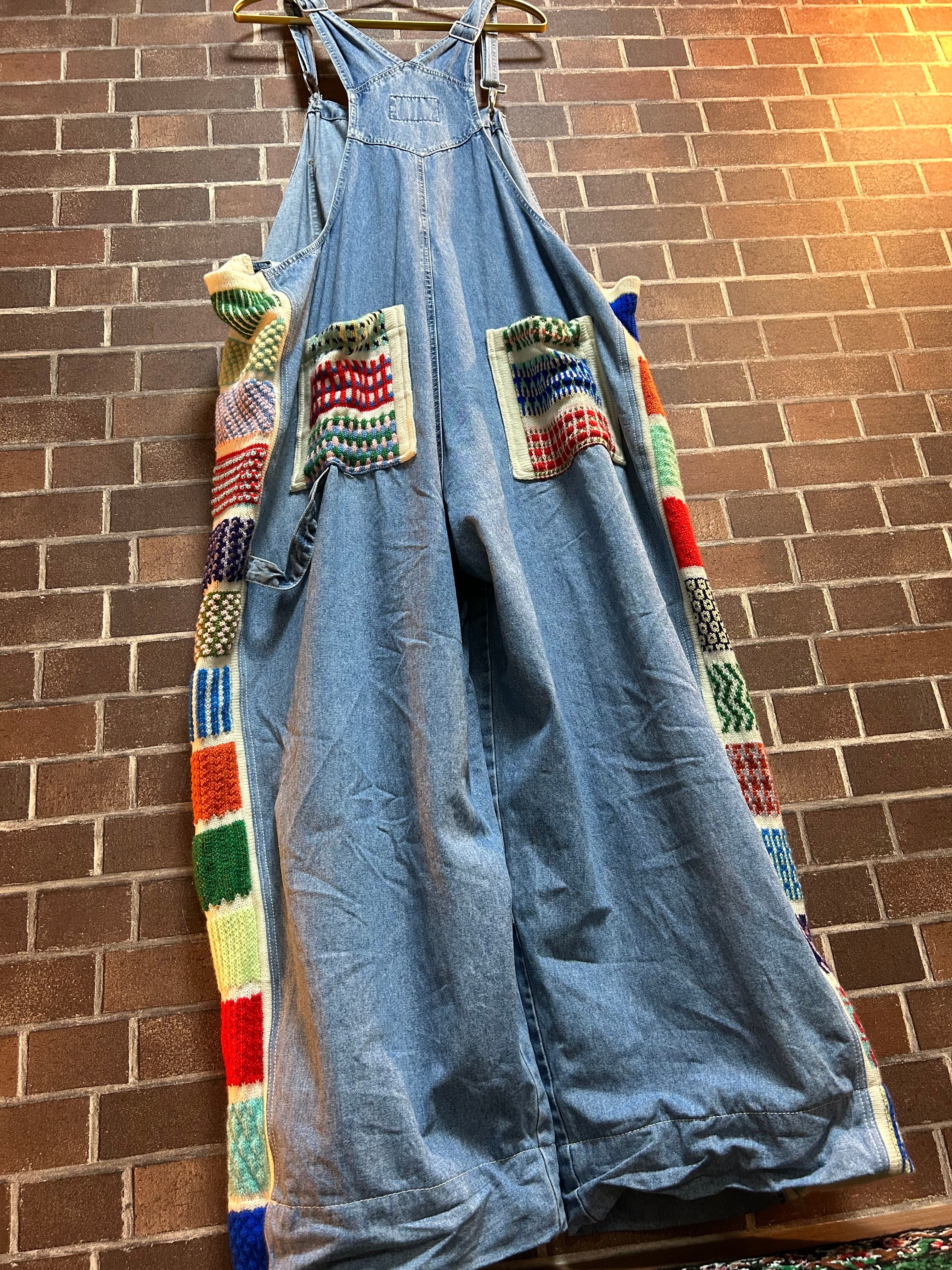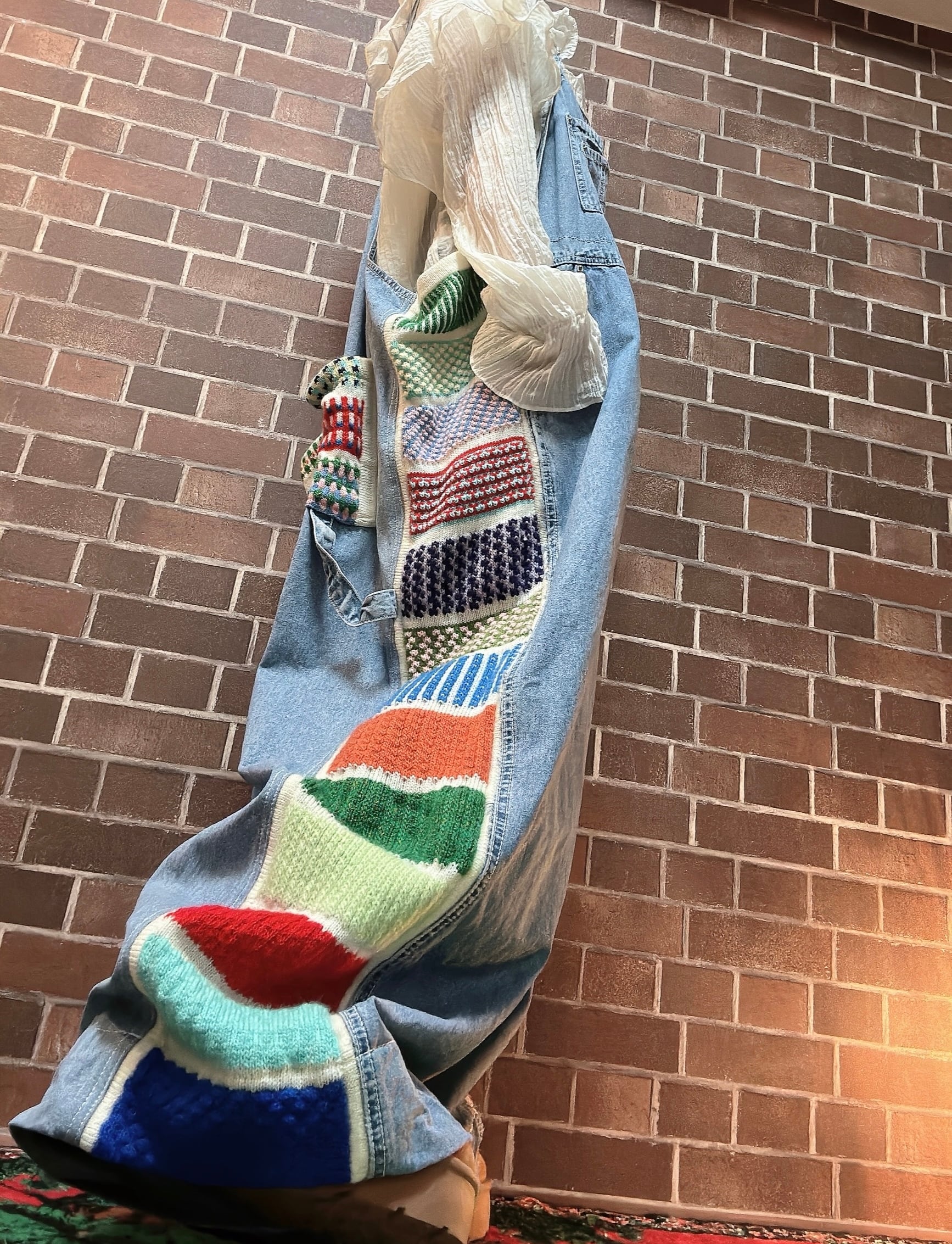 90年代のビンテージのデニムオーバーオールとビンテージのカラフルニットを使用して製作したリメイクのオーバーオールです⭐︎