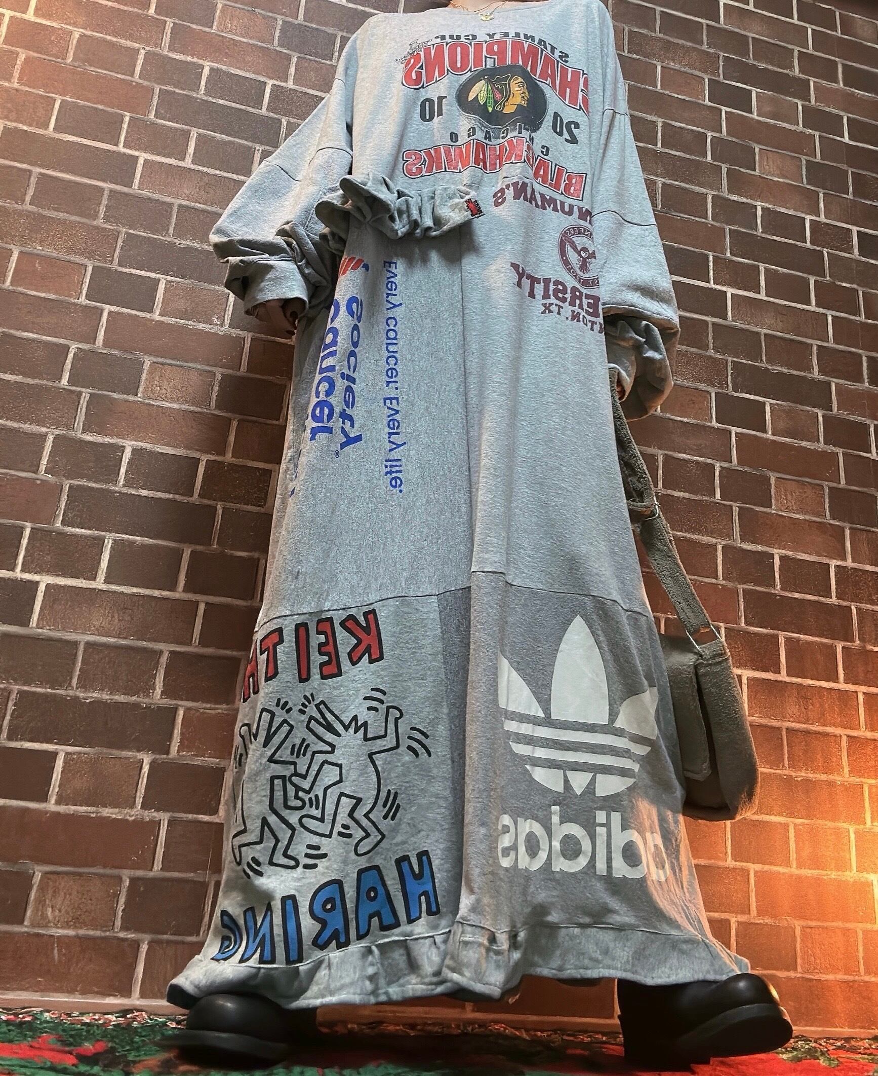 古着Tシャツや、スエットを使用して制作したリメイクのパッチワークワンピースです⭐︎