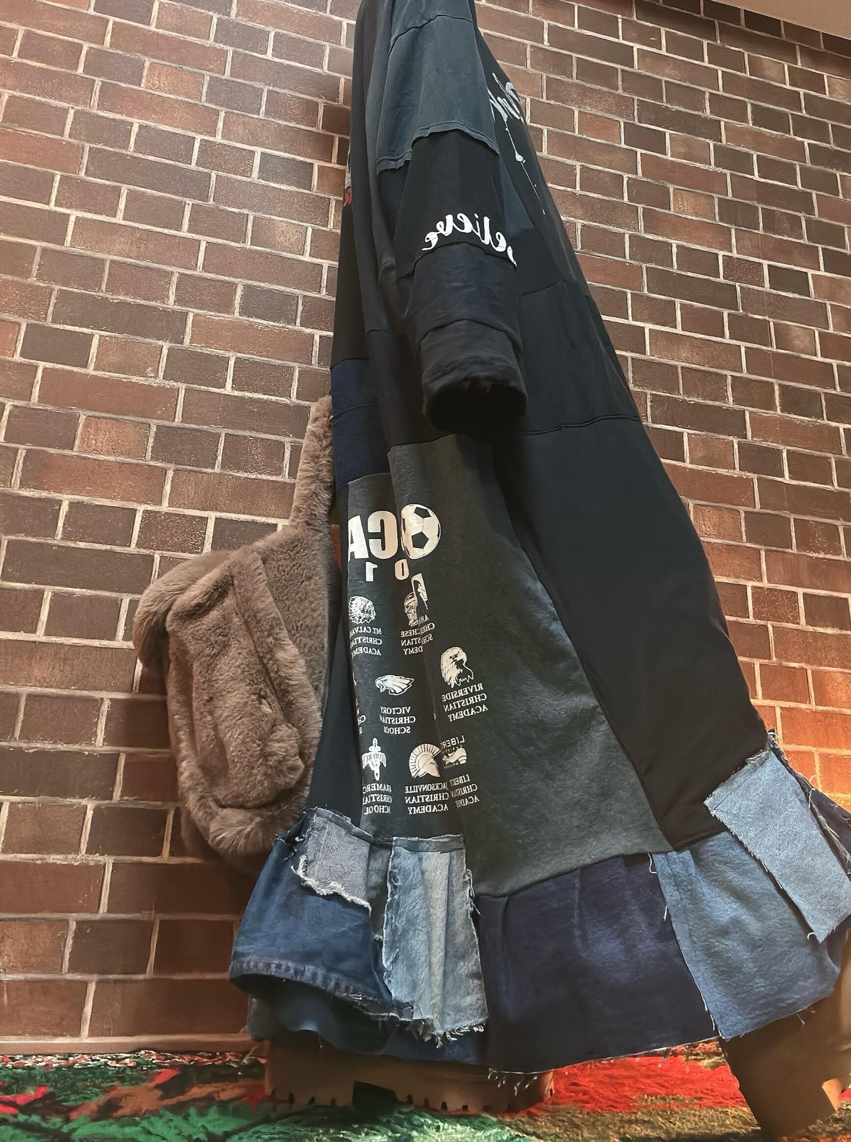 海外古着Tシャツやデニムを使用して製作したリメイクのパッチワークワンピースです⭐︎