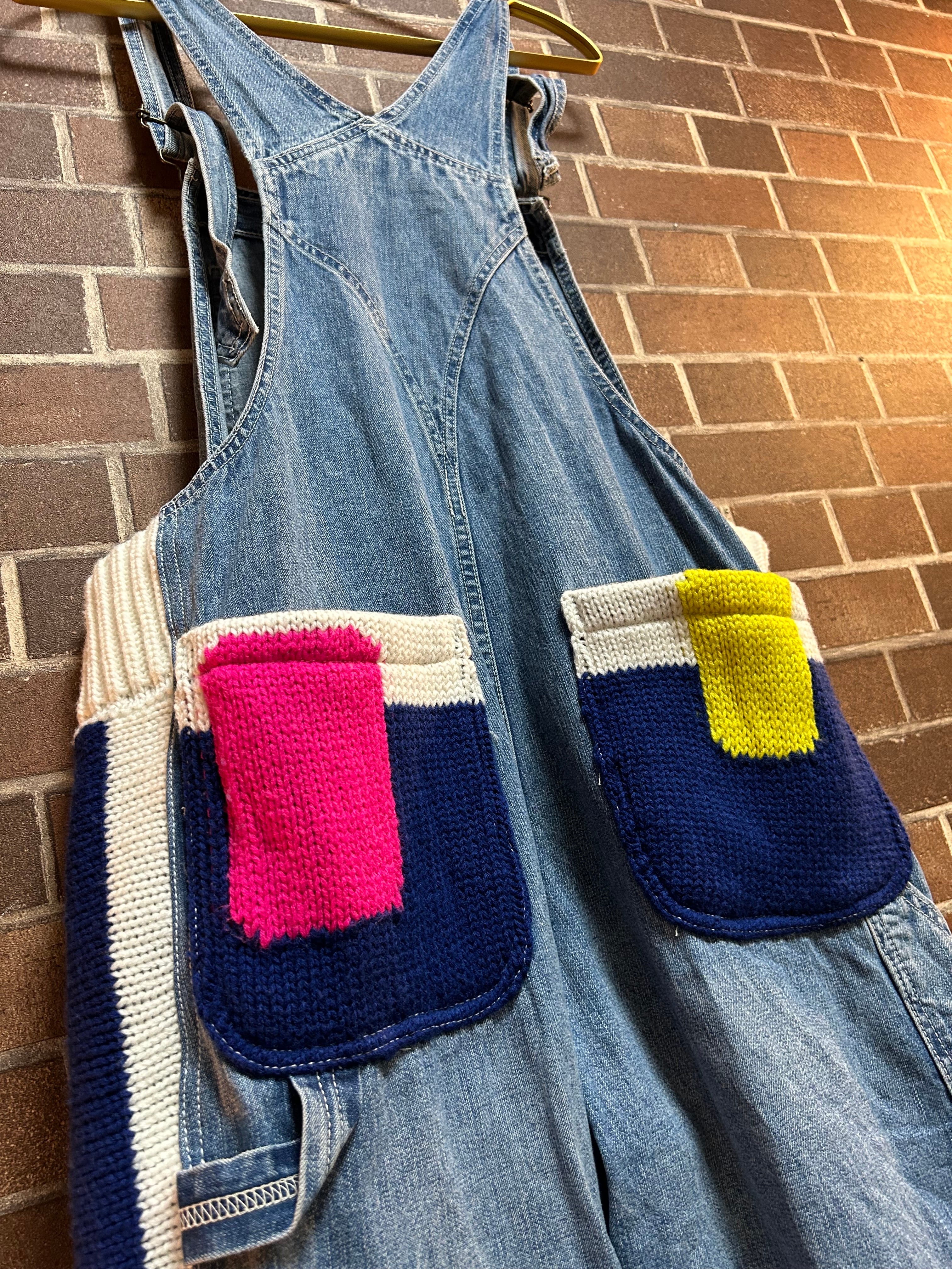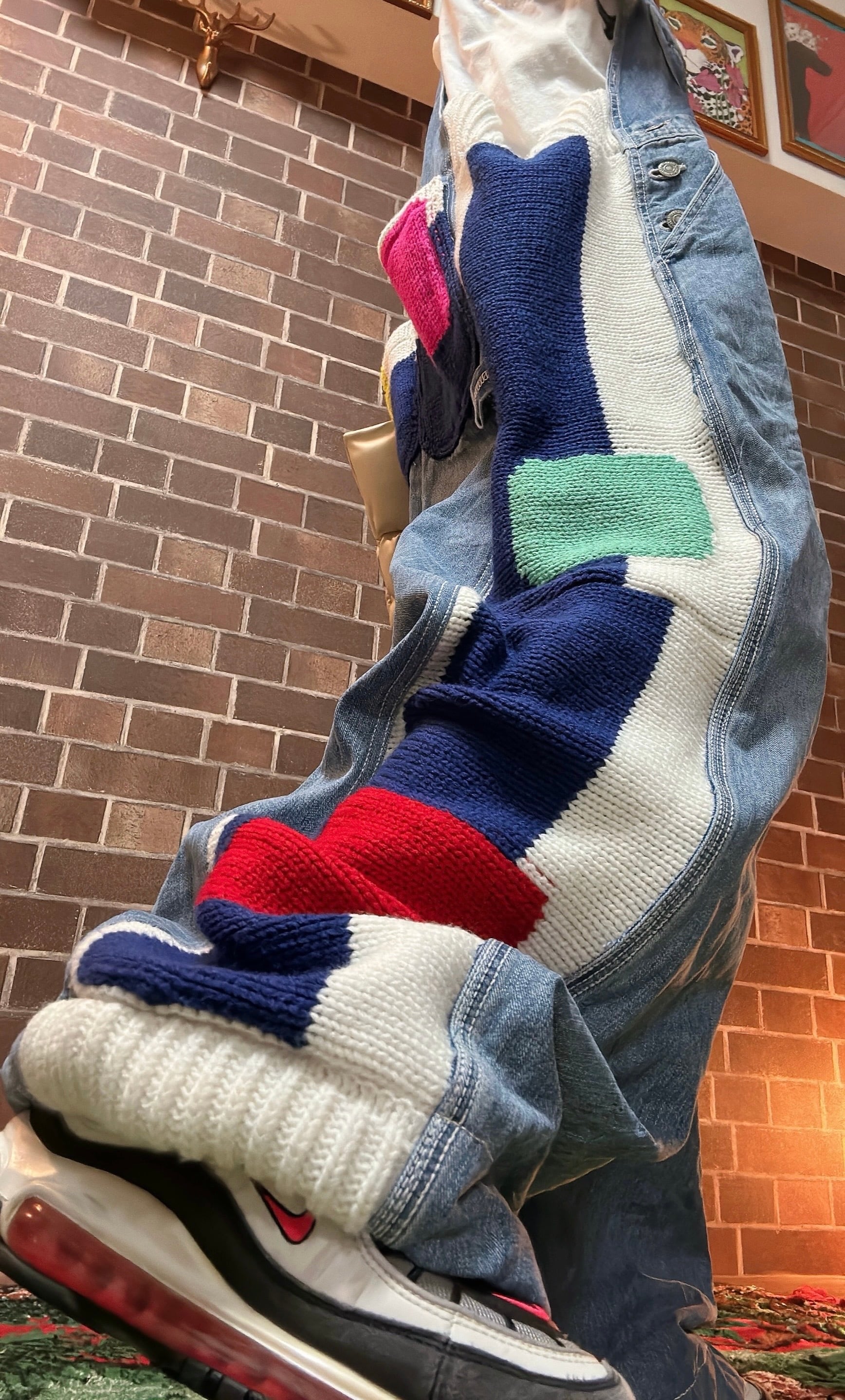 ビンテージニットを使用して製作したリメイクのデニムオーバーオールです⭐︎