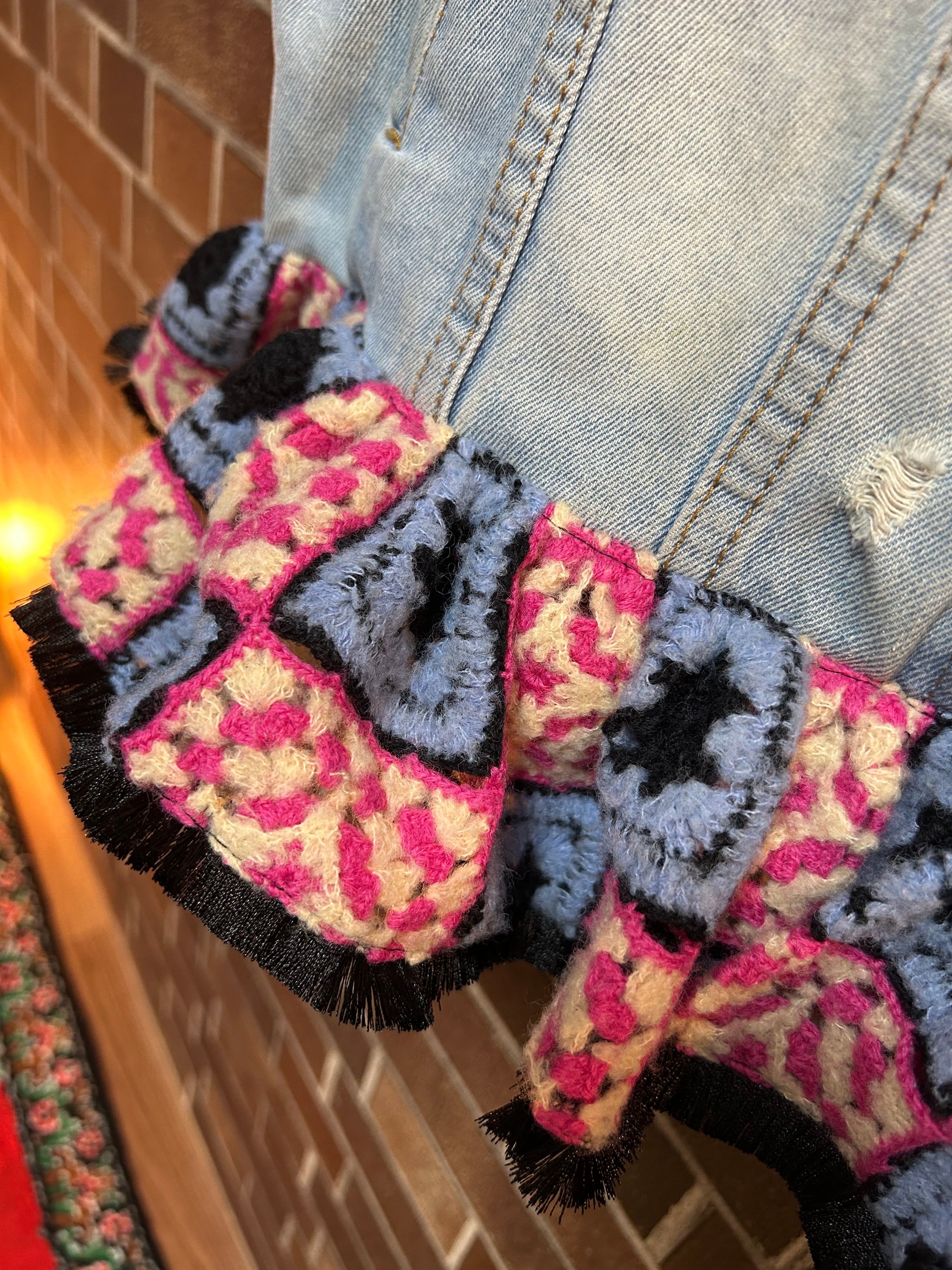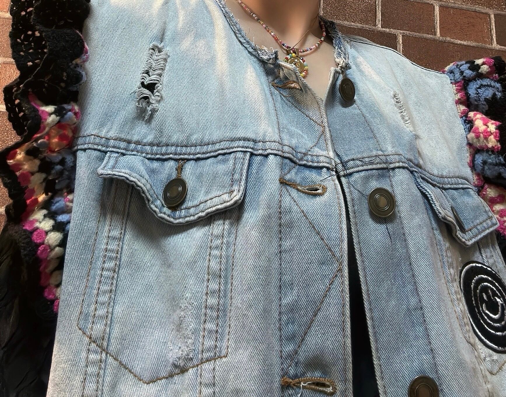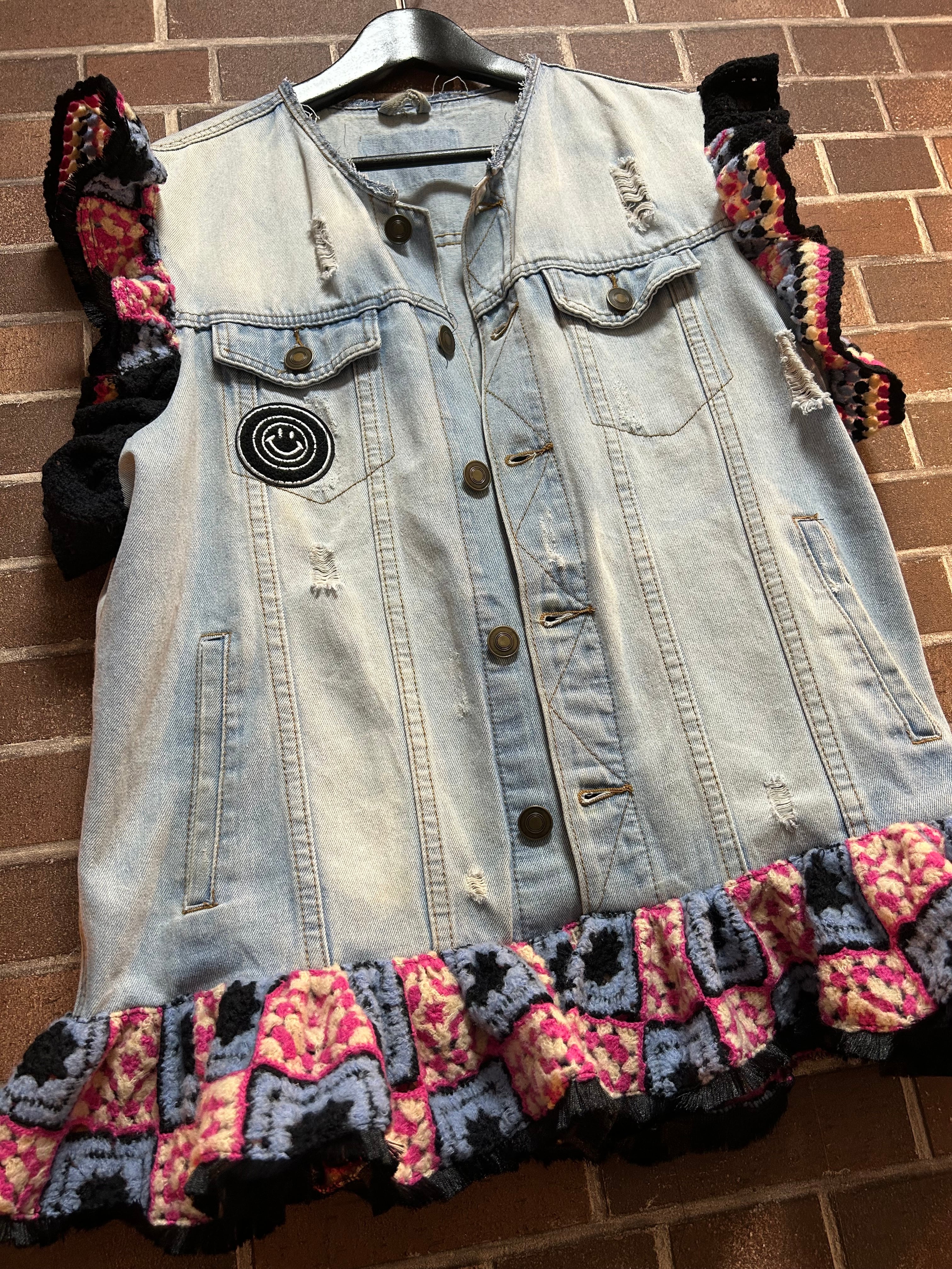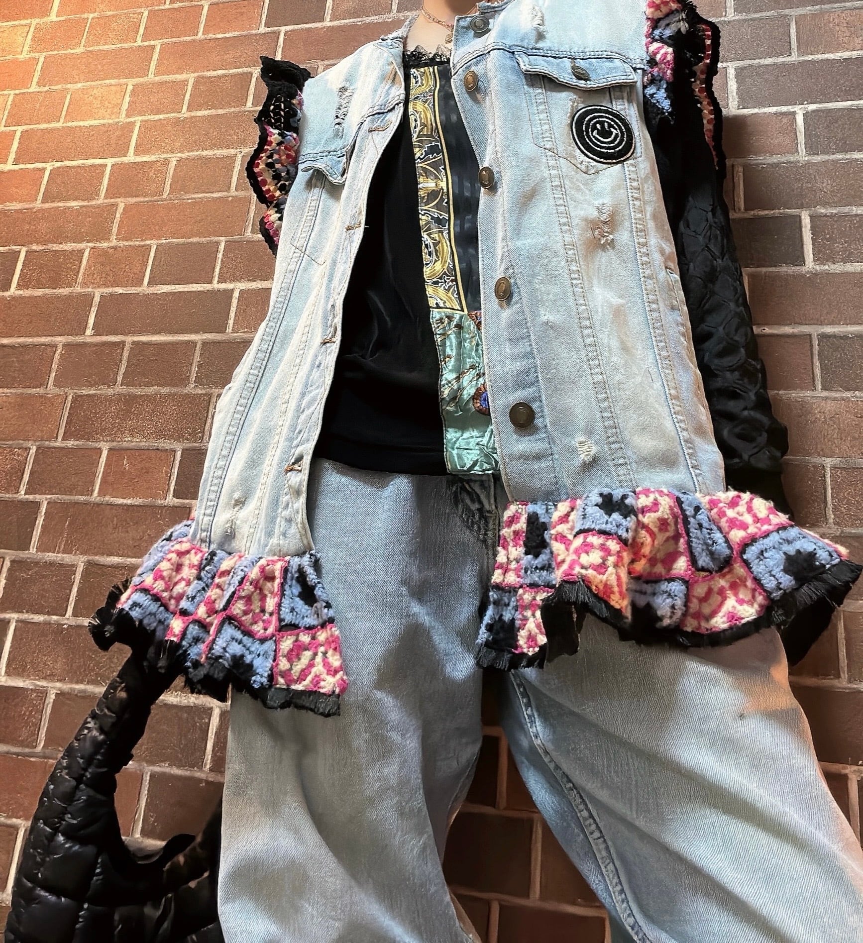鍵編みニットとデニムをドッキングしたリメイクのフリルベストです⭐︎