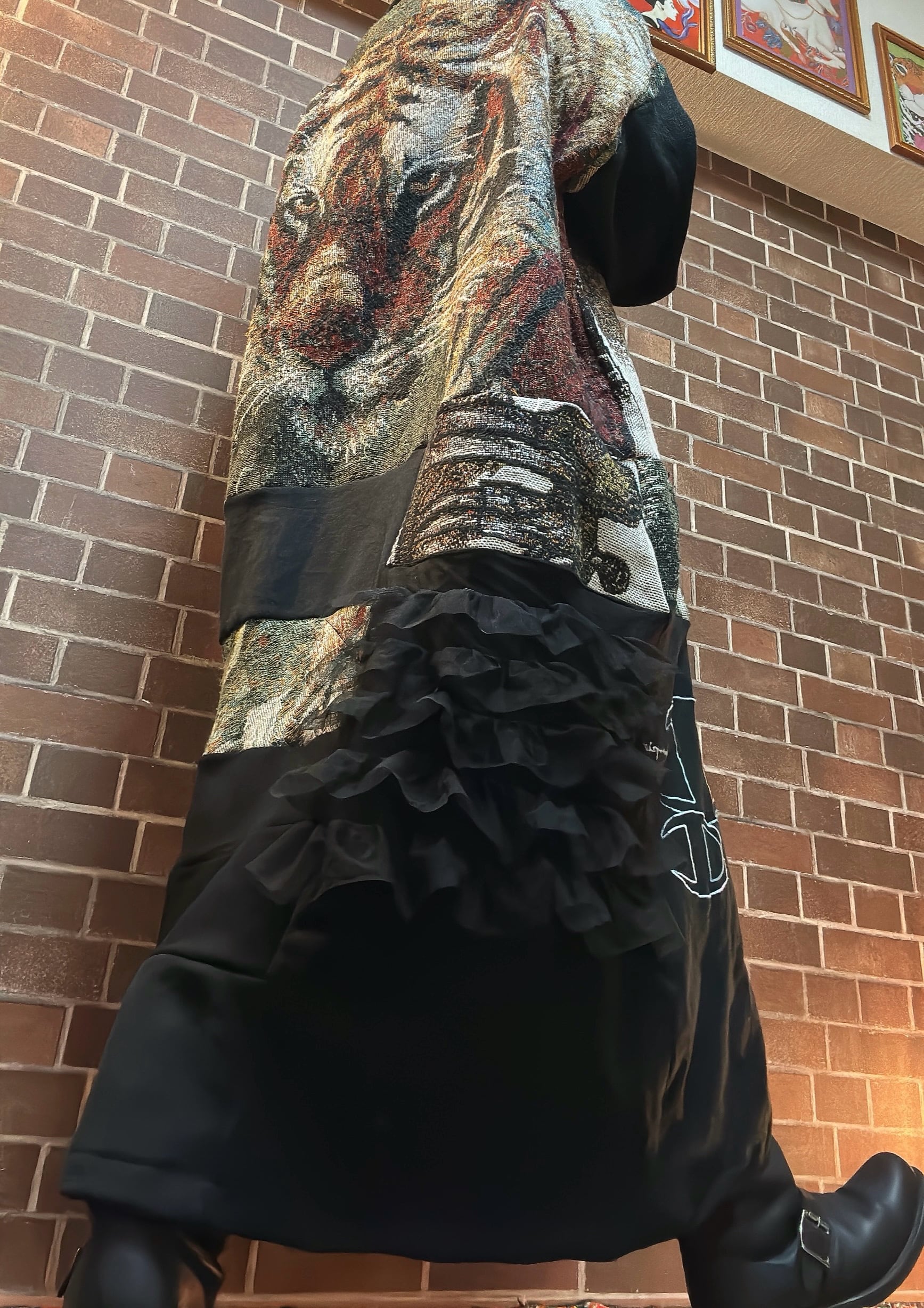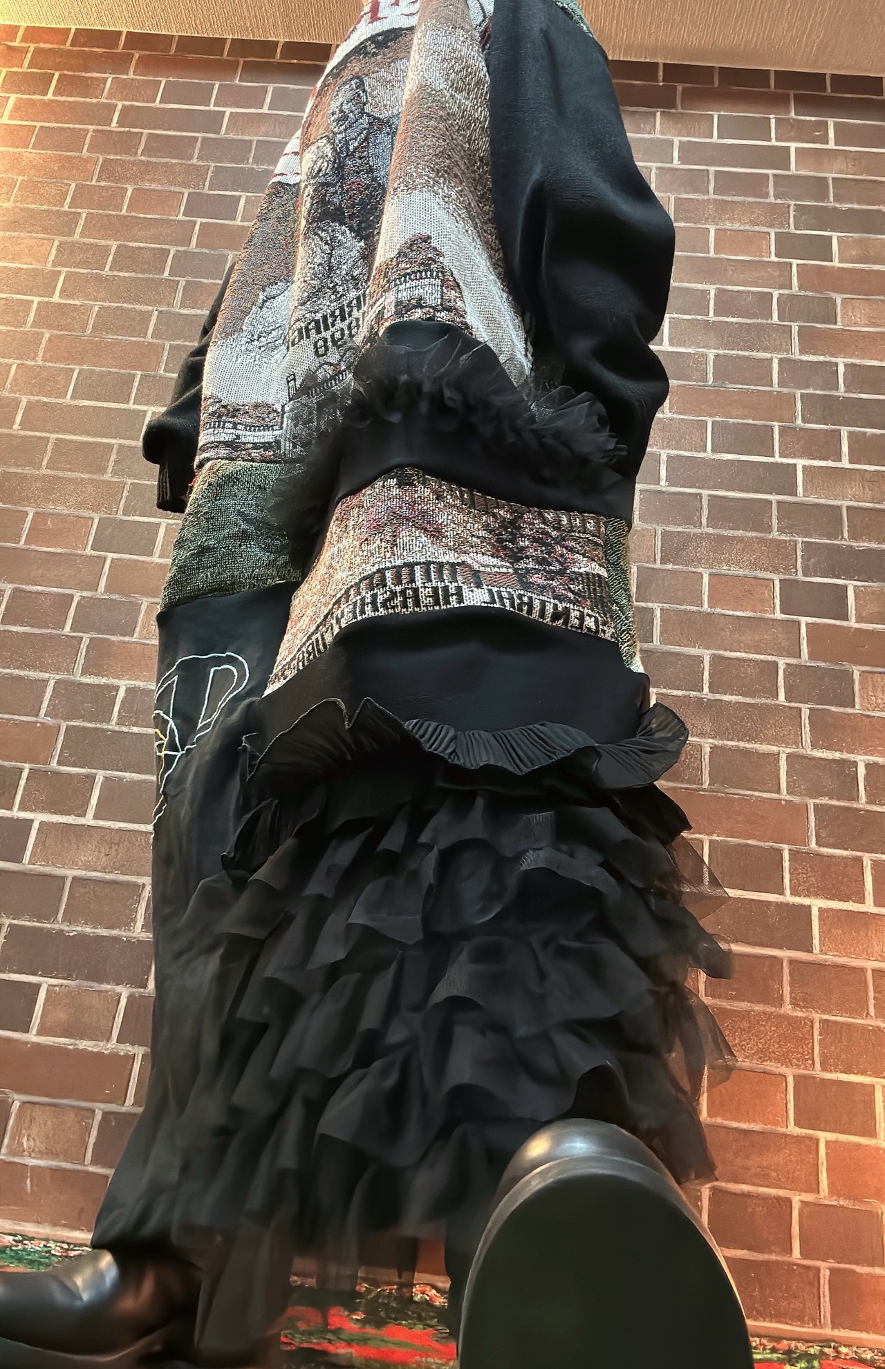 海外のビンテージ古着ラグを使用して制作したリメイクのパッチワークフリルワンピースです⭐︎