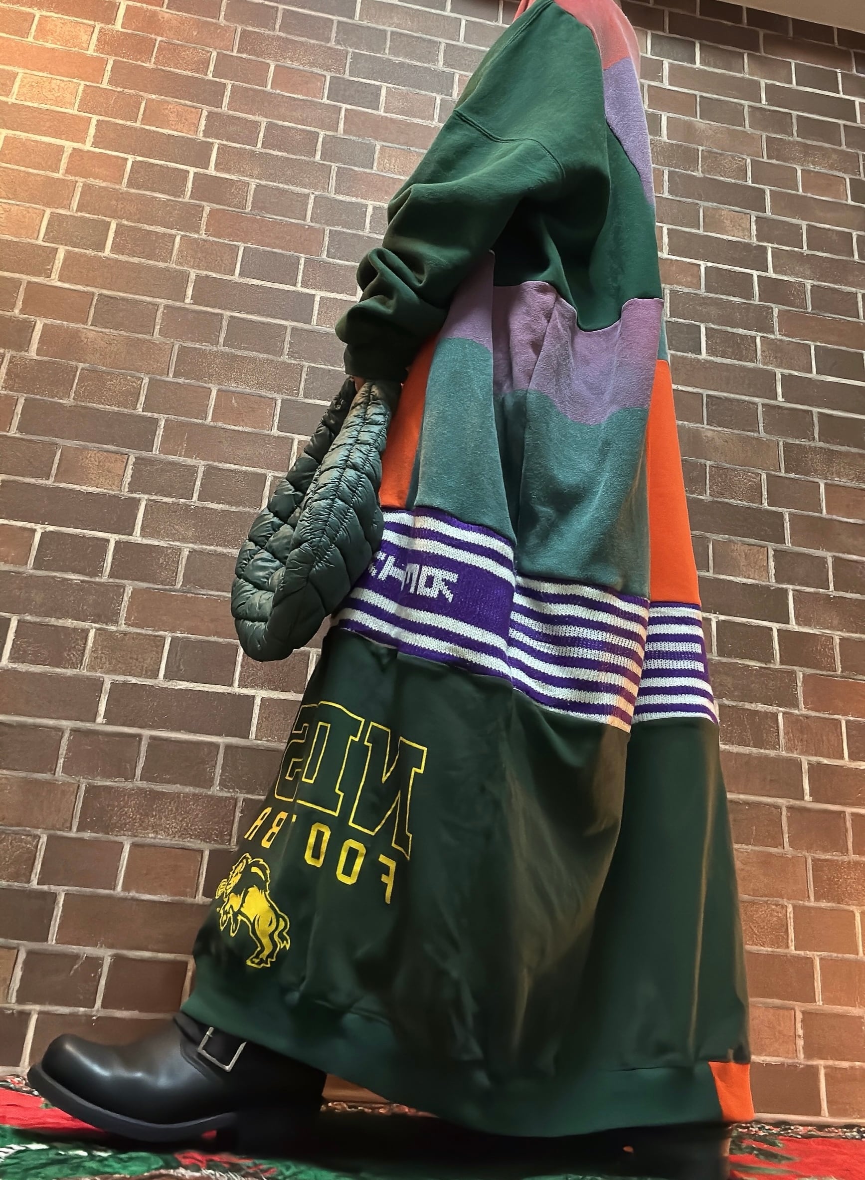 古着のスエットや、ニットを使用して制作したリメイクのパッチワークワンピースです⭐︎