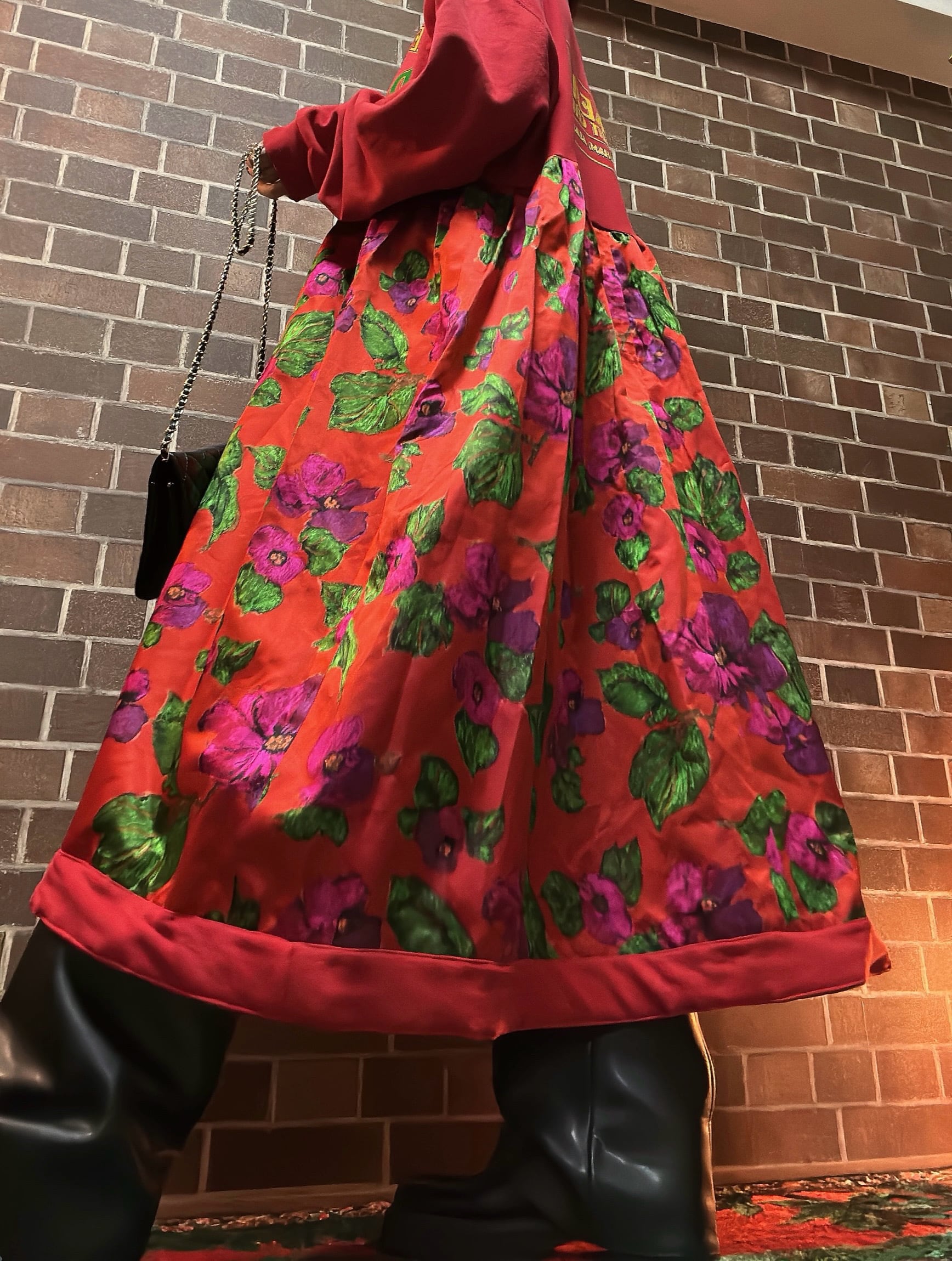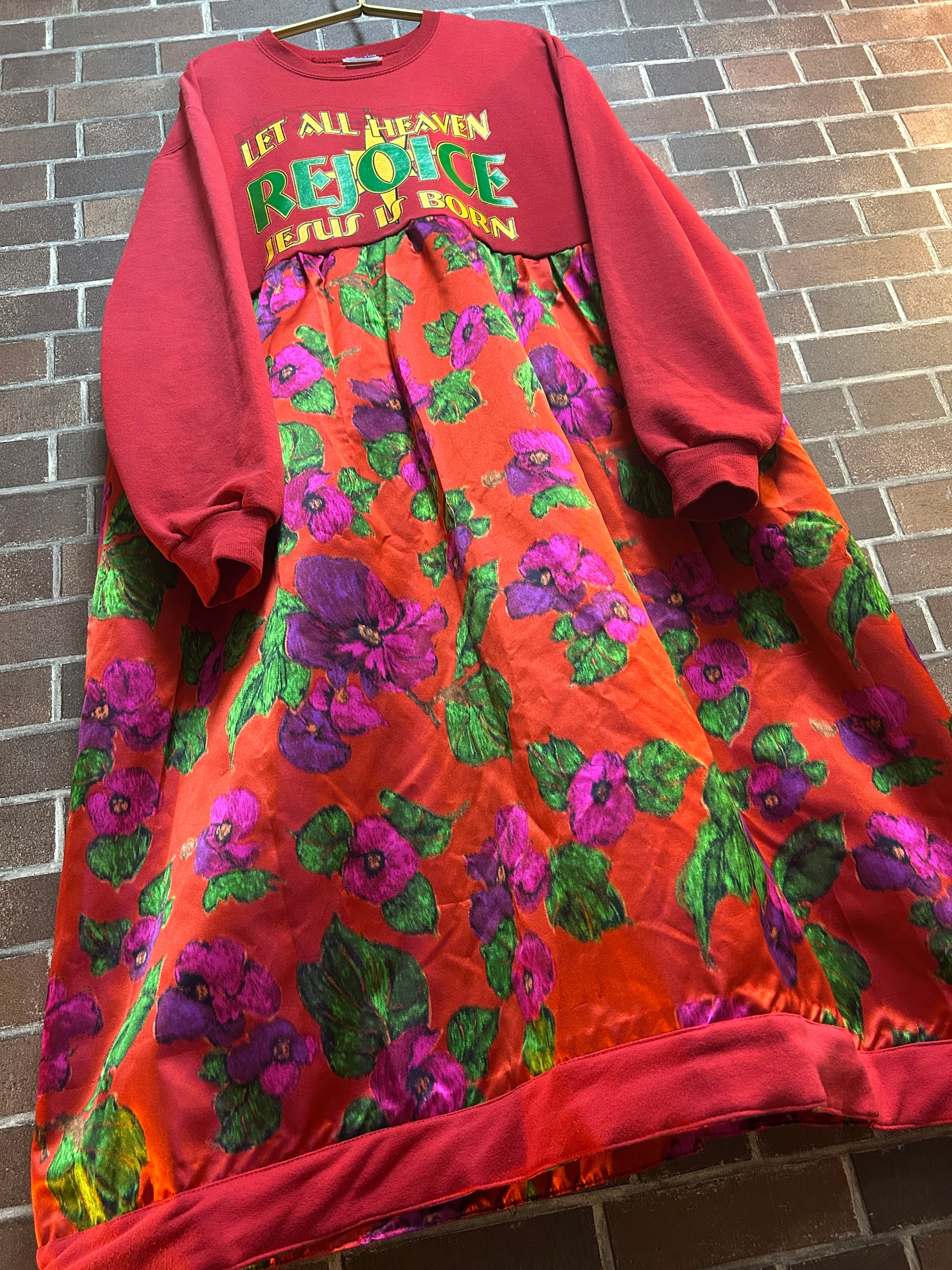 海外古着スエットとビンテージフラワーワンピースをドッキングして制作したリメイクのワンピースです⭐︎