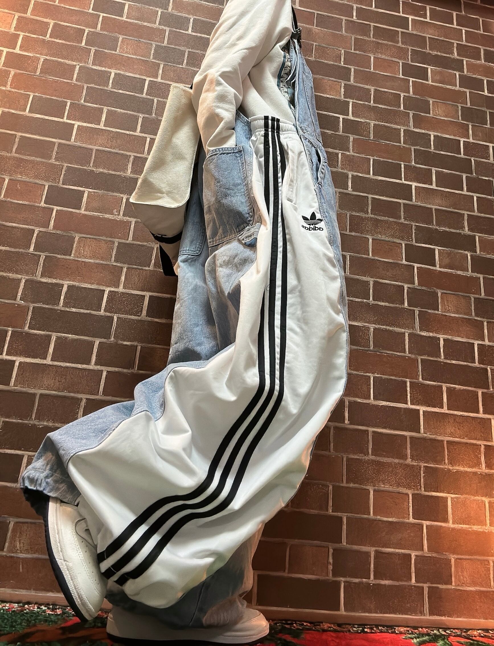 古着デニムとラインジャージを使用して制作したリメイクのドッキングオーバーオールです。