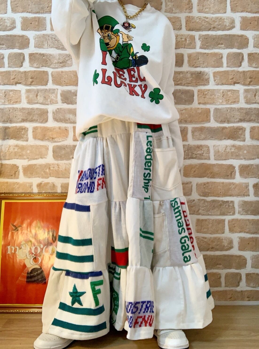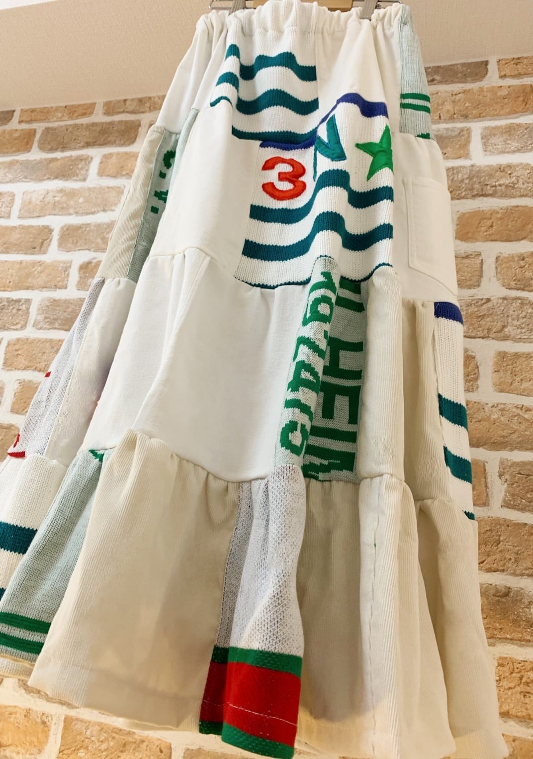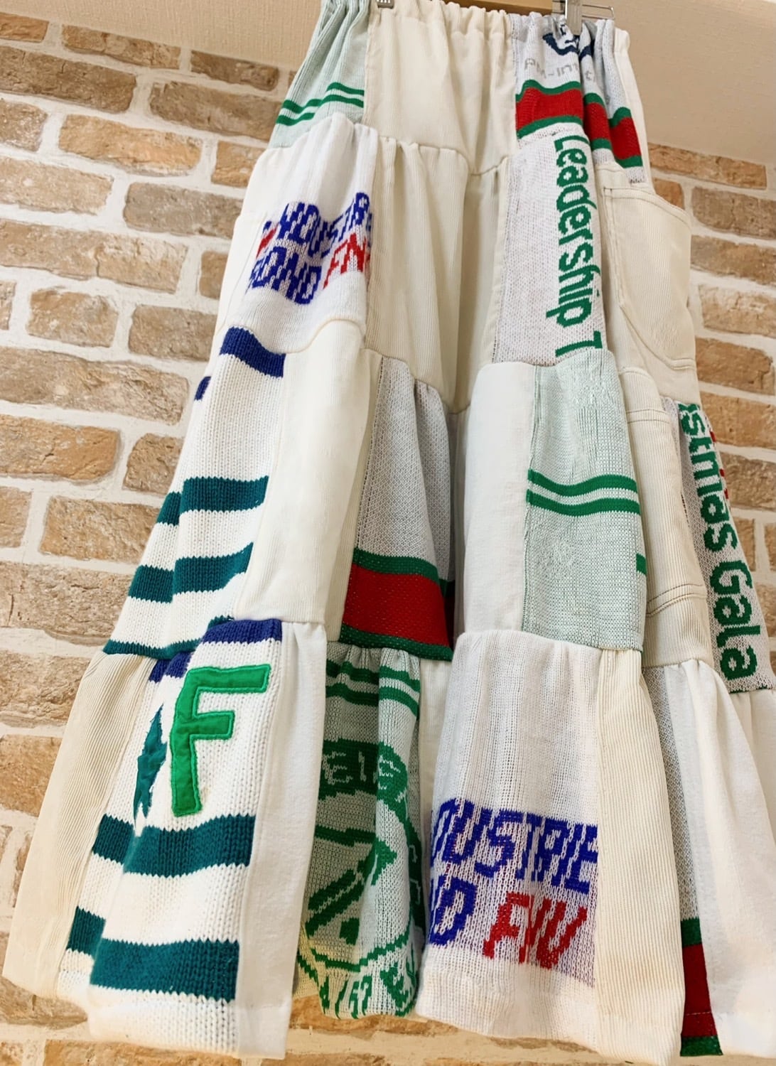 海外古着のニットやコーデュロイを使用して制作したリメイクのパッチワークスカートです⭐︎