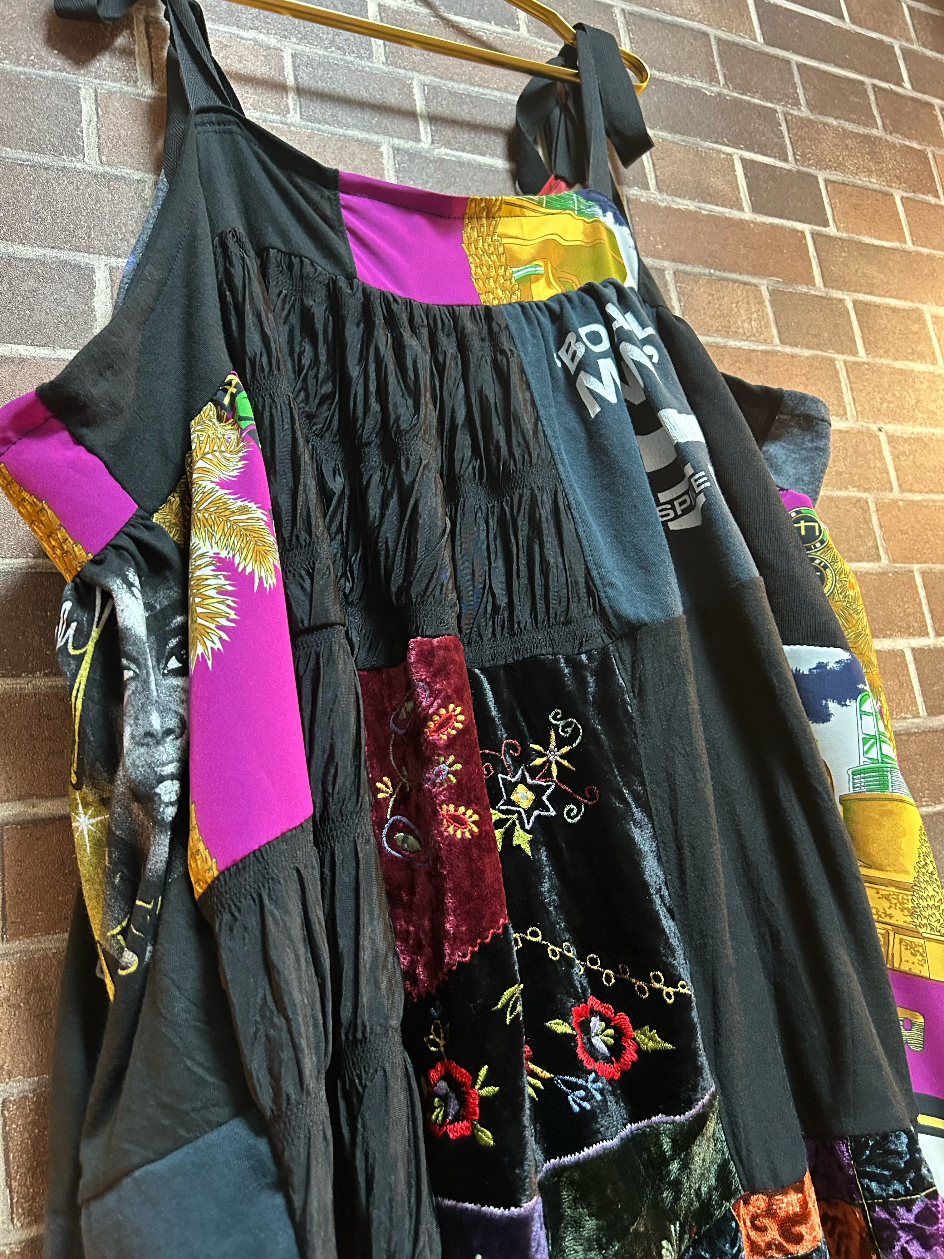 ビンテージジャケットや海外古着Tシャツ、ベロアなど色々な素材を使用して制作したリメイクのキャミソールワンピースです⭐︎