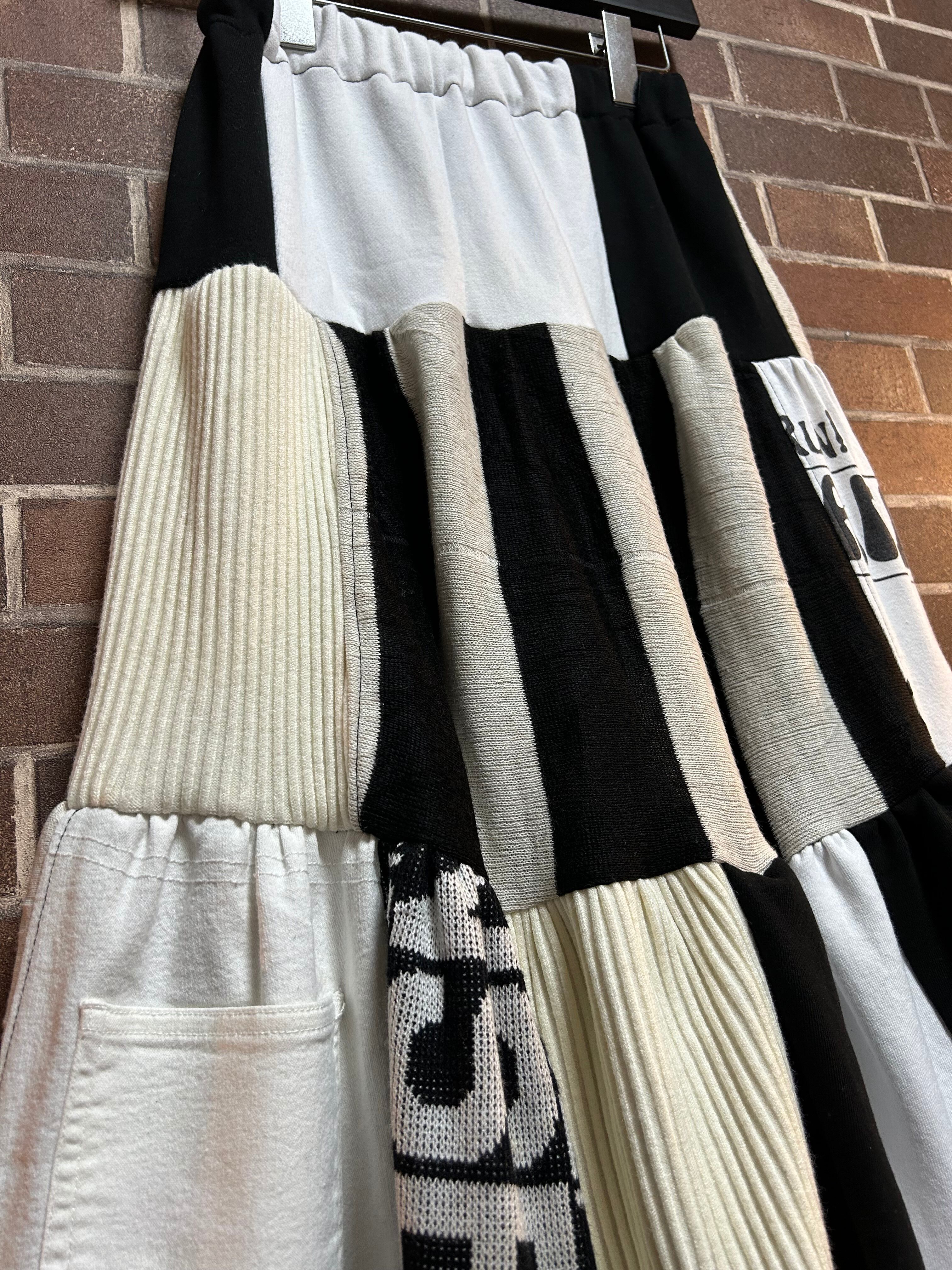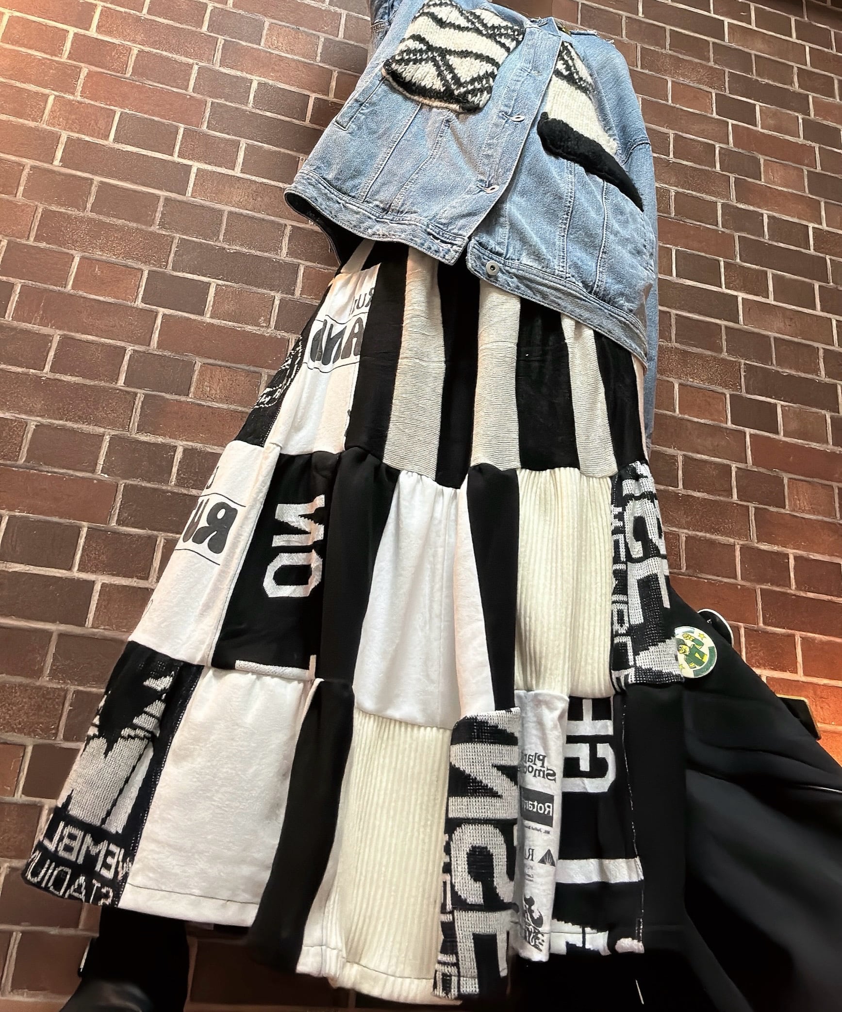 海外古着のスエットやTシャツ、ニット、コーデュロイなどの素材を使用して制作したリメイクのパッチワークスカートです。