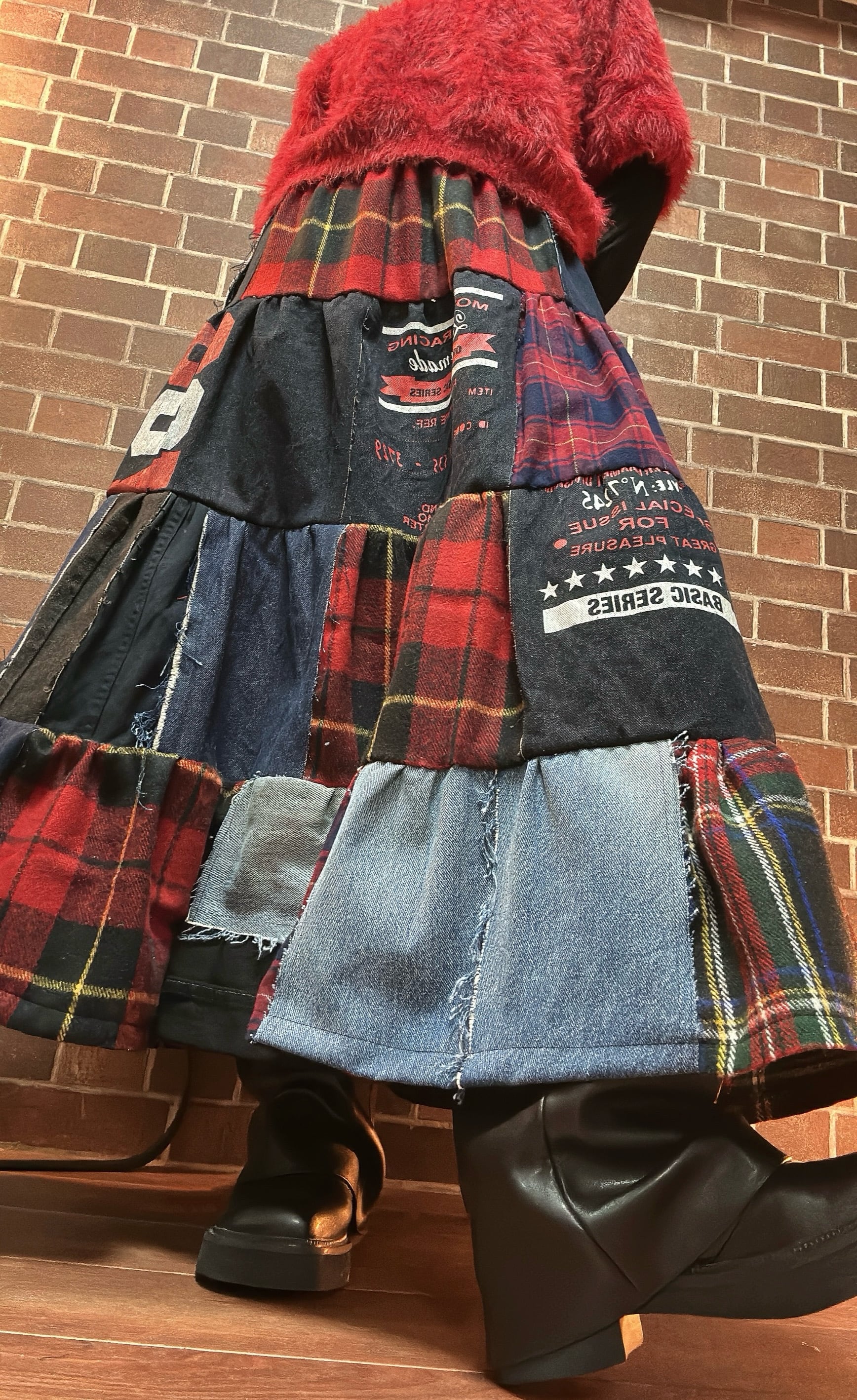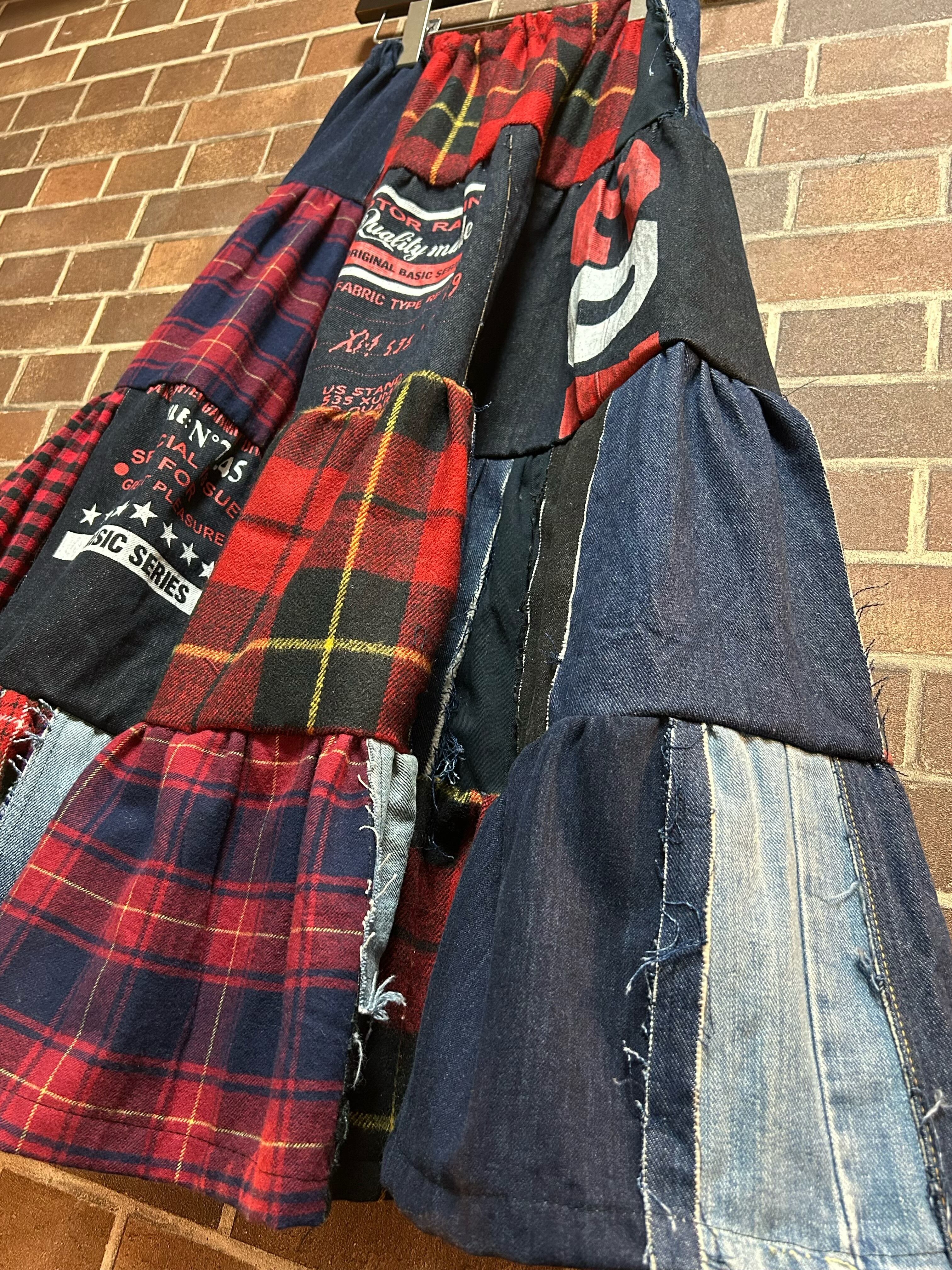古着のデニムやチェックシャツを使用して制作したリメイクのパッチワークスカートです⭐︎
