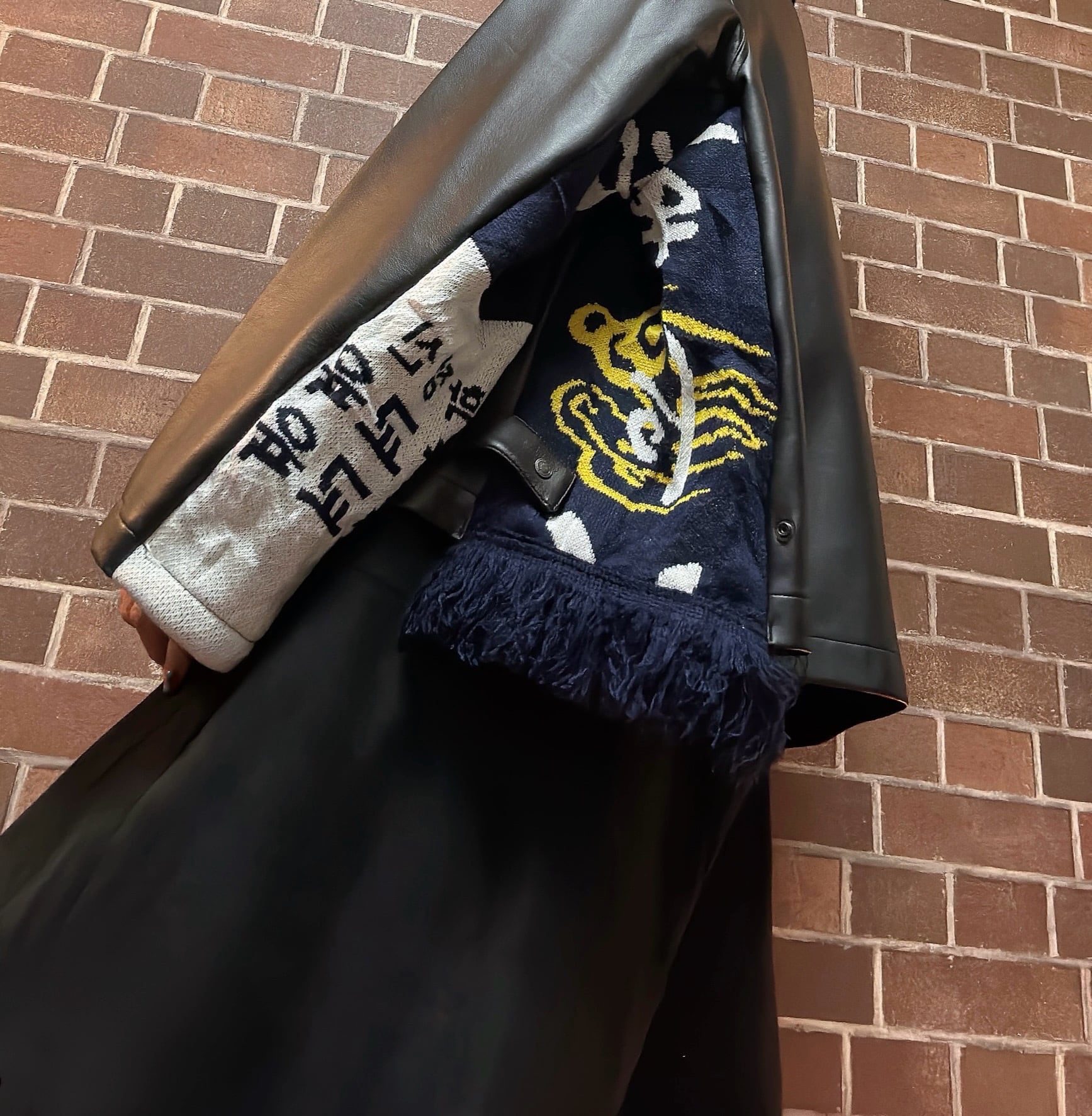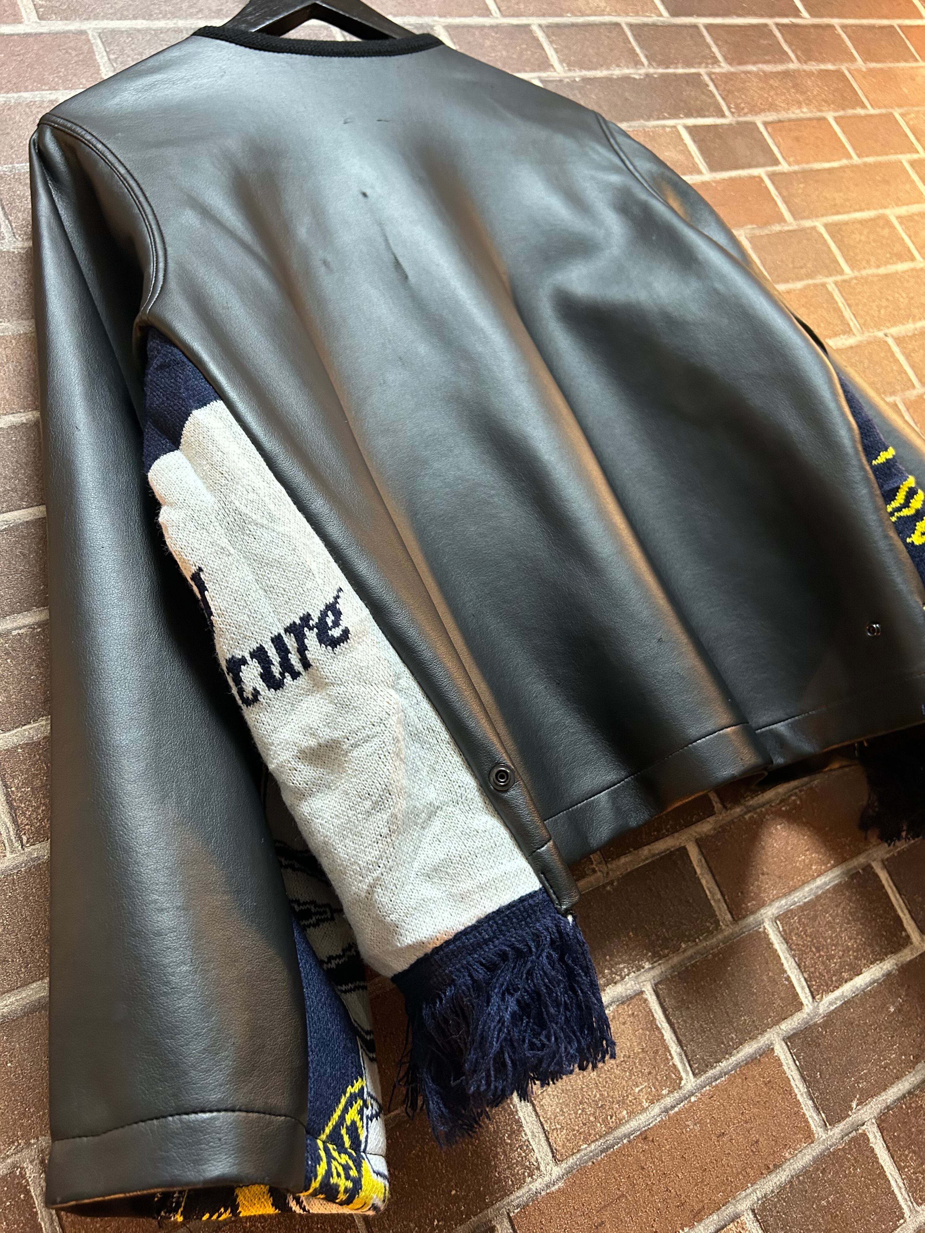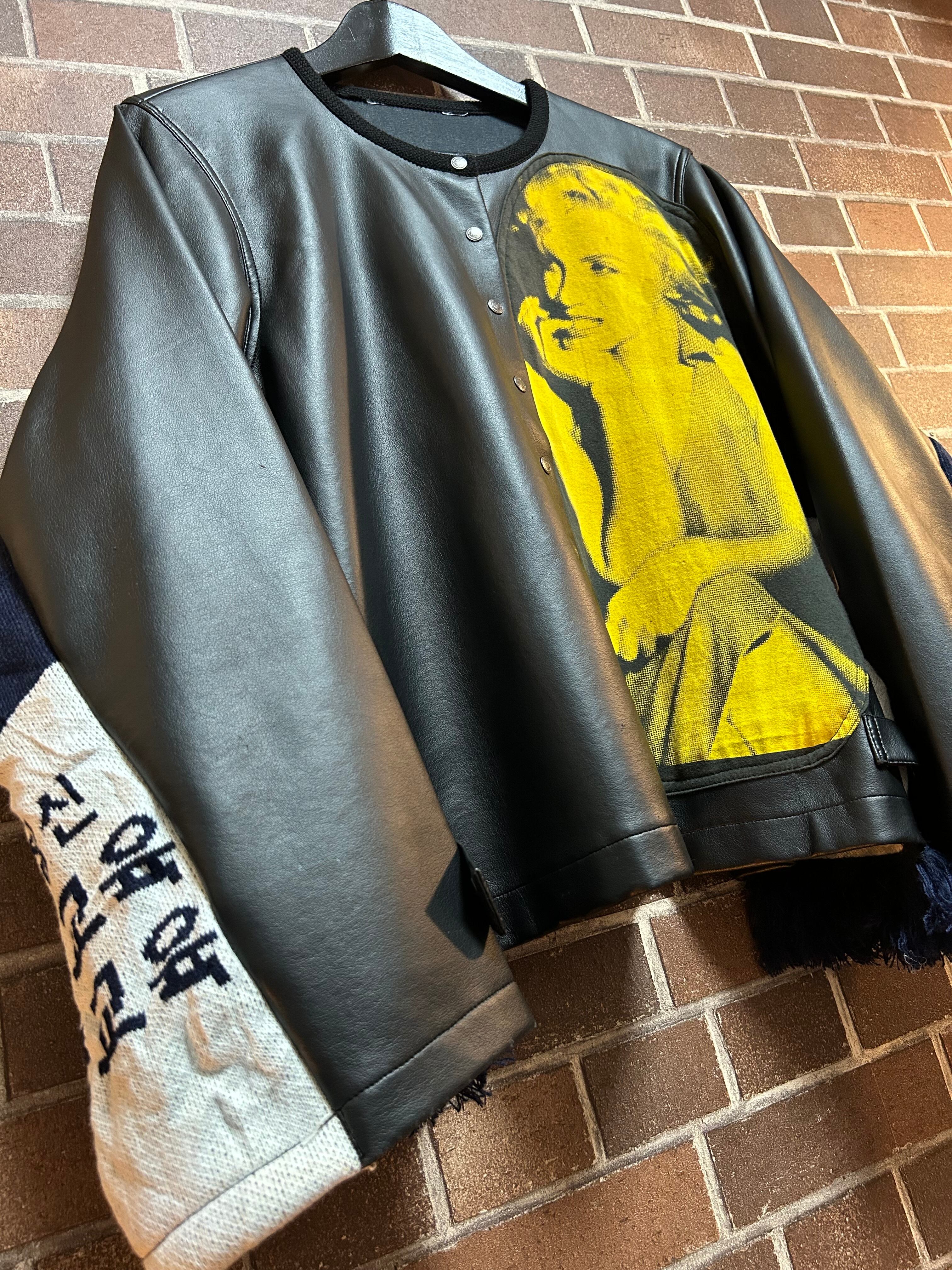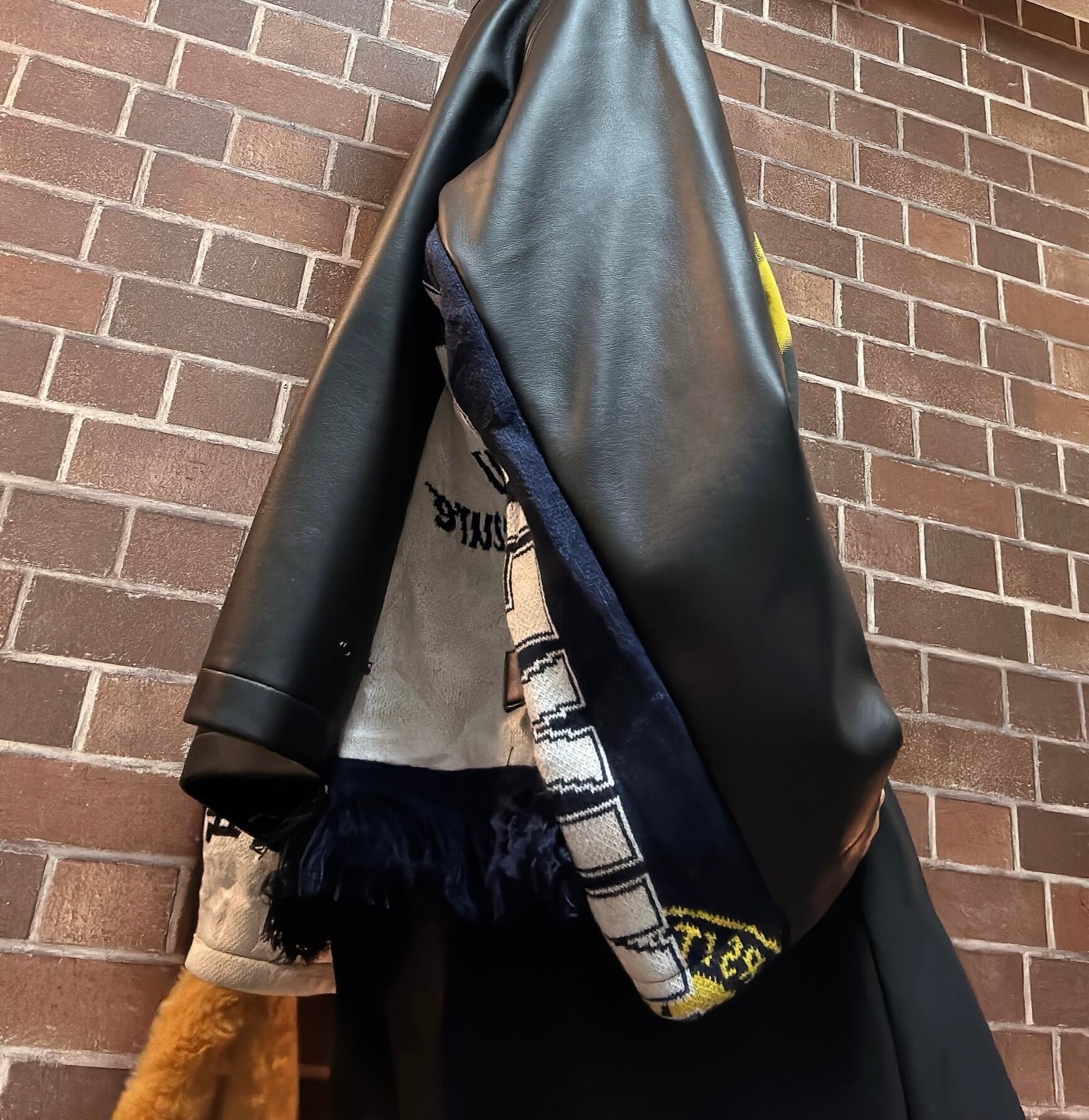 US古着Tシャツや、マフラーを使用して制作したリメイクのフェイクレザージャケットです⭐︎