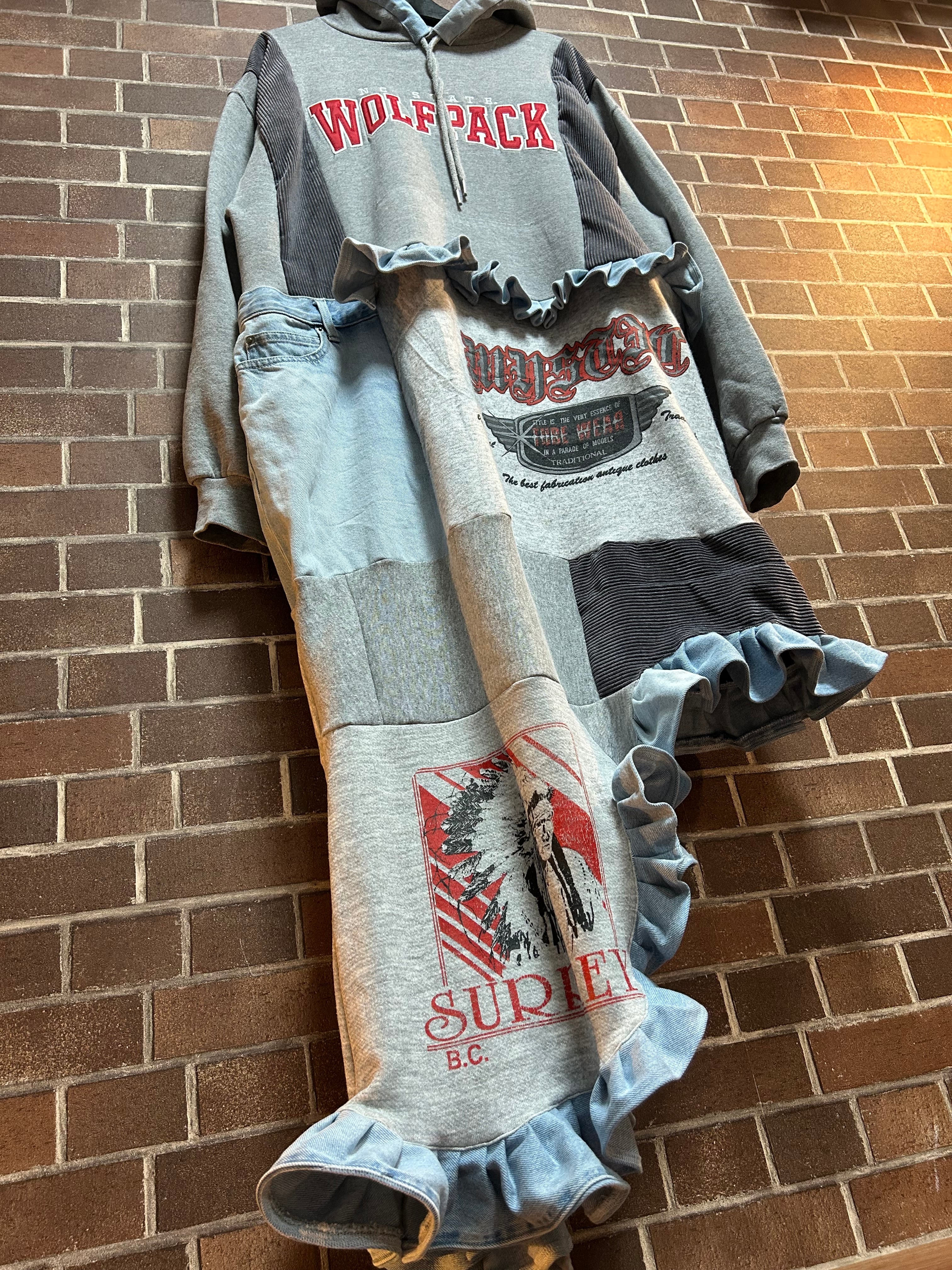海外古着やデニムを使用して制作したリメイクのアシメフリルパーカーワンピースです⭐︎