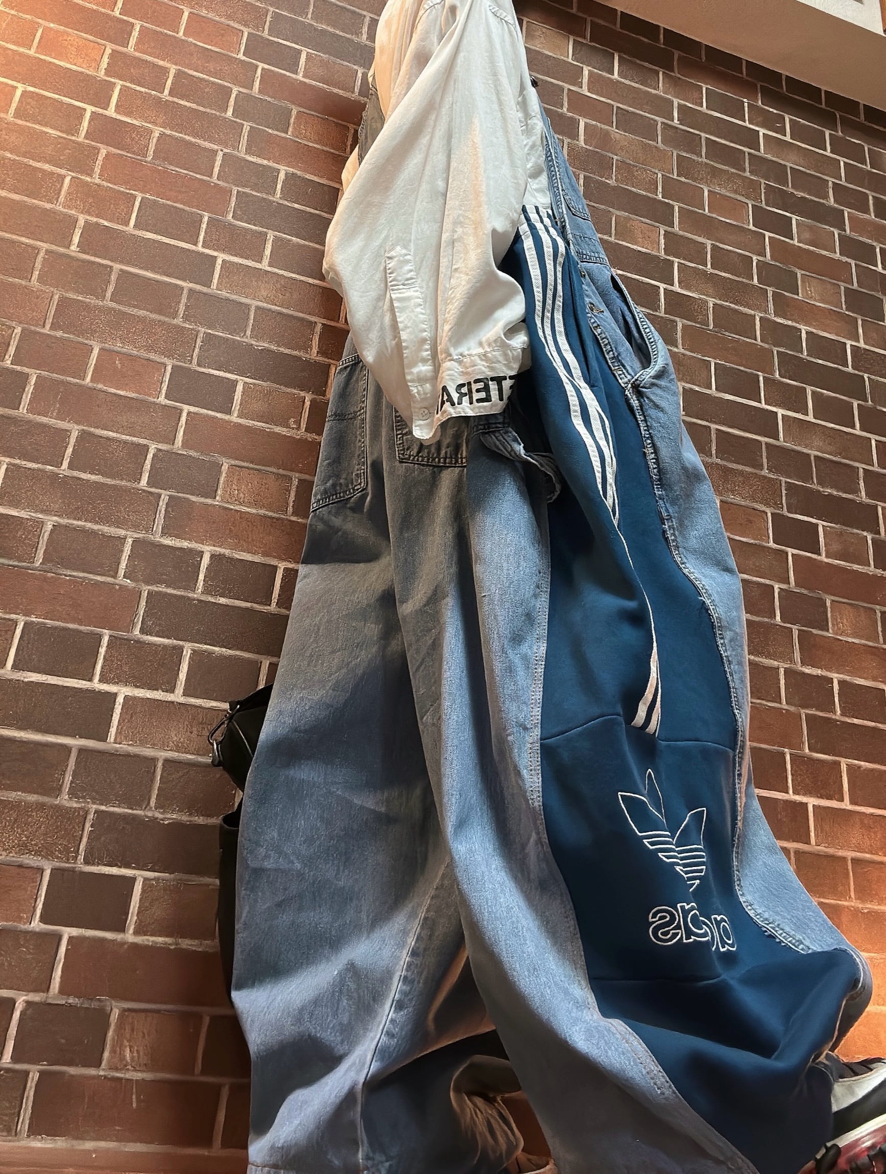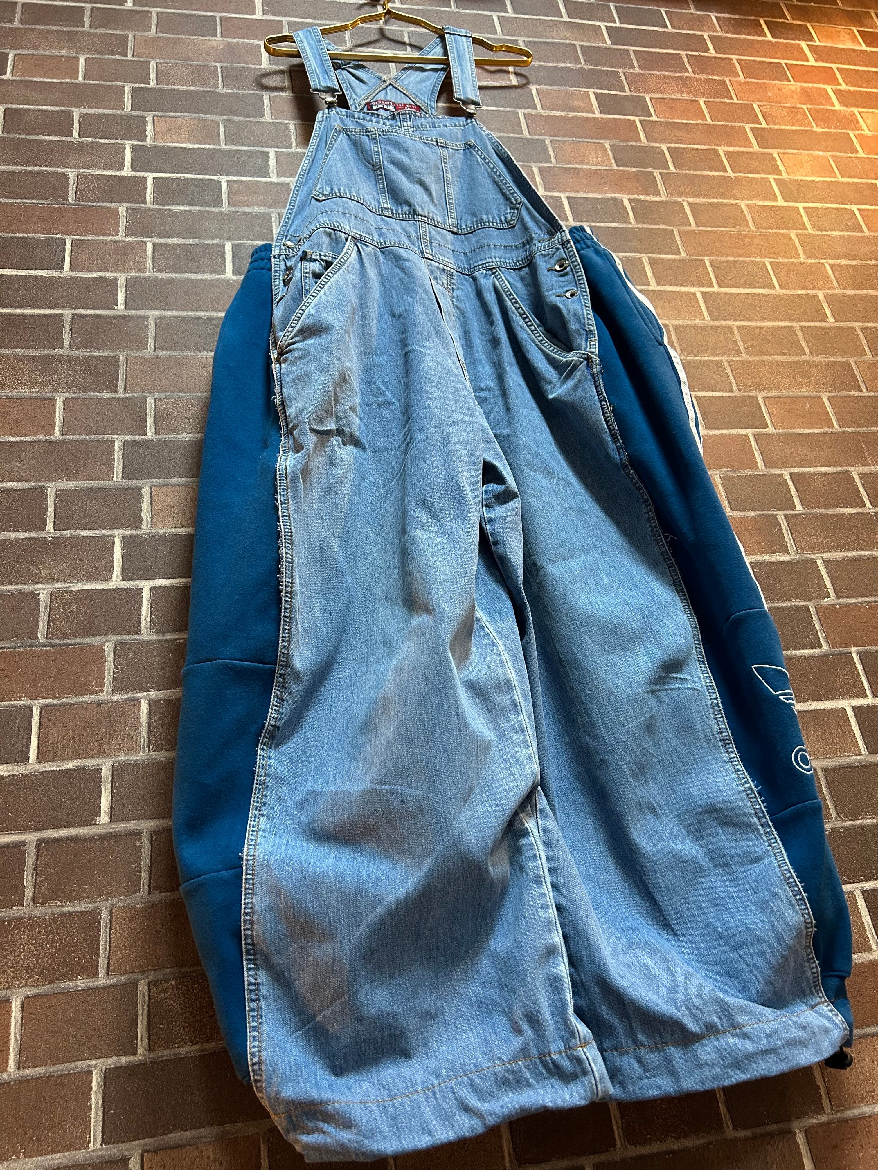 古着のスエットとデニムをドッキングして制作したリメイクのオーバーオールです⭐︎