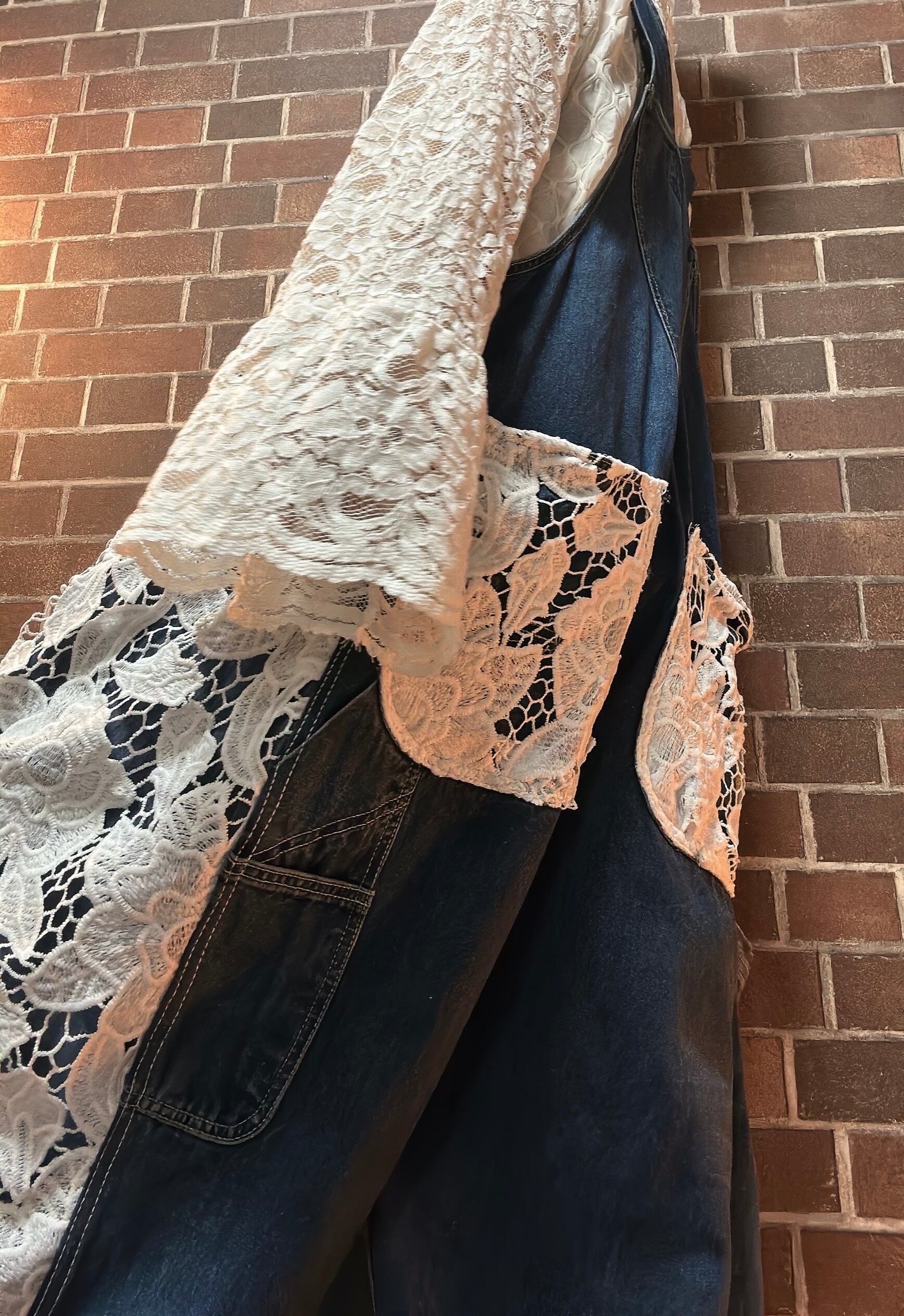 かぎ編みレースを使用して制作したリメイクの古着デニムオーバーオールです⭐︎