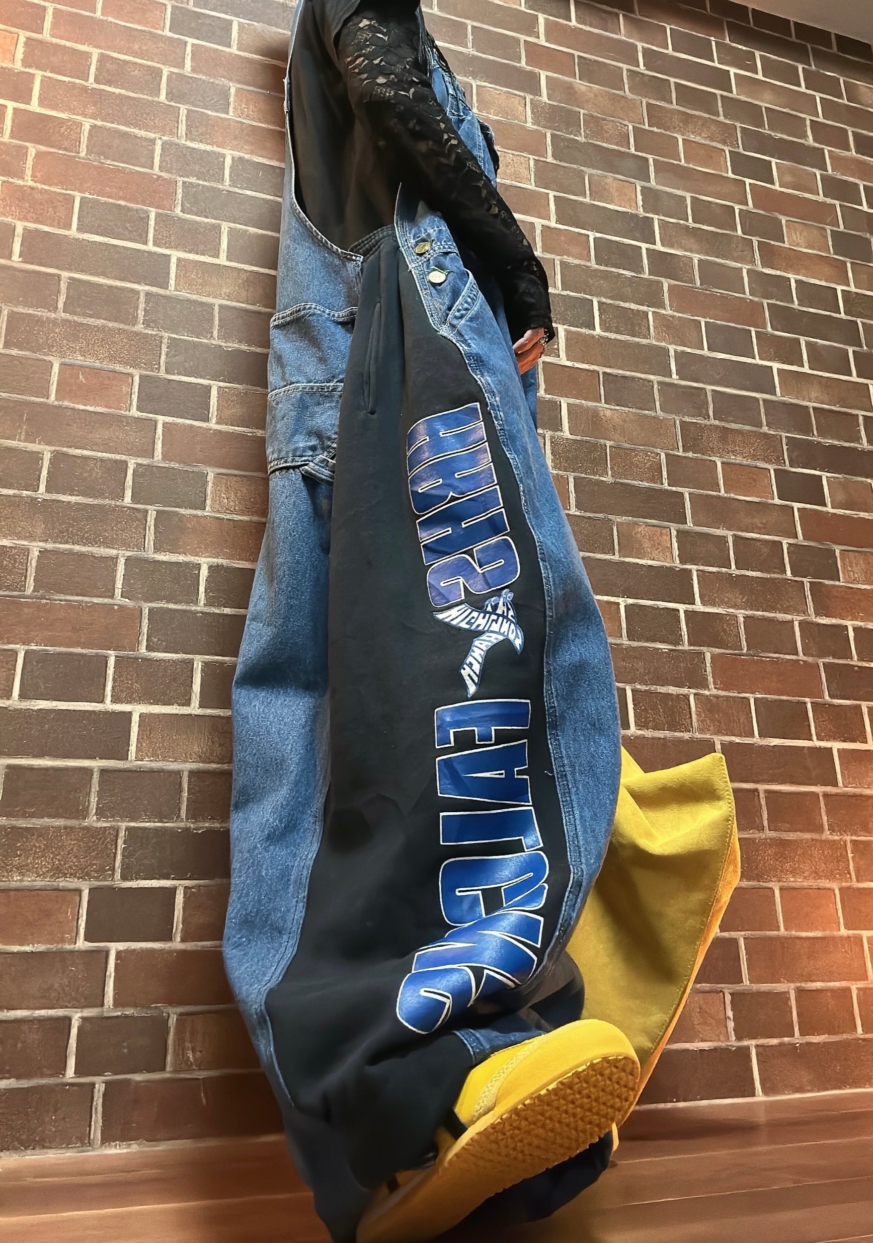 海外古着スエットを古着デニムとドッキングしたリメイクのオーバーオールです⭐︎