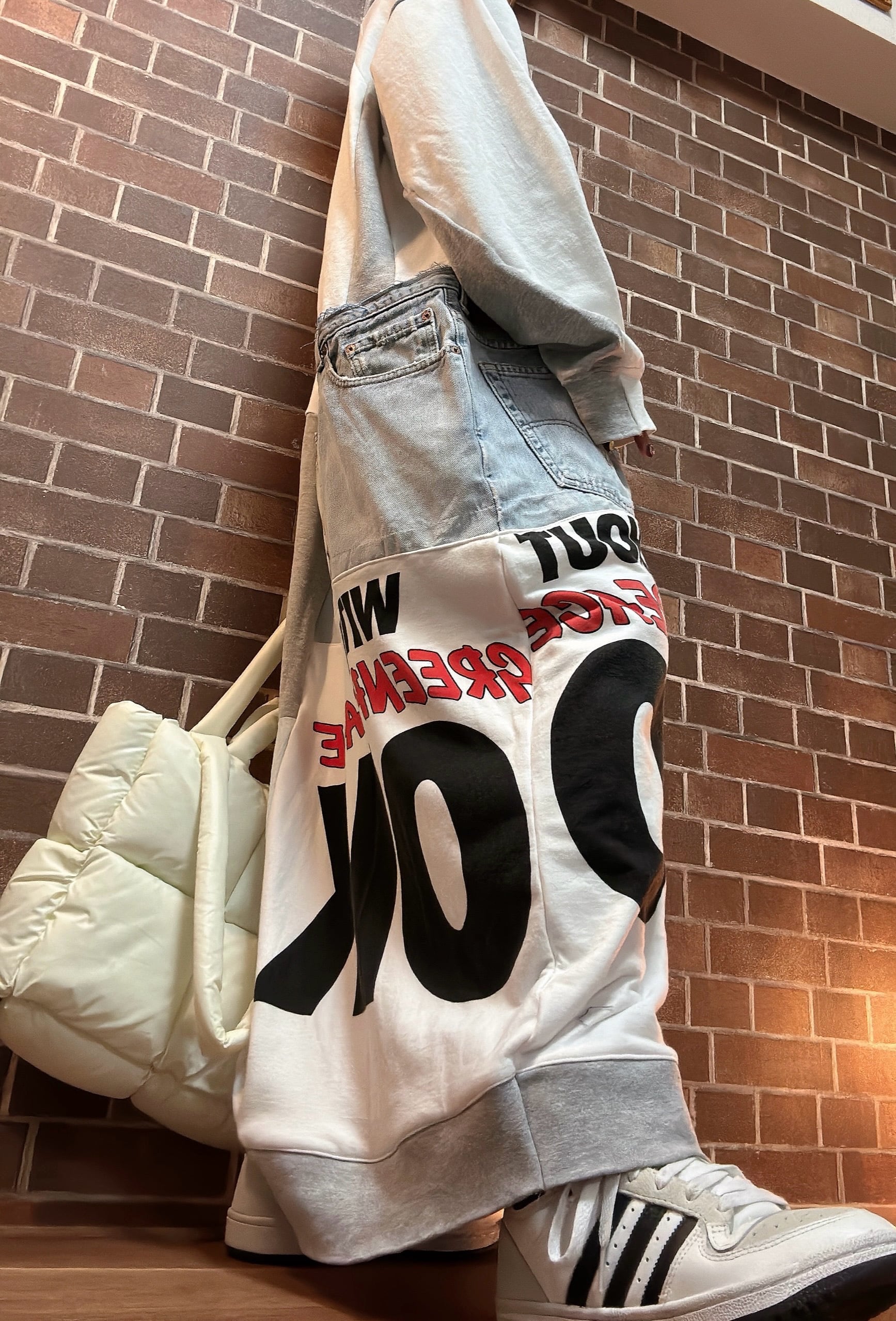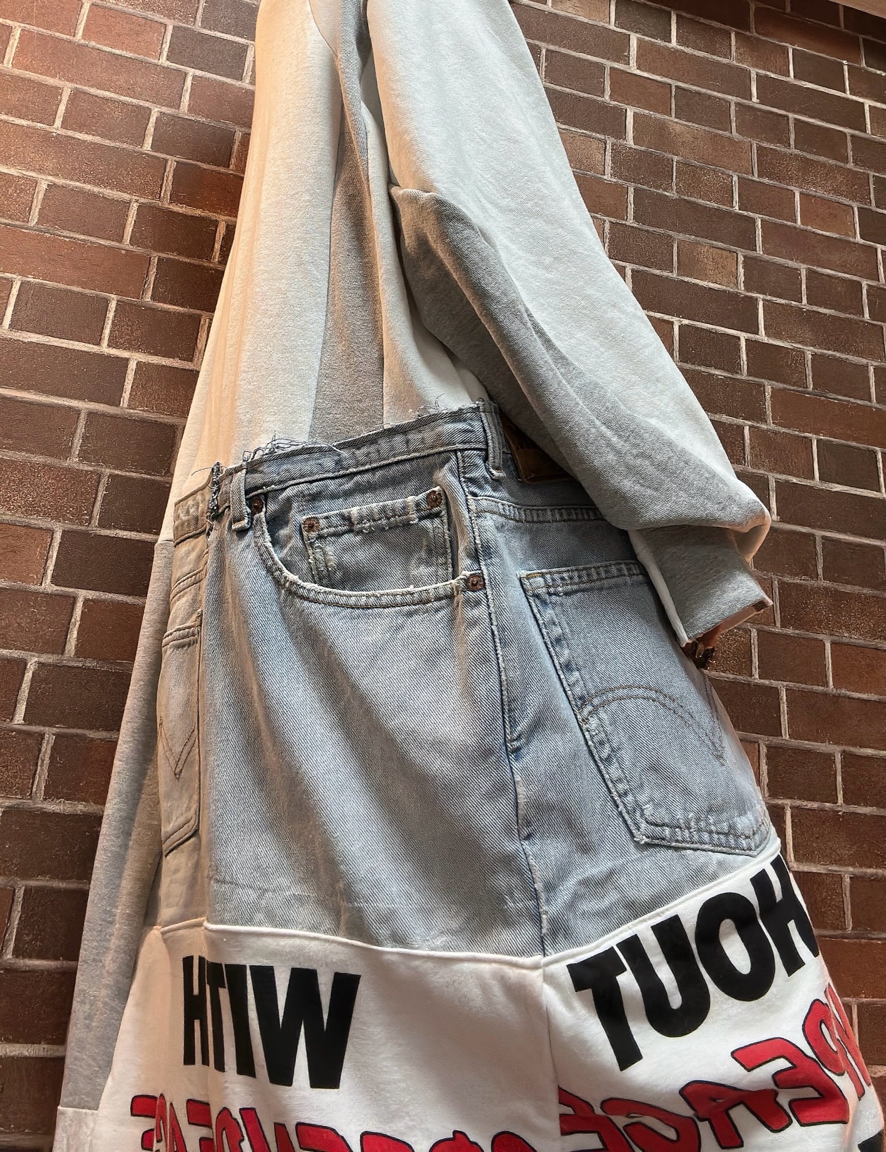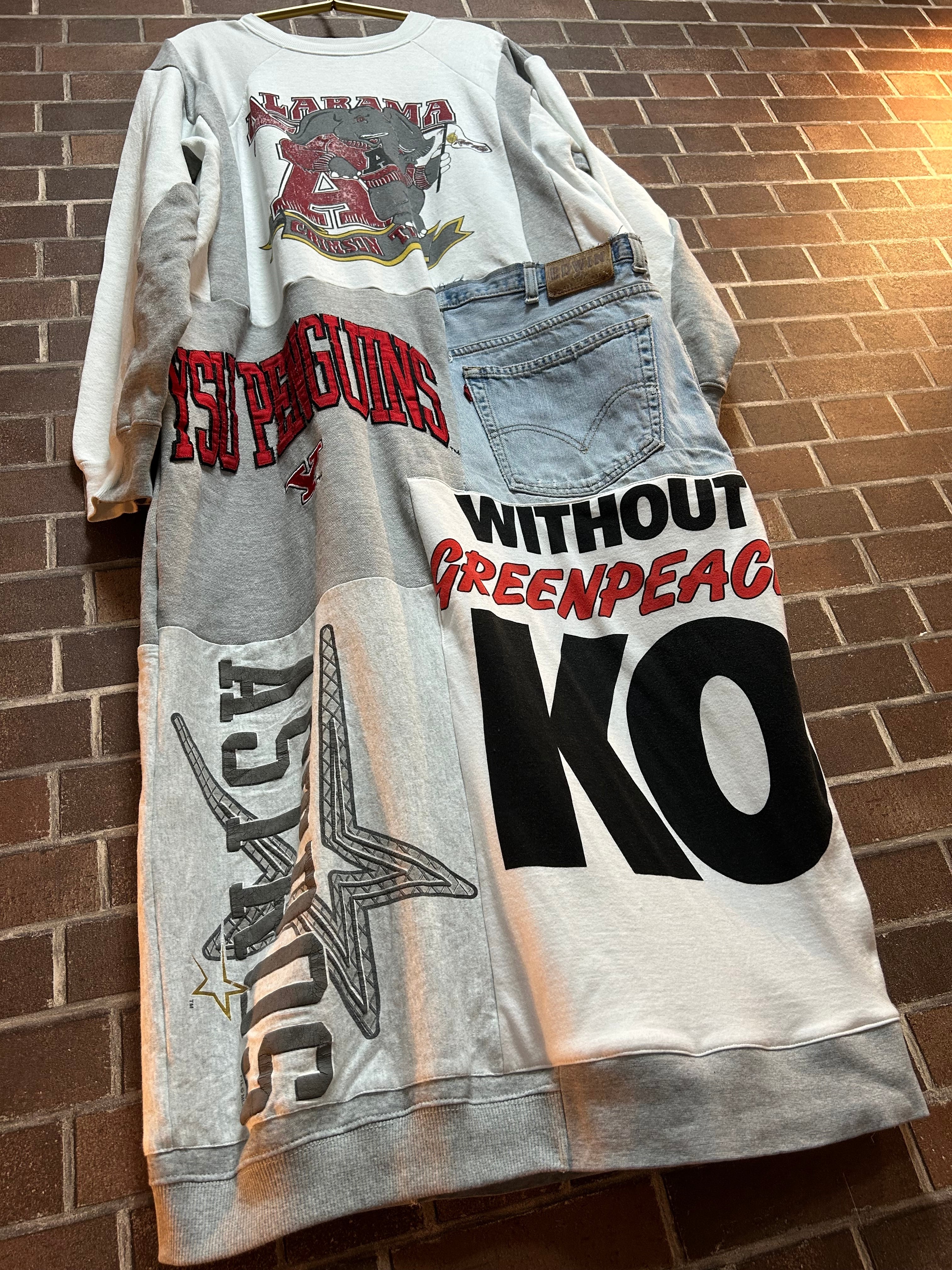ビンテージスエットや、古着のデニムを使用して制作したリメイクのパッチワークワンピースです⭐︎