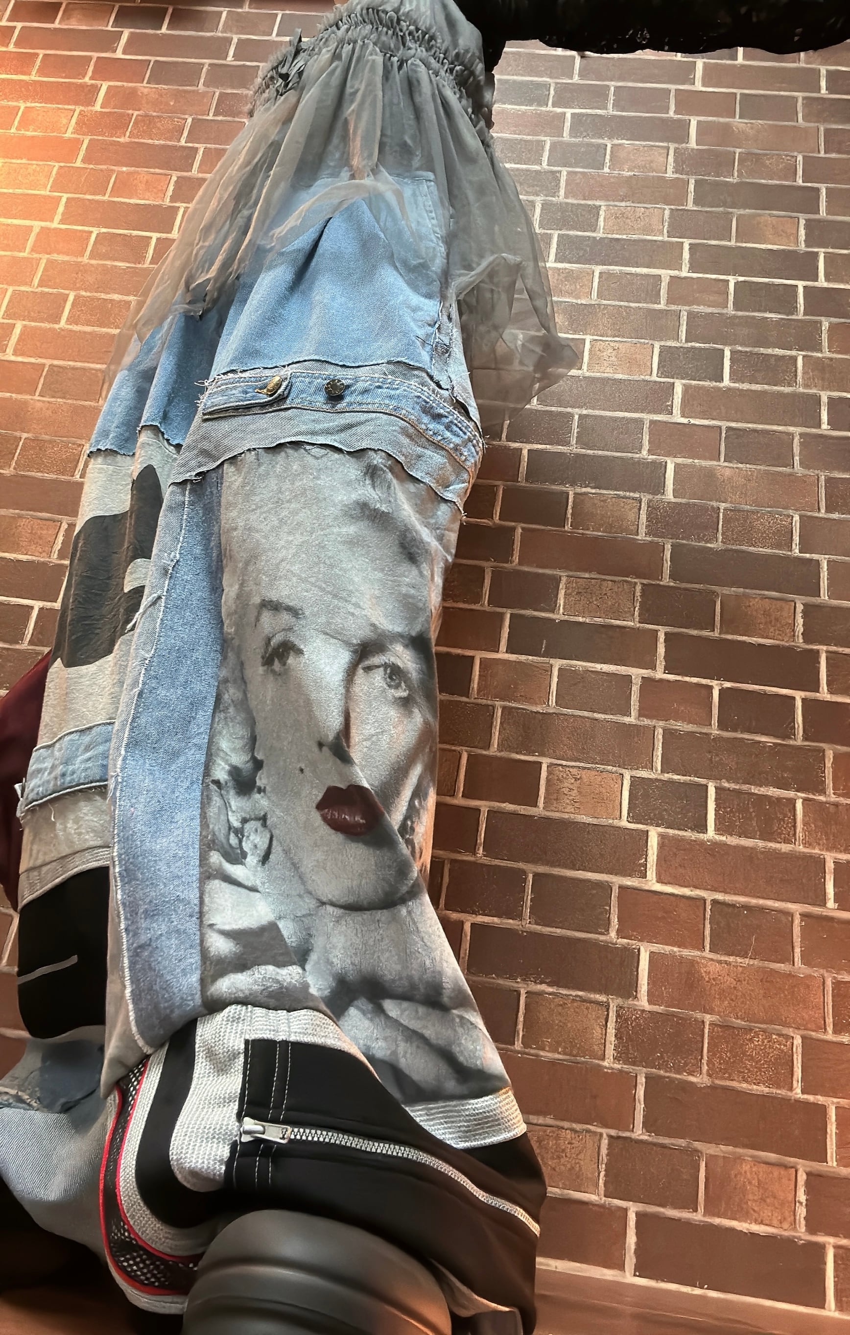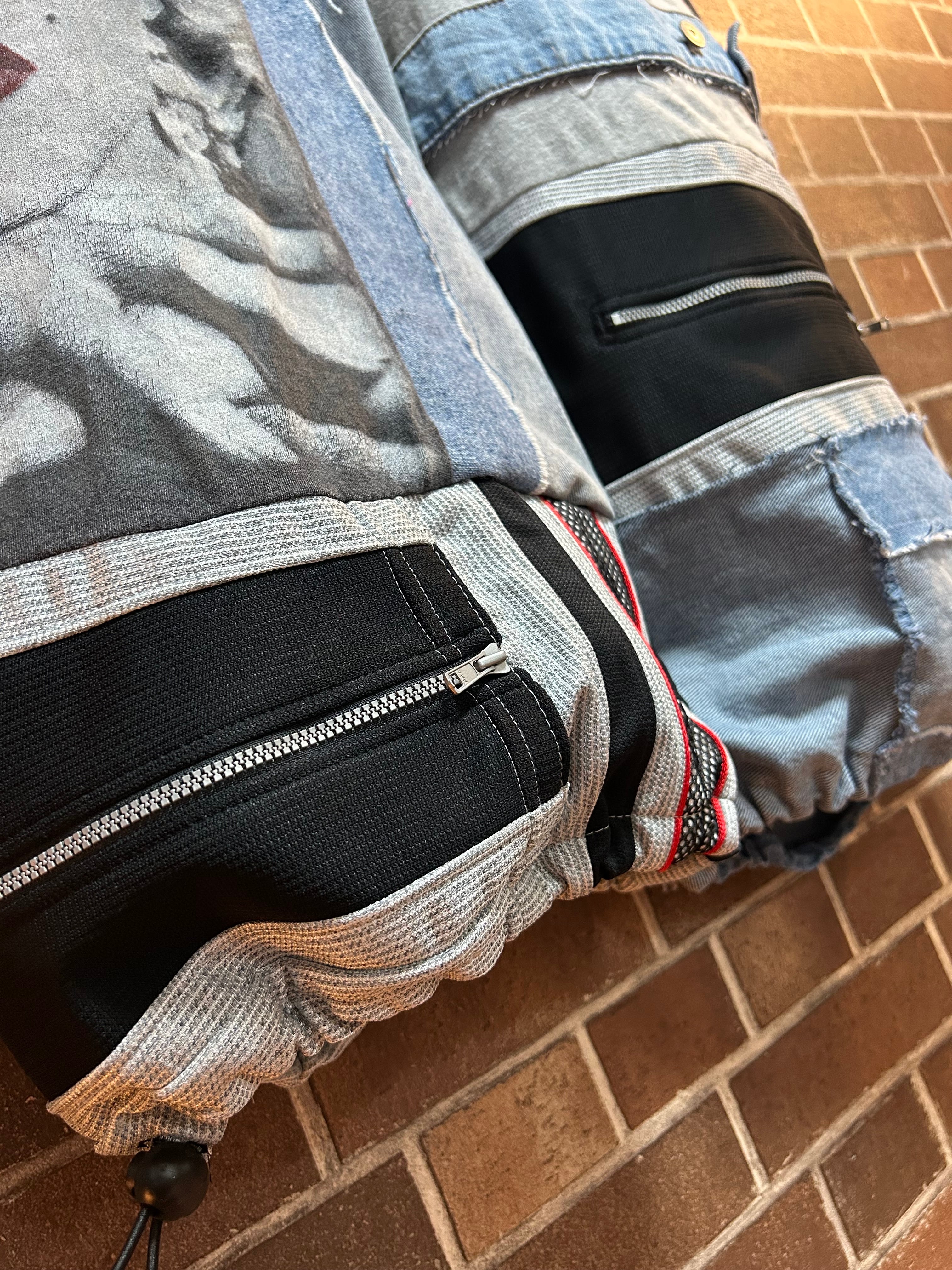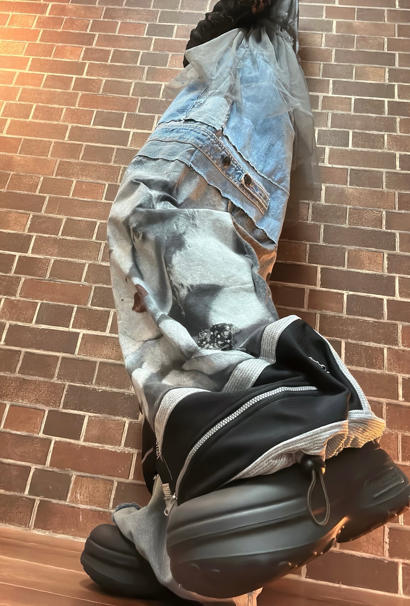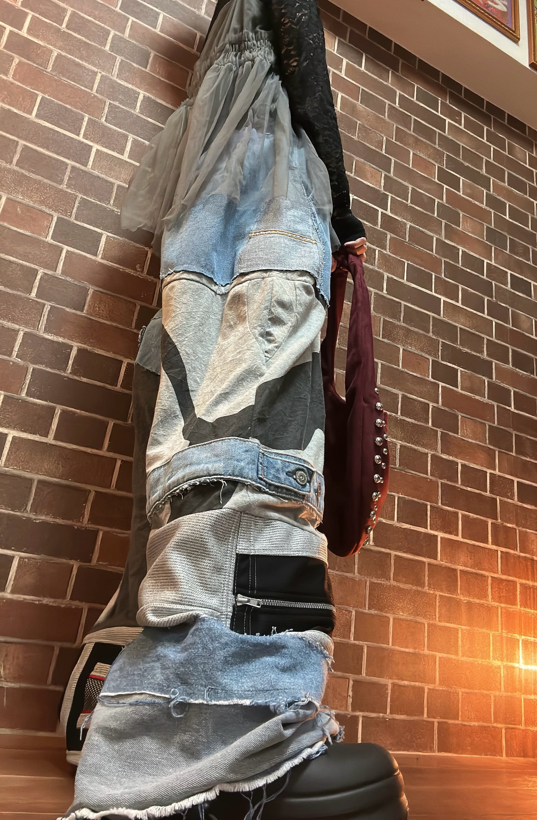 古着のTシャツやジャージ、デニムなど様々な素材を使用して制作したリメイクのパッチワークパンツです。