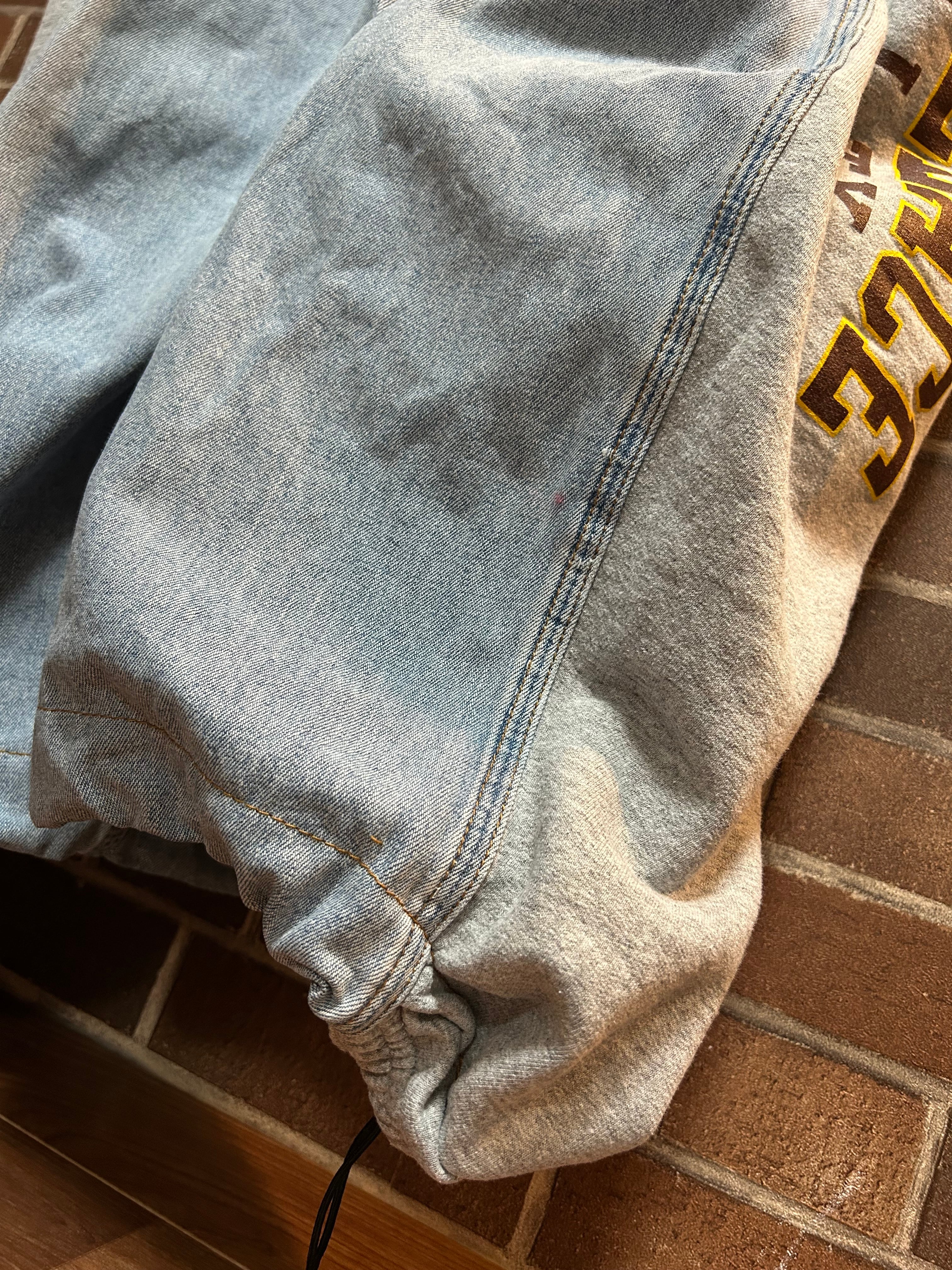 海外古着スエットとデニムを使用して制作したリメイクのオーバーオールです⭐︎